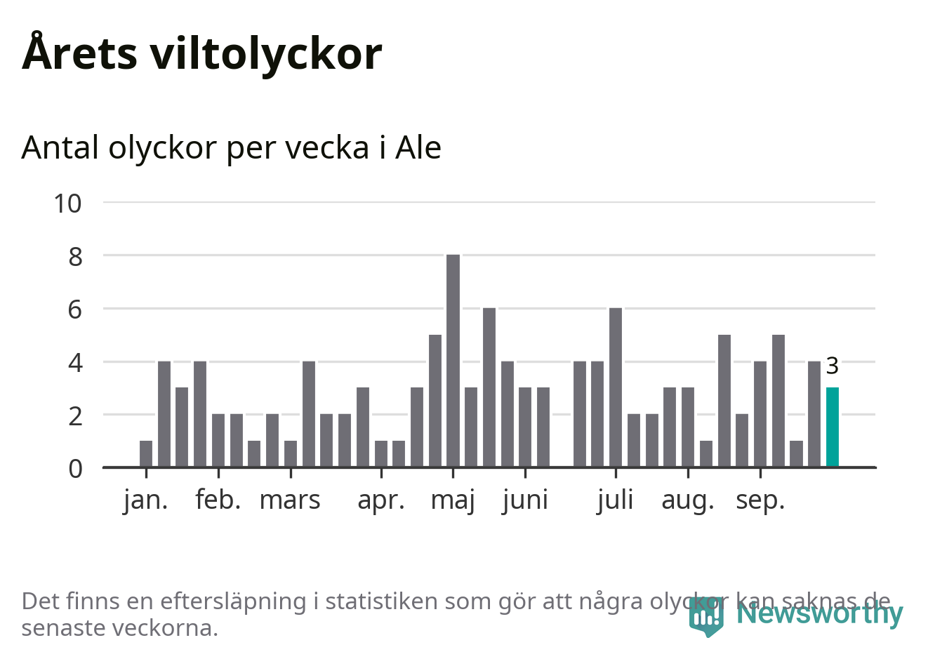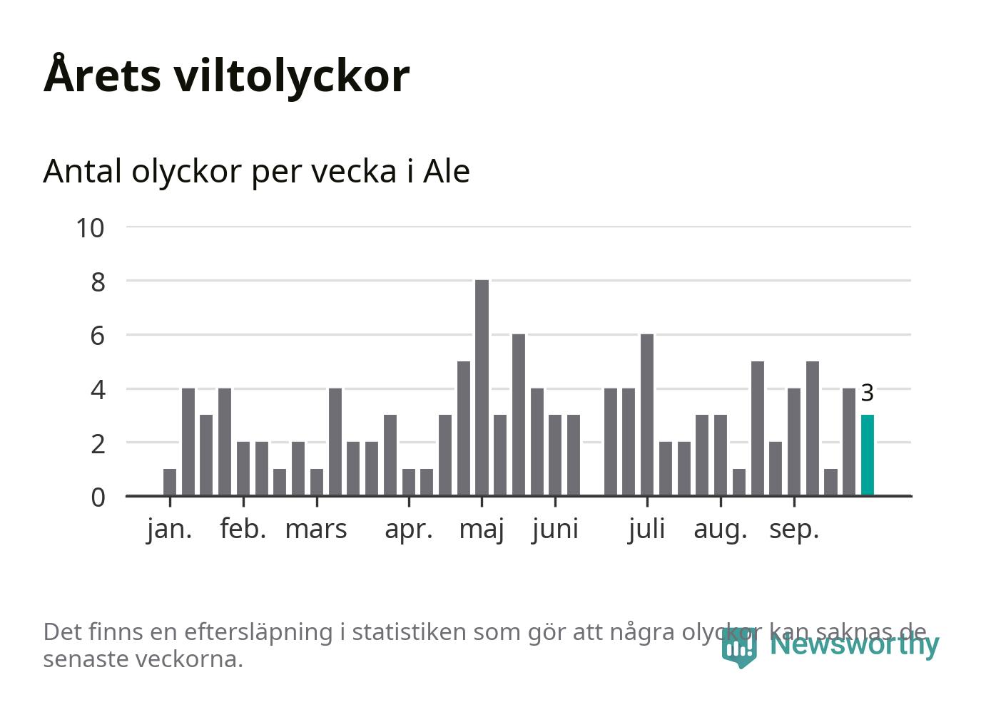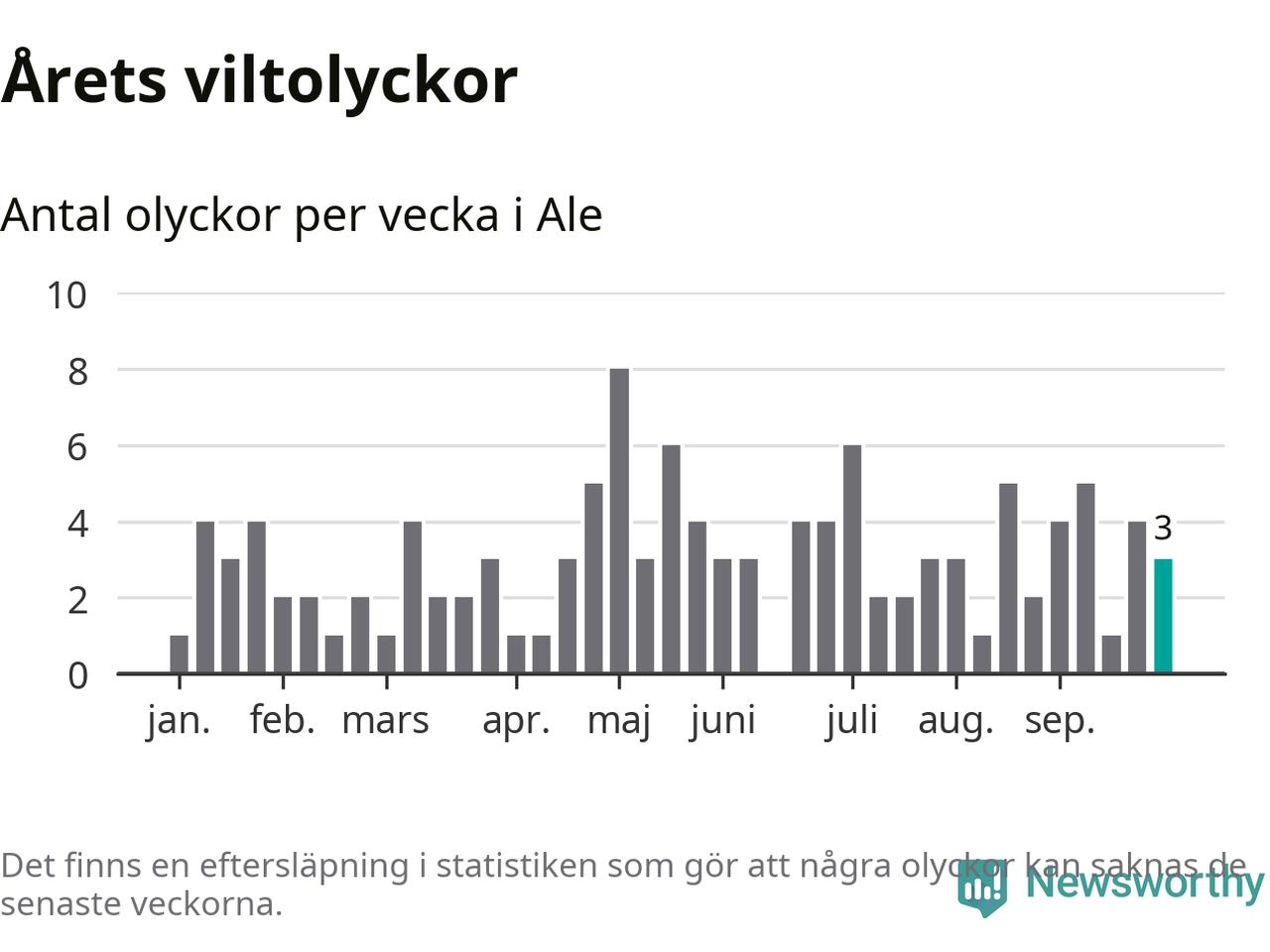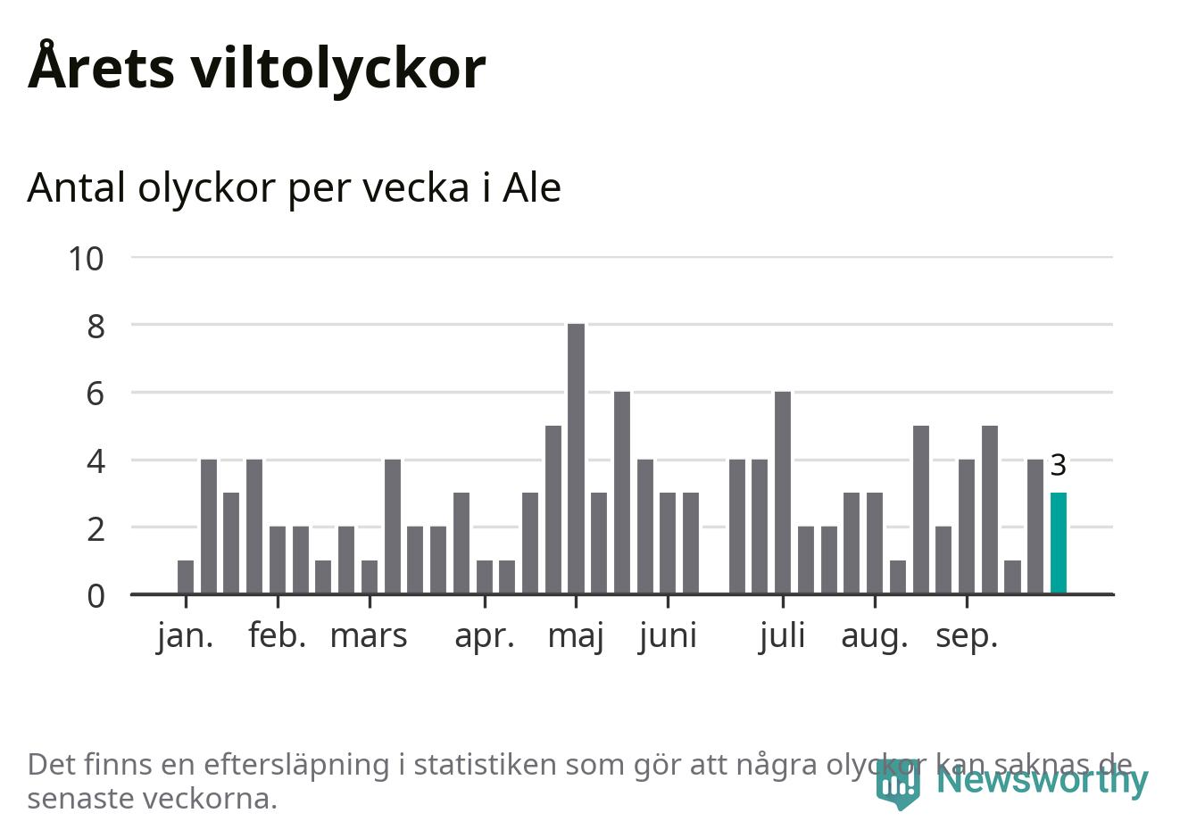 Hittills har tre viltolyckor rapporterats in i Ale kommun från vecka 40. Se listan här.