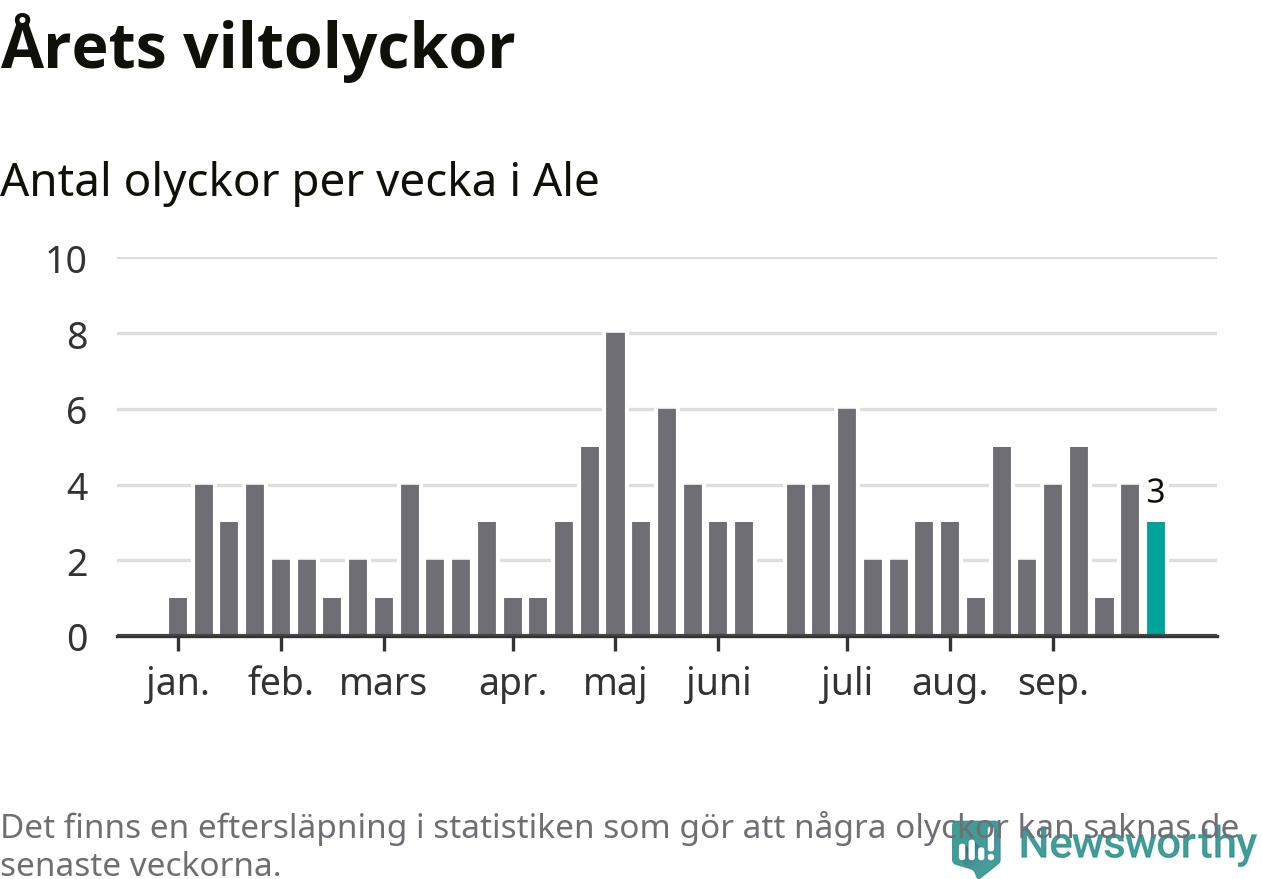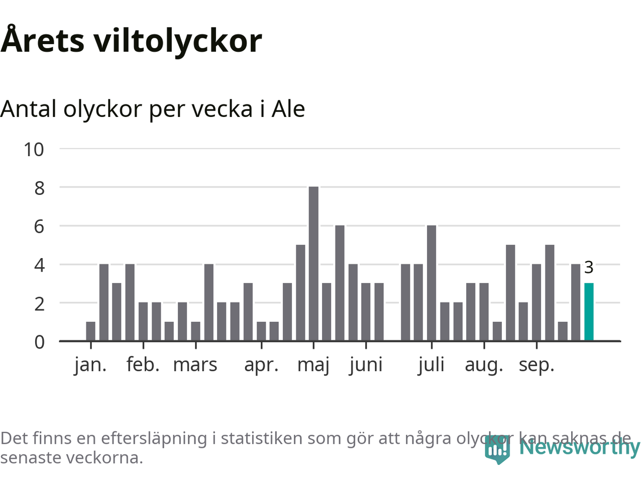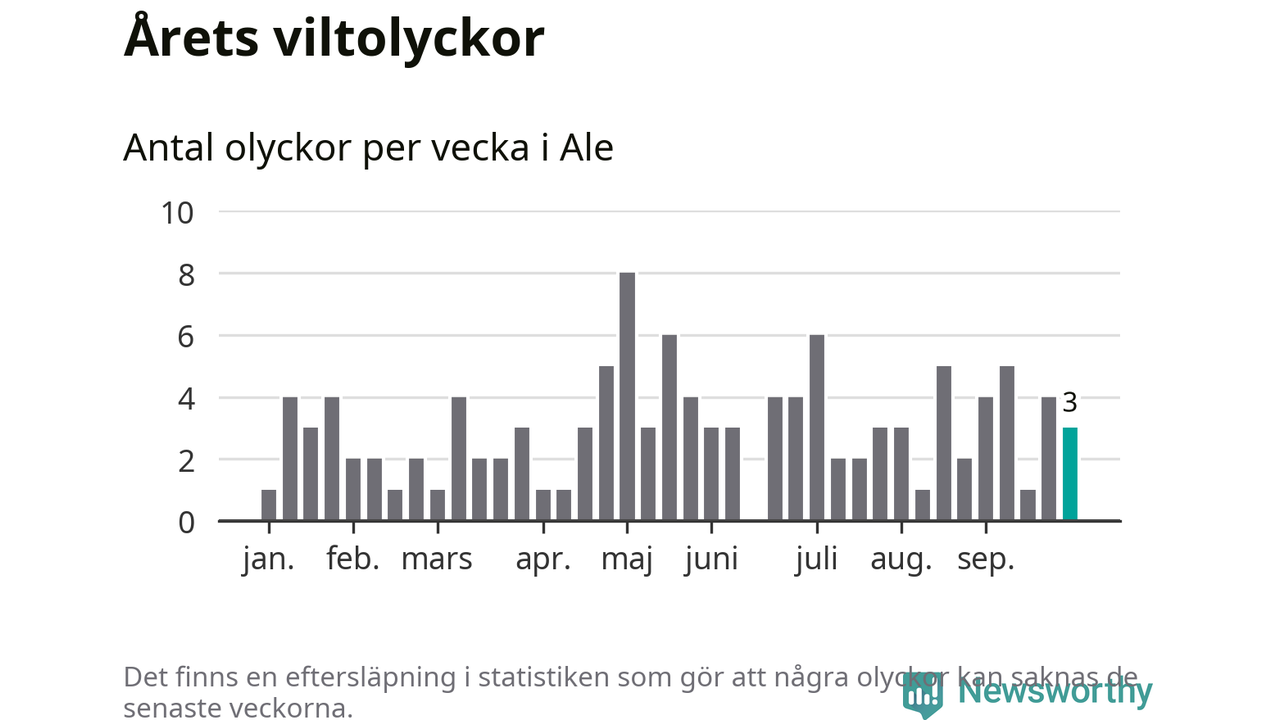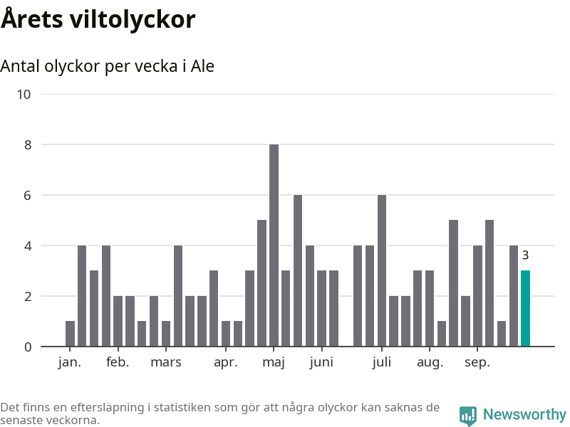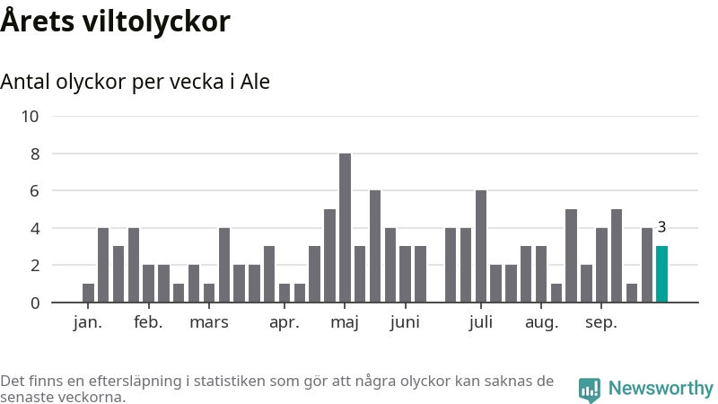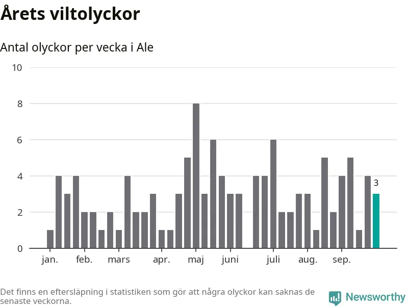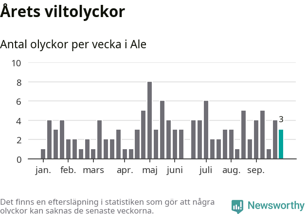 Hittills har tre viltolyckor rapporterats in i Ale kommun från vecka 40. Se listan här.