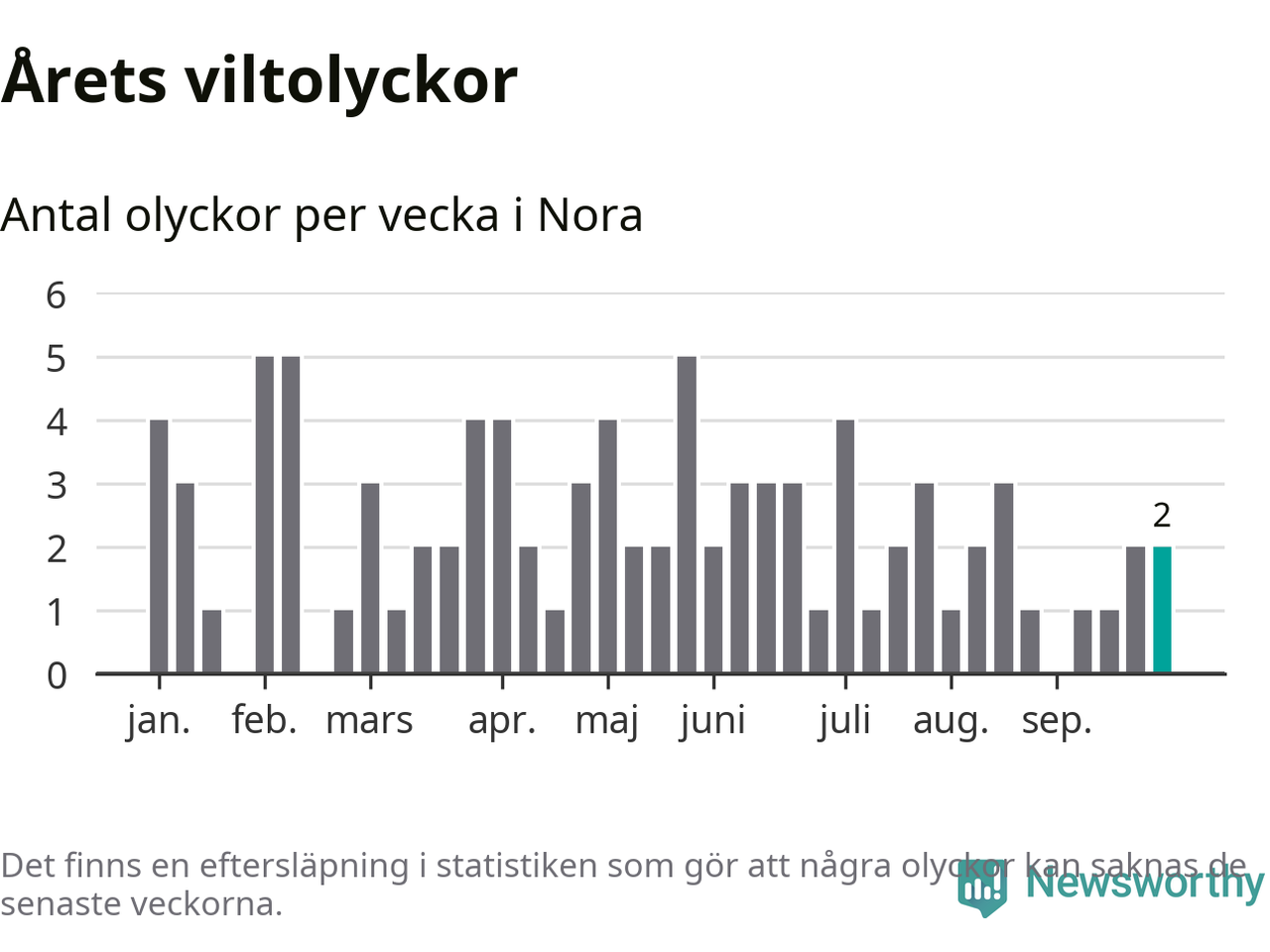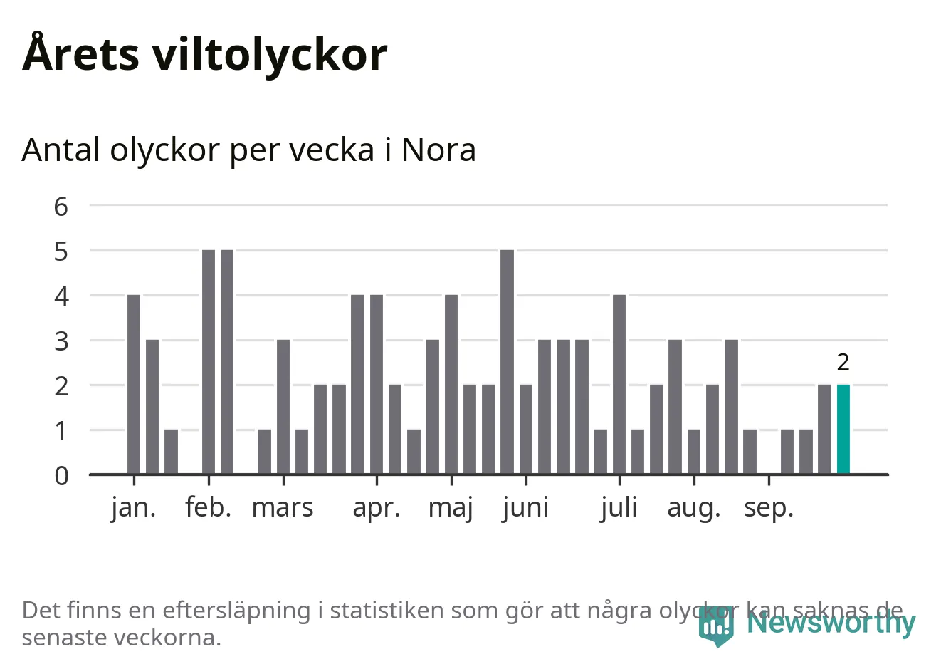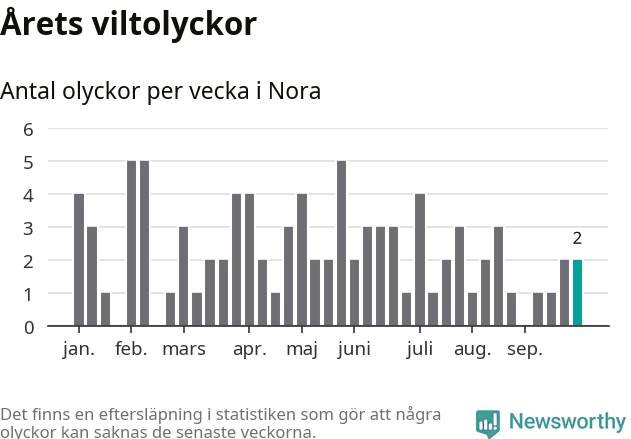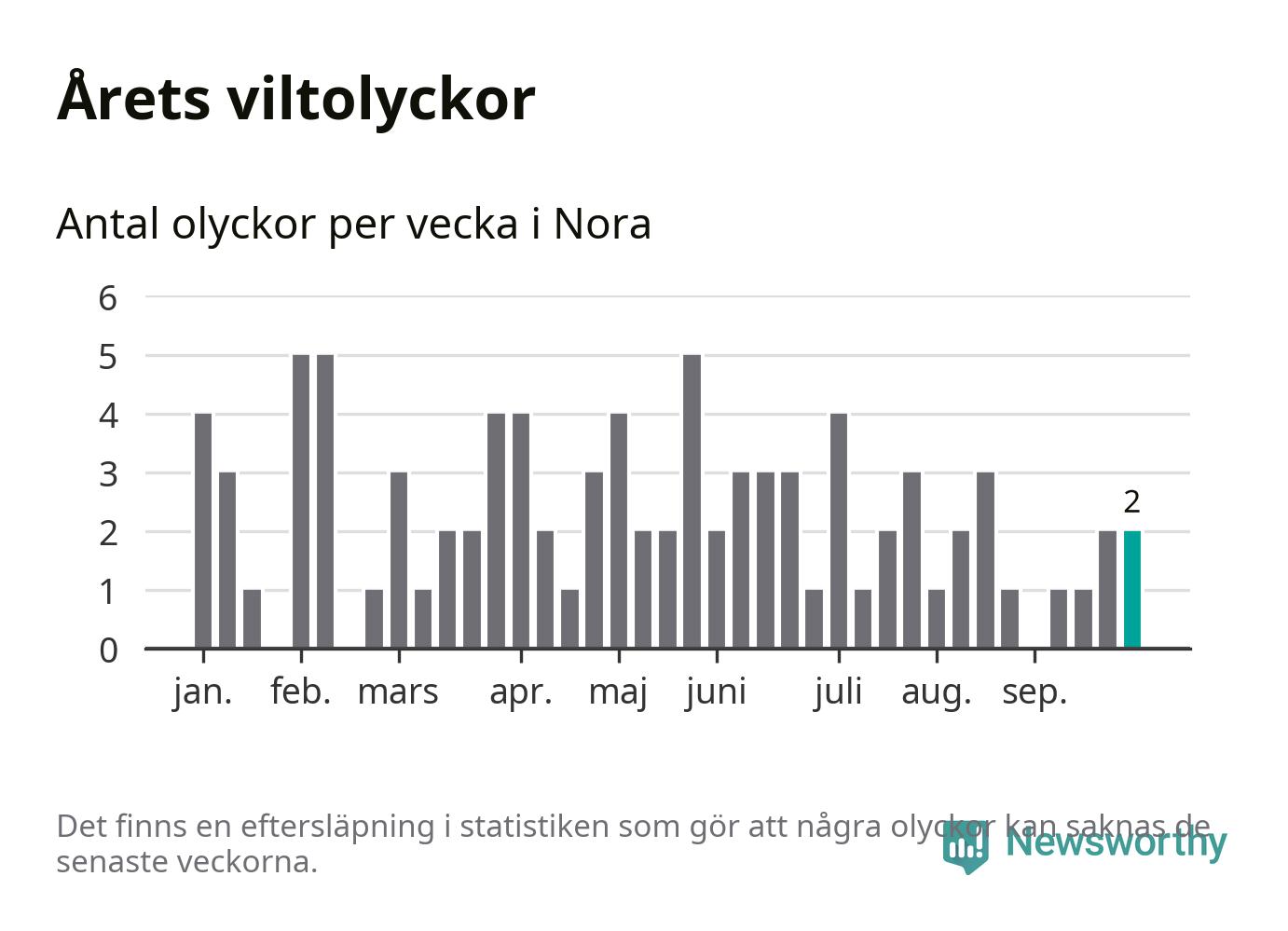 Hittills har två viltolyckor rapporterats in i Nora kommun från vecka 40. Se listan här.