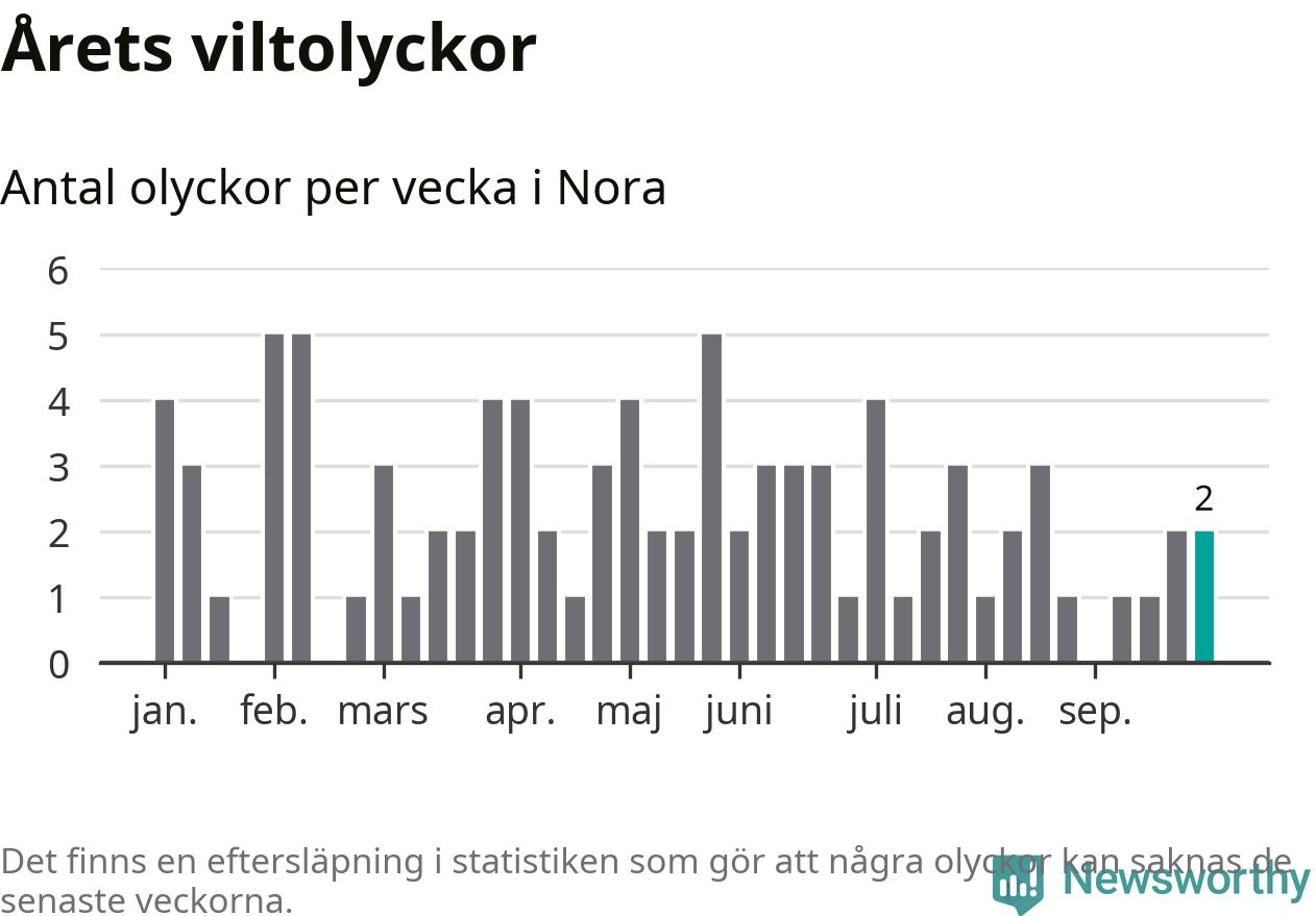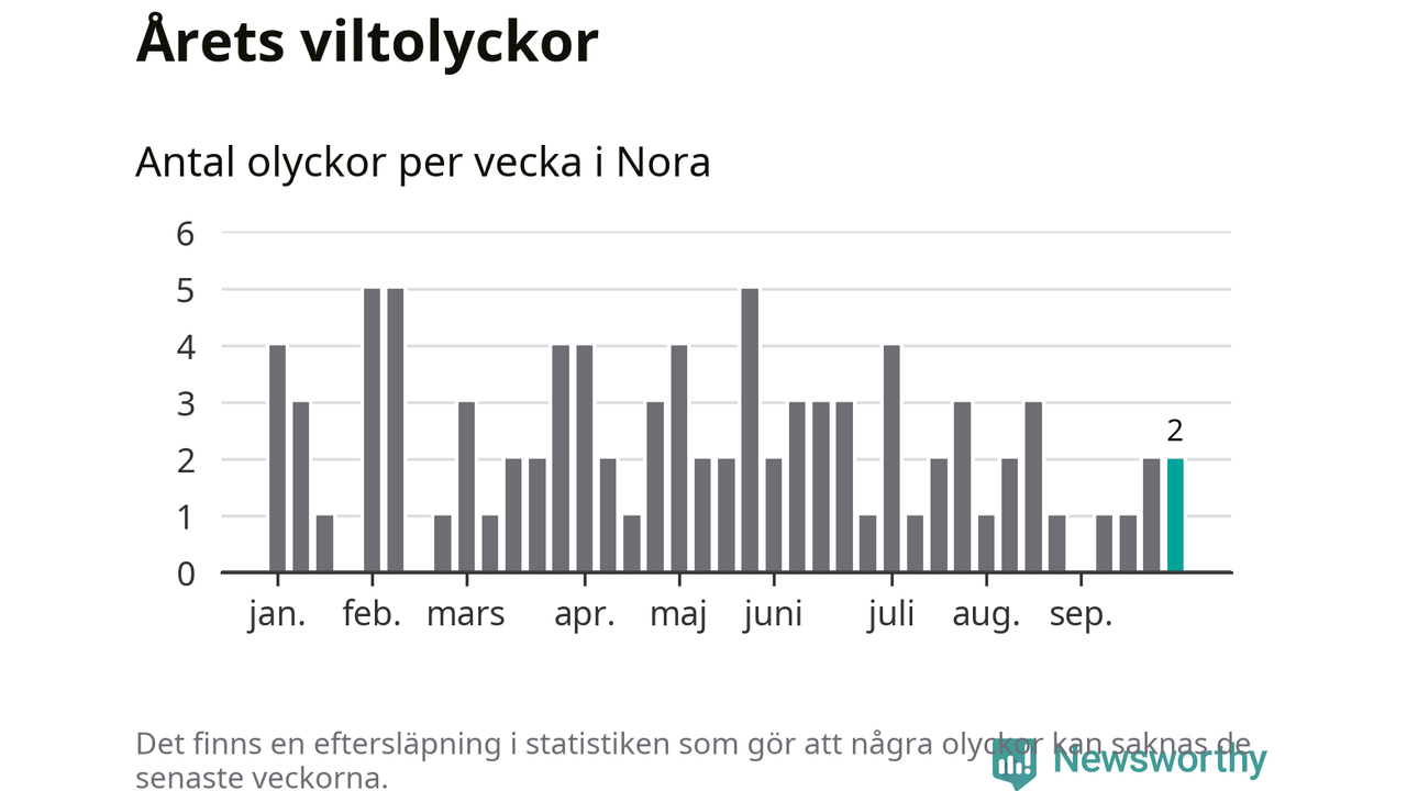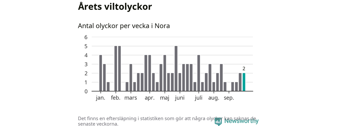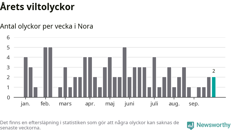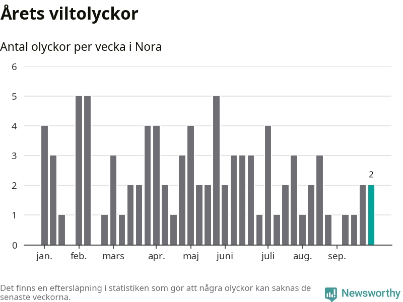Hittills har två viltolyckor rapporterats in i Nora kommun från vecka 40. Se listan här.