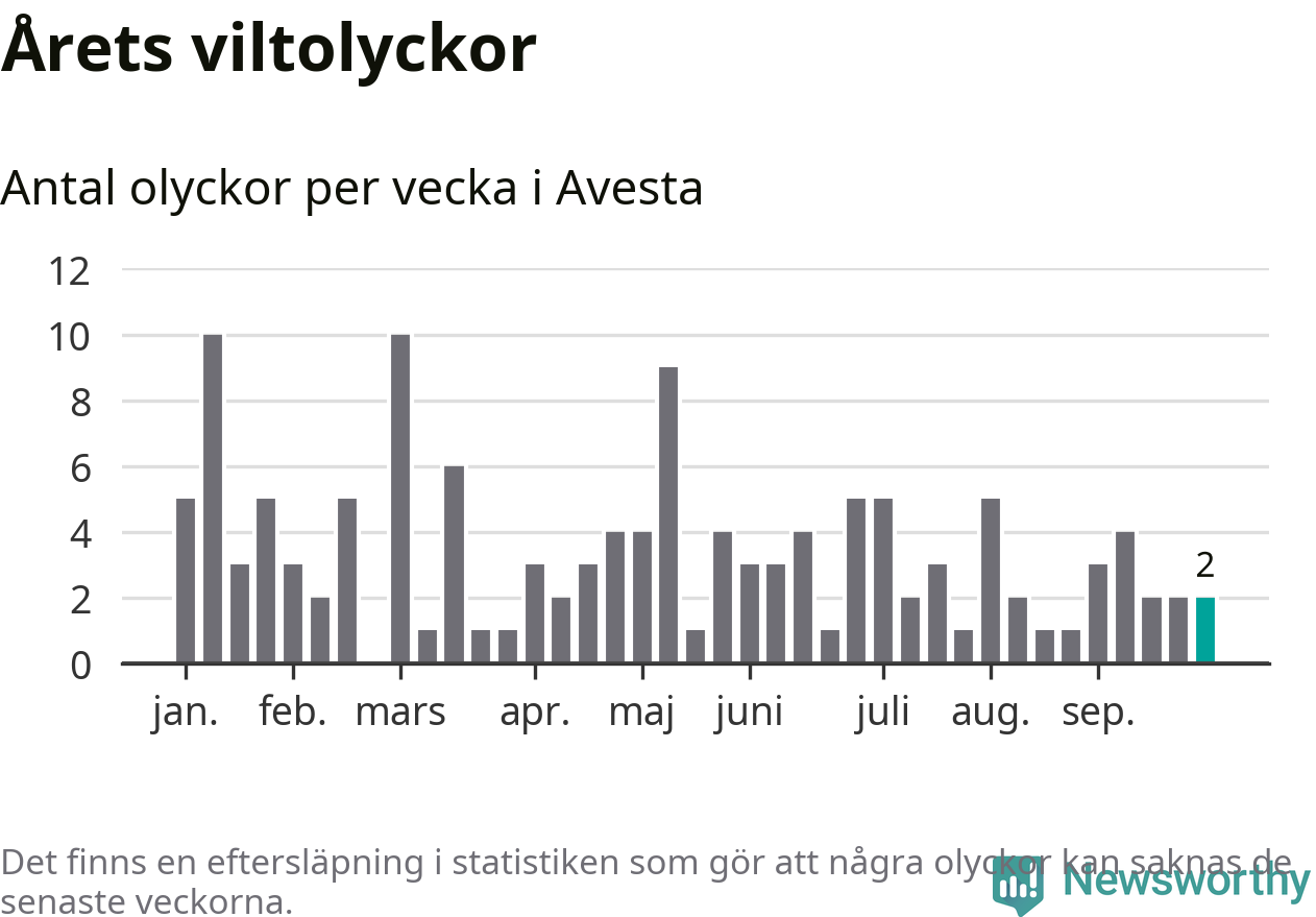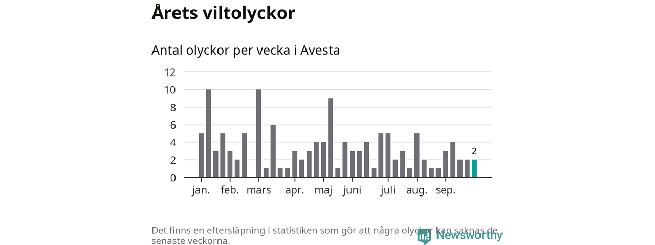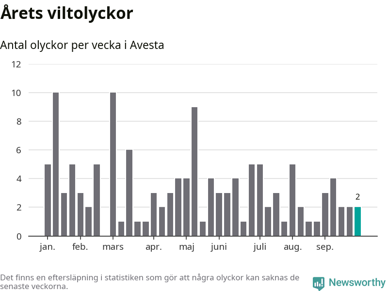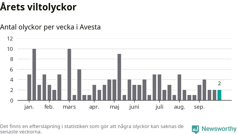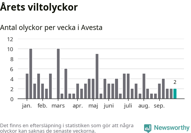 Hittills har två viltolyckor rapporterats in i Avesta kommun från vecka 40. Se listan här.