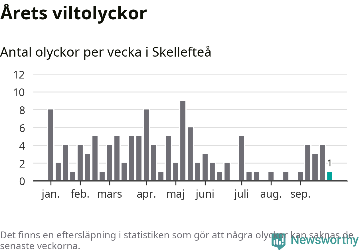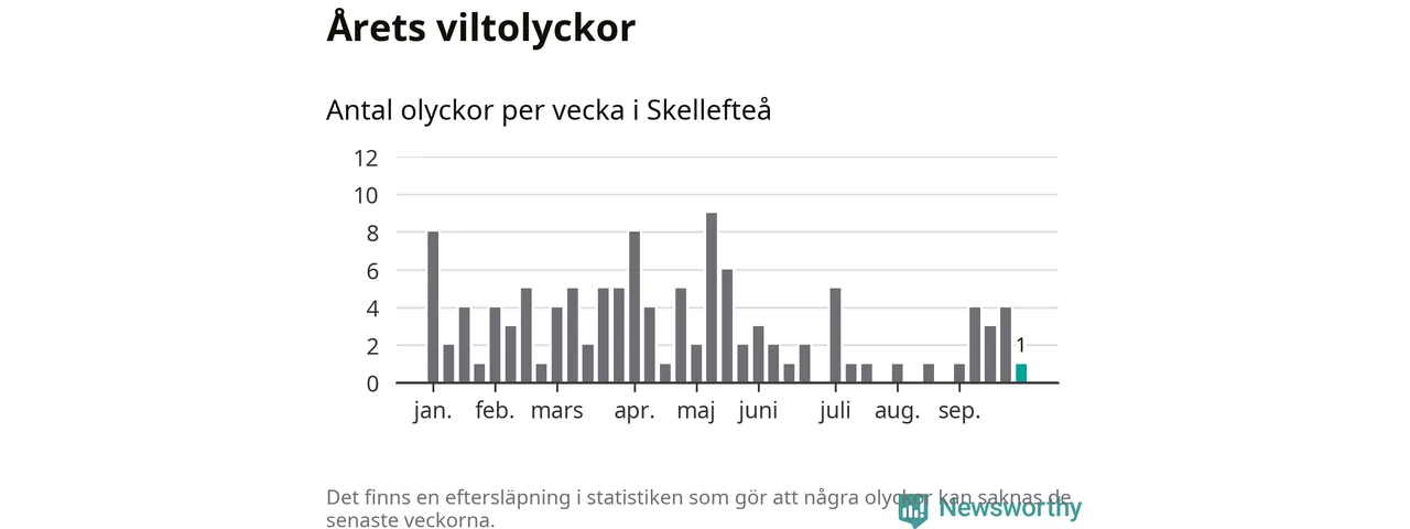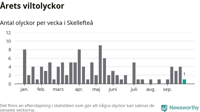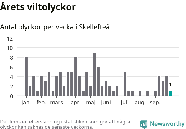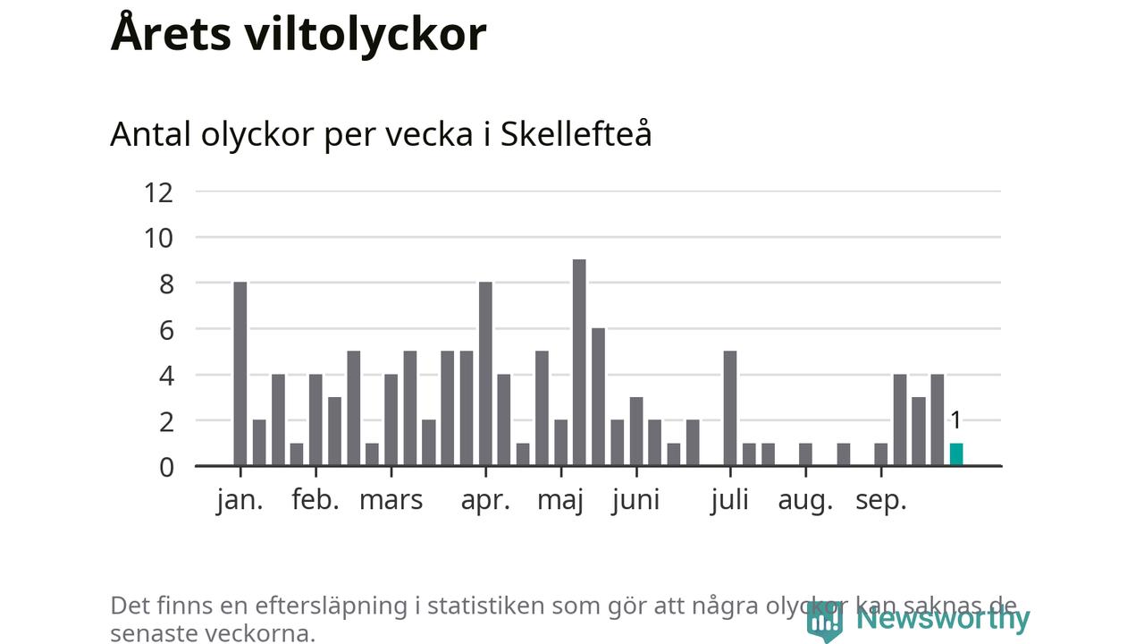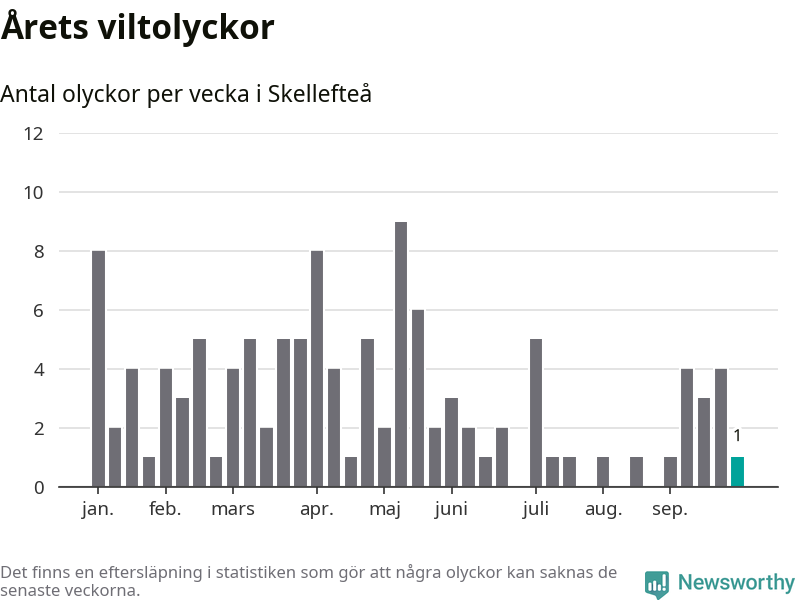 Från förra veckan (vecka 40) har hittills en viltolycka rapporterats in i Skellefteå kommun.