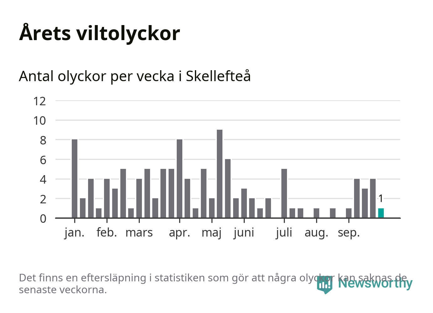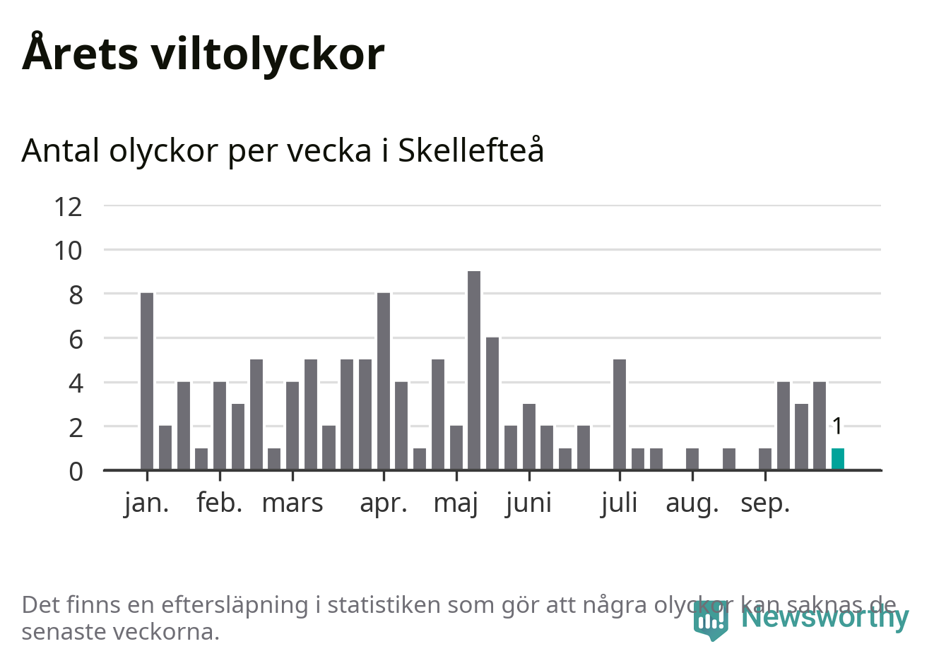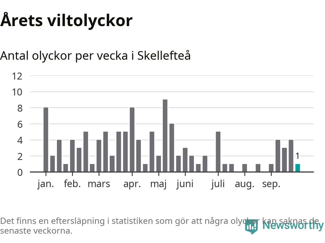 Från förra veckan (vecka 40) har hittills en viltolycka rapporterats in i Skellefteå kommun.