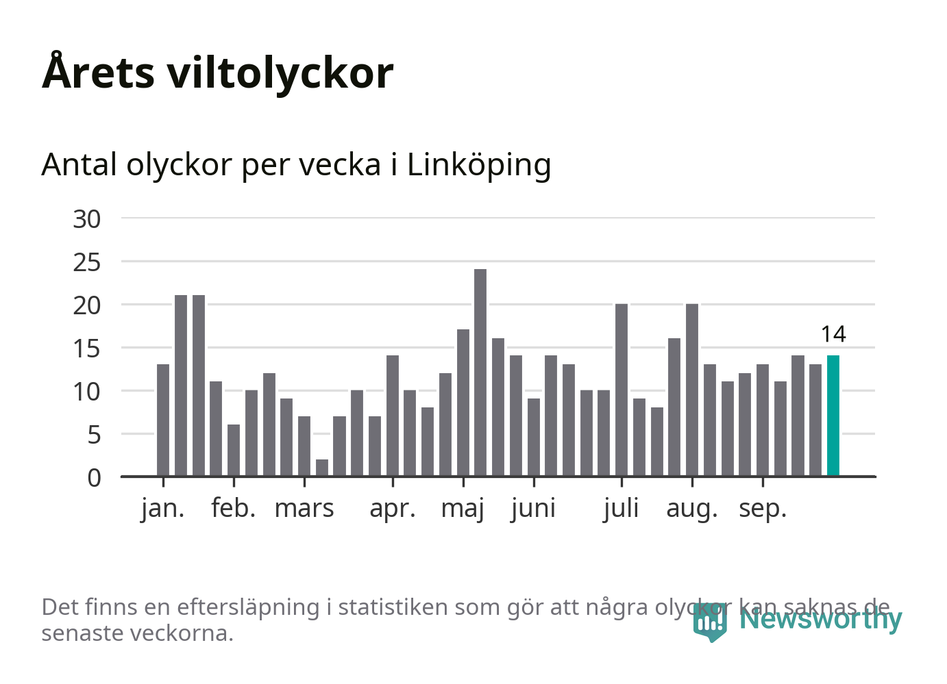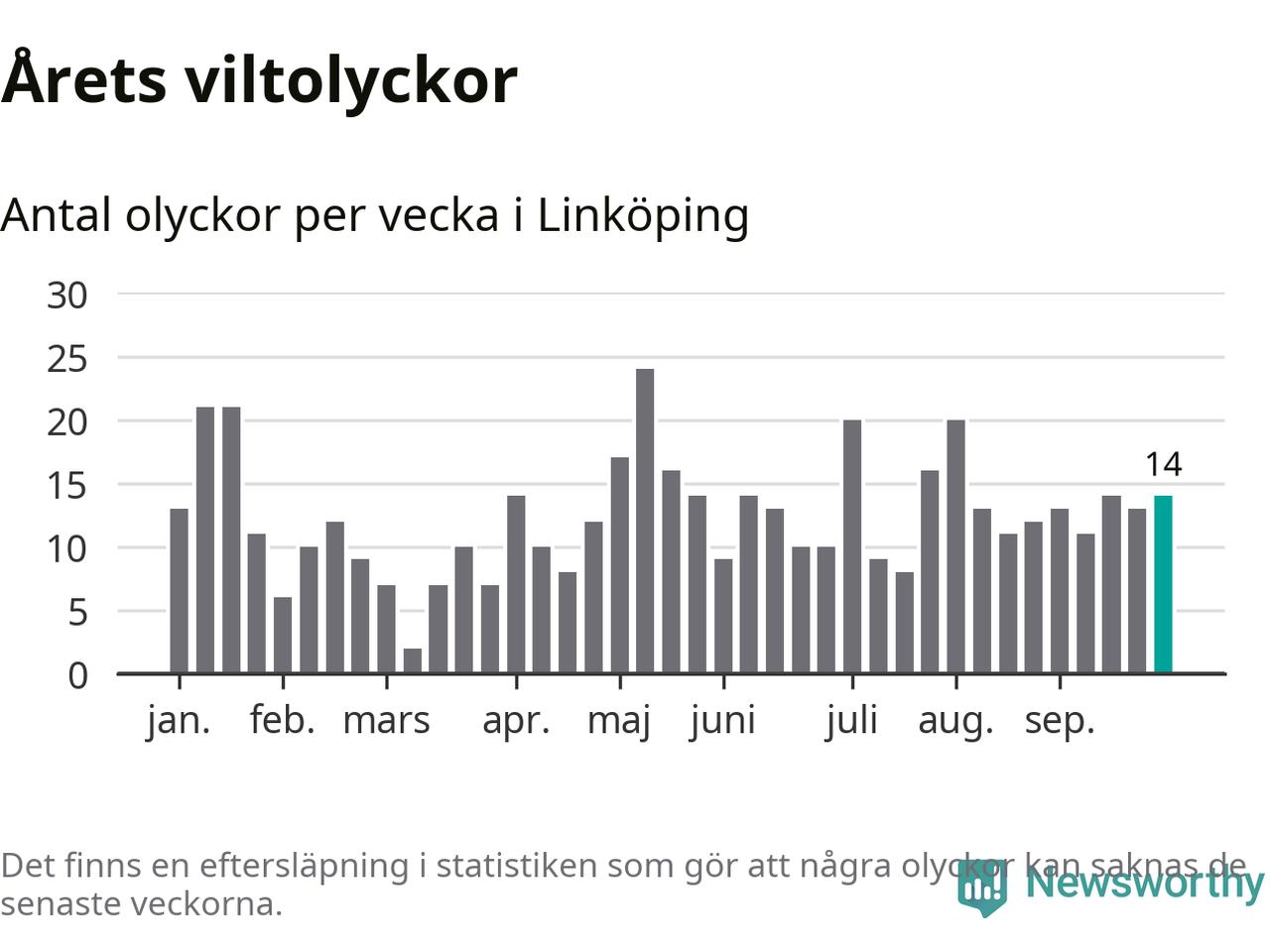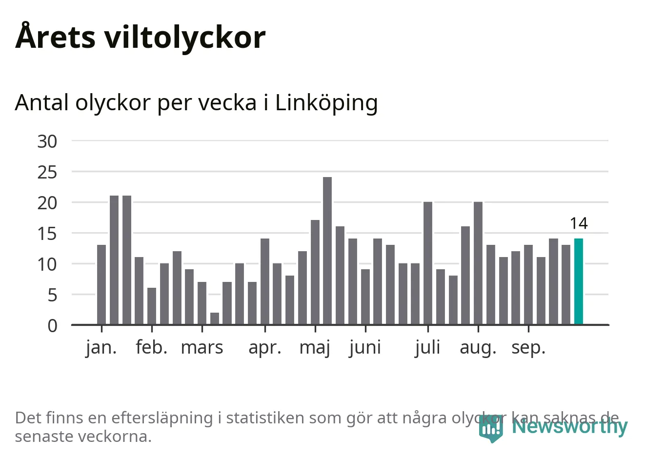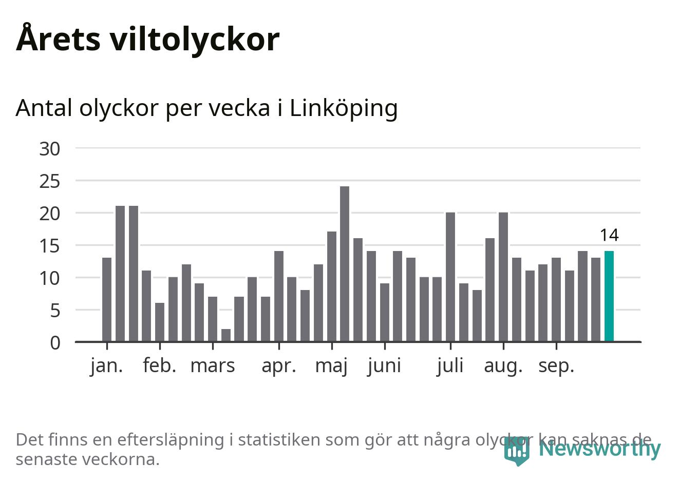 Hittills har 14 viltolyckor rapporterats in i Linköpings kommun från vecka 40. Se listan här.