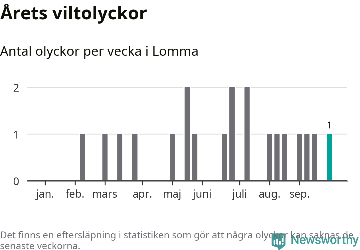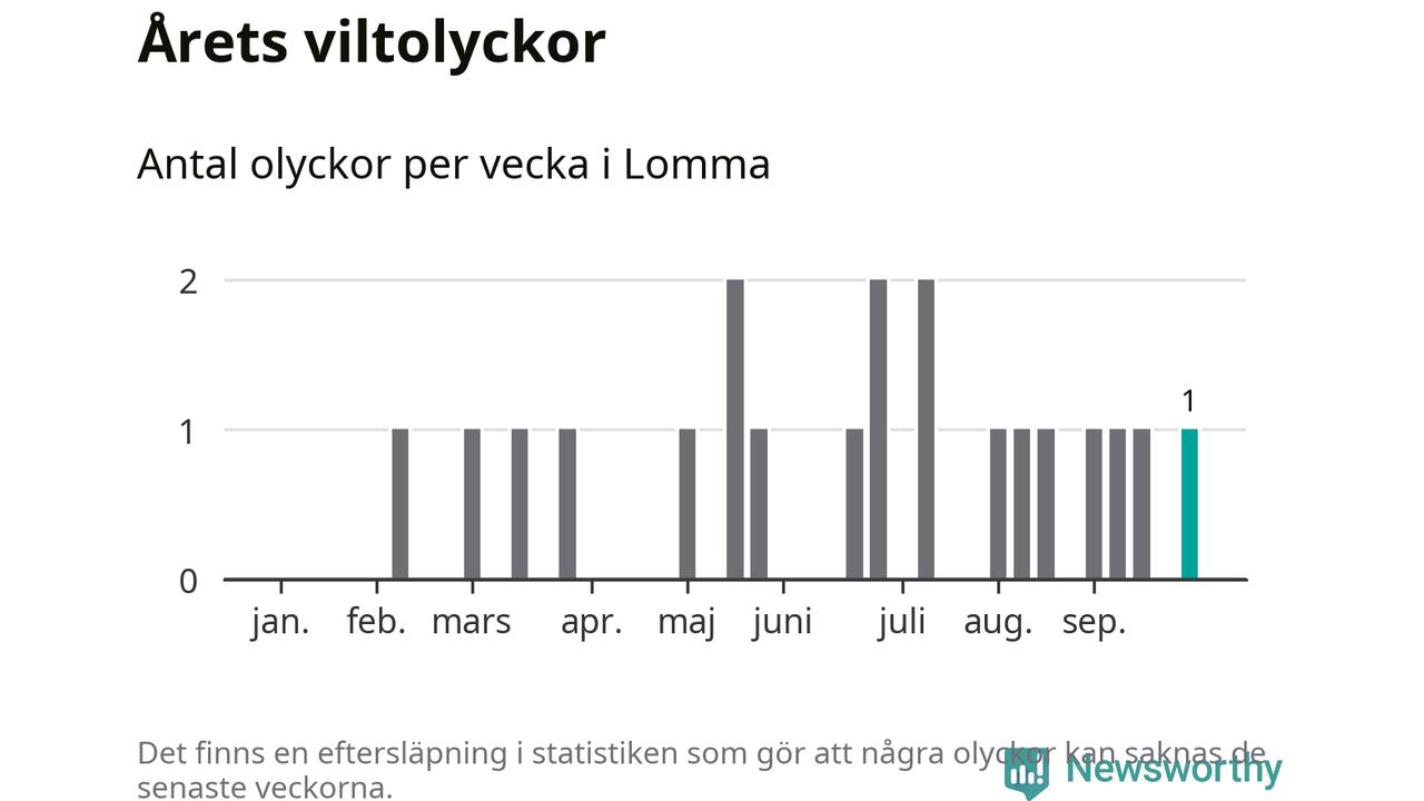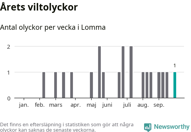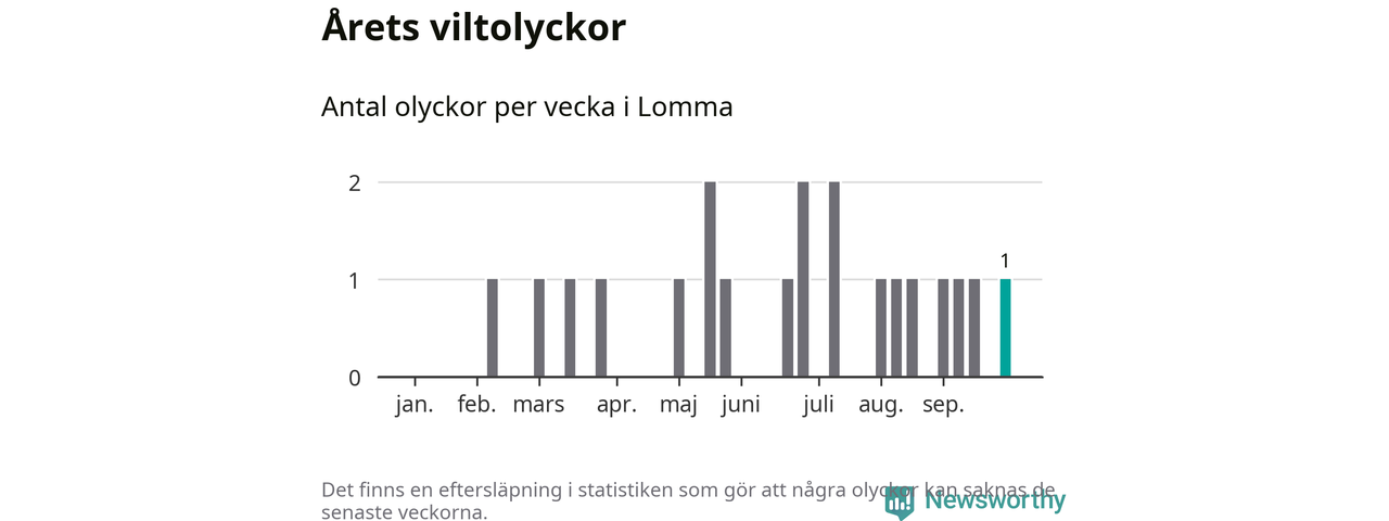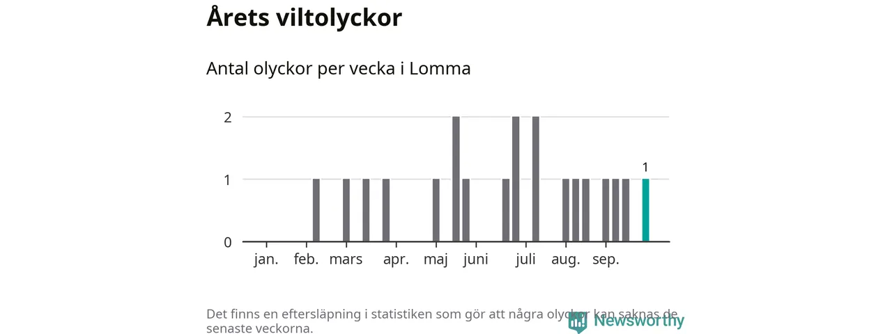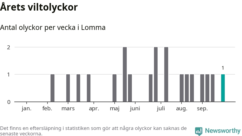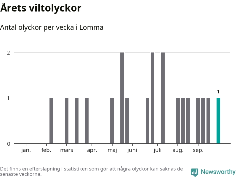Från förra veckan (vecka 40) har hittills en viltolycka rapporterats in i Lomma kommun.
