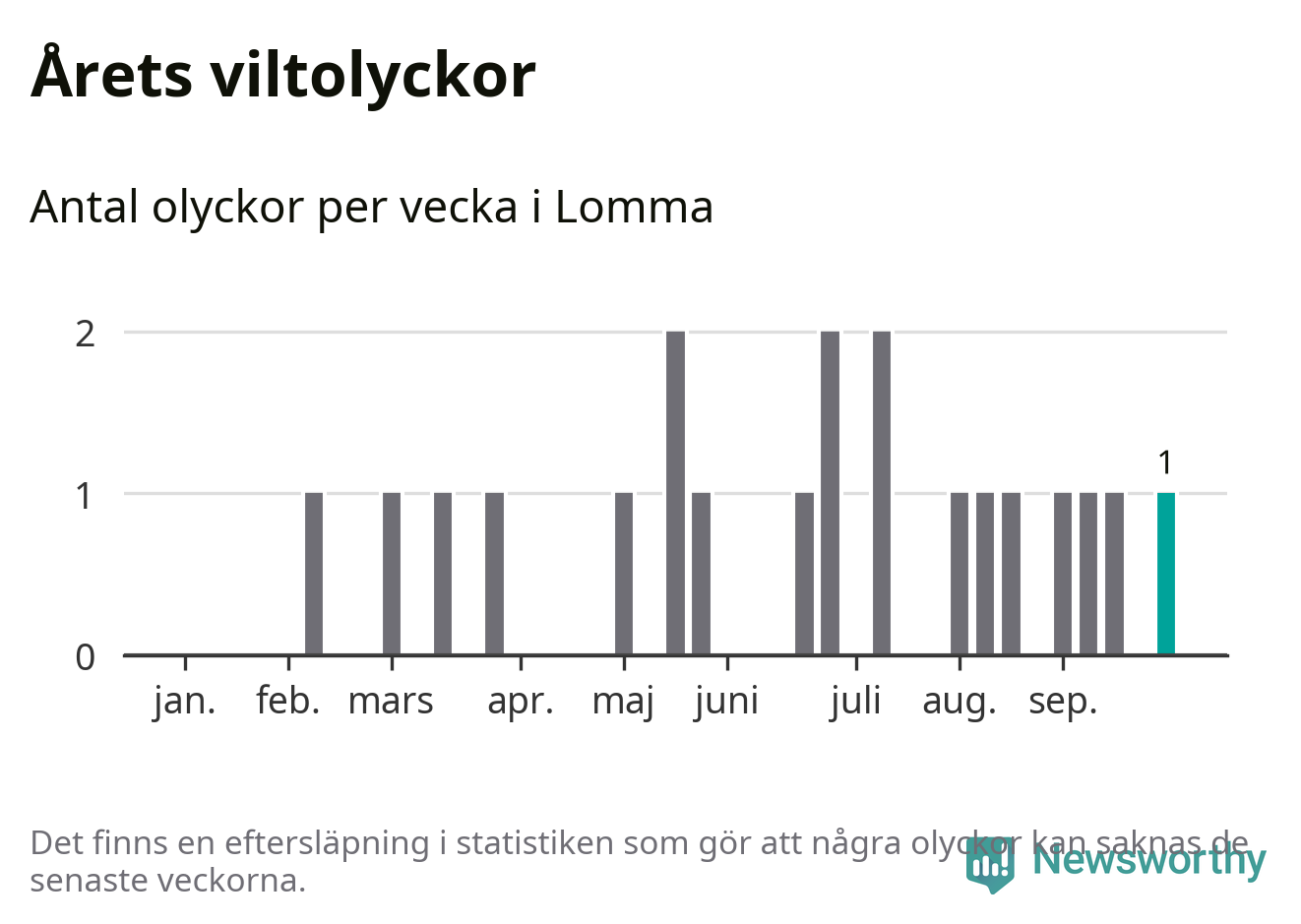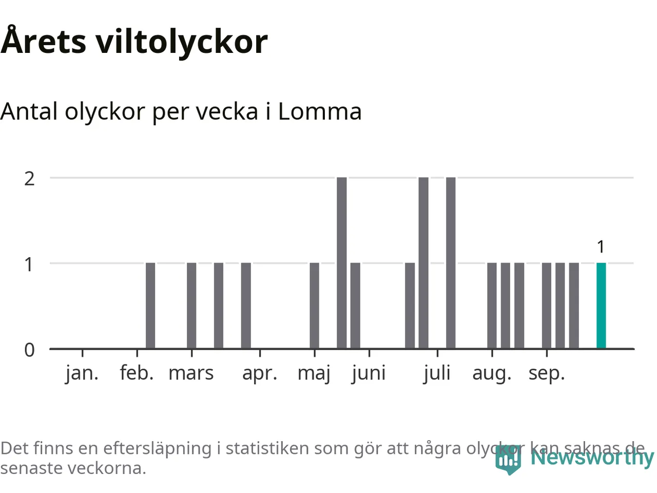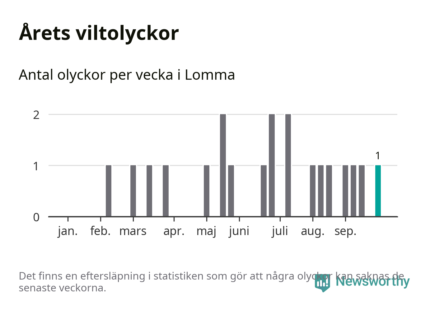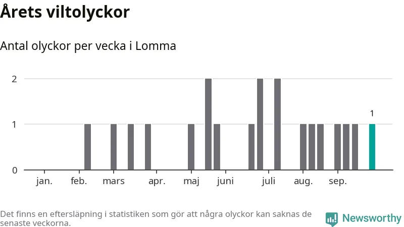 Totalt det här året har det inträffat 21 viltolyckor i kommunen. Det är mindre än genomsnittet för motsvarande period (omkring 27) de senaste tio åren.