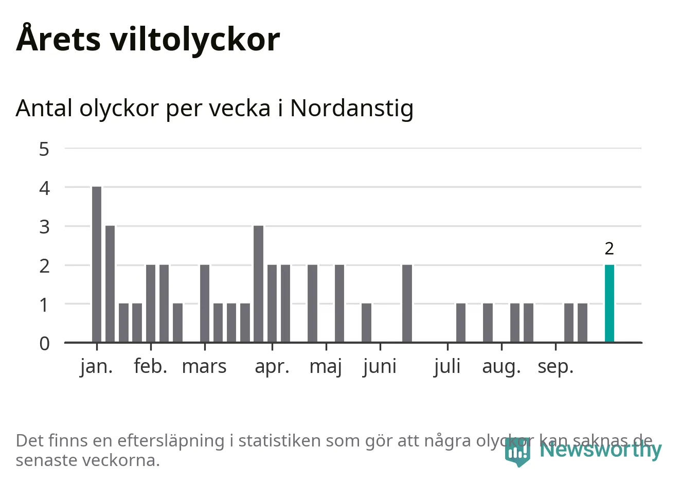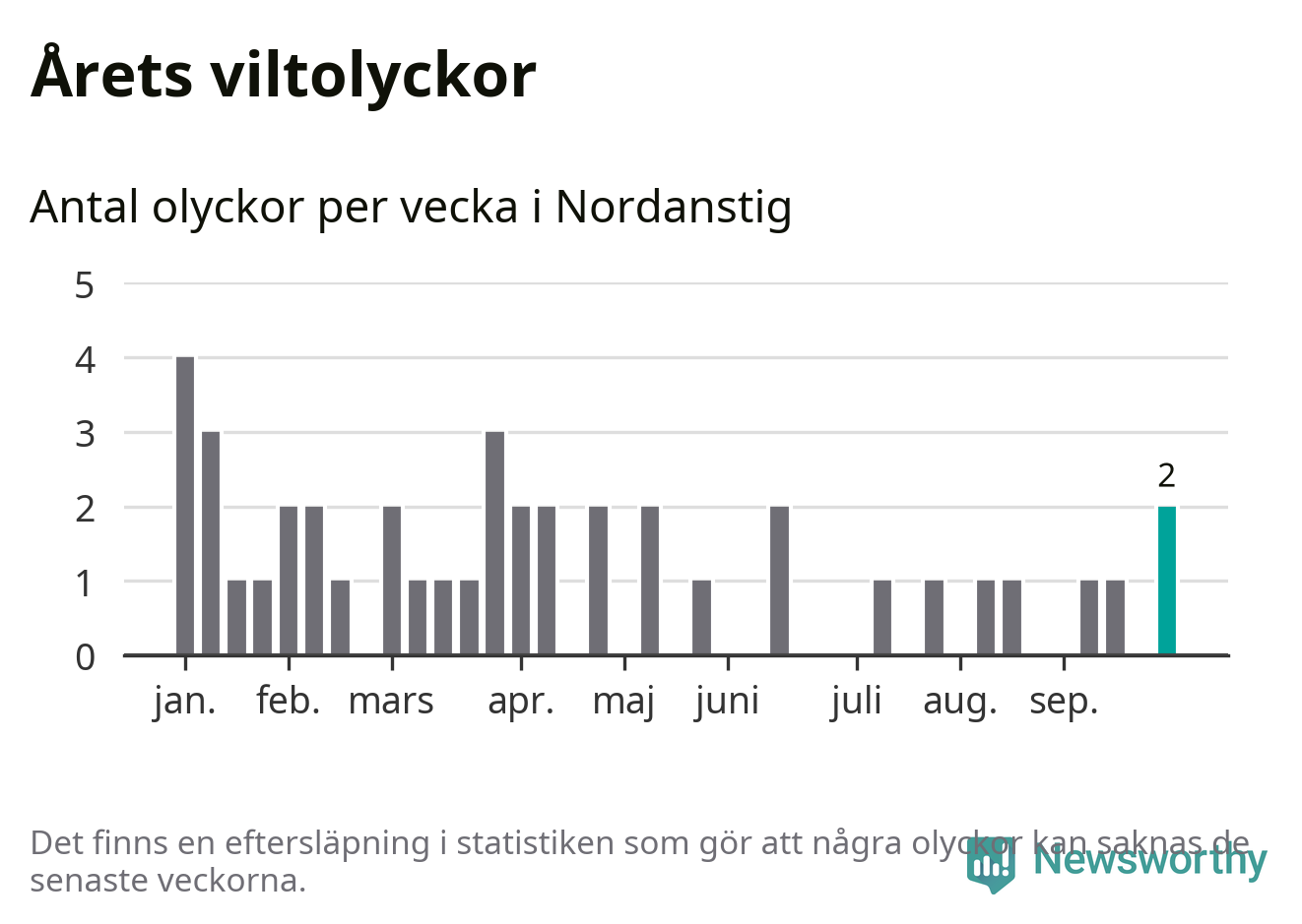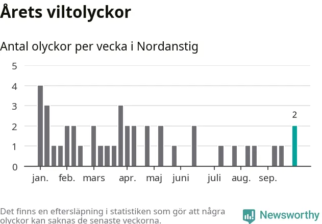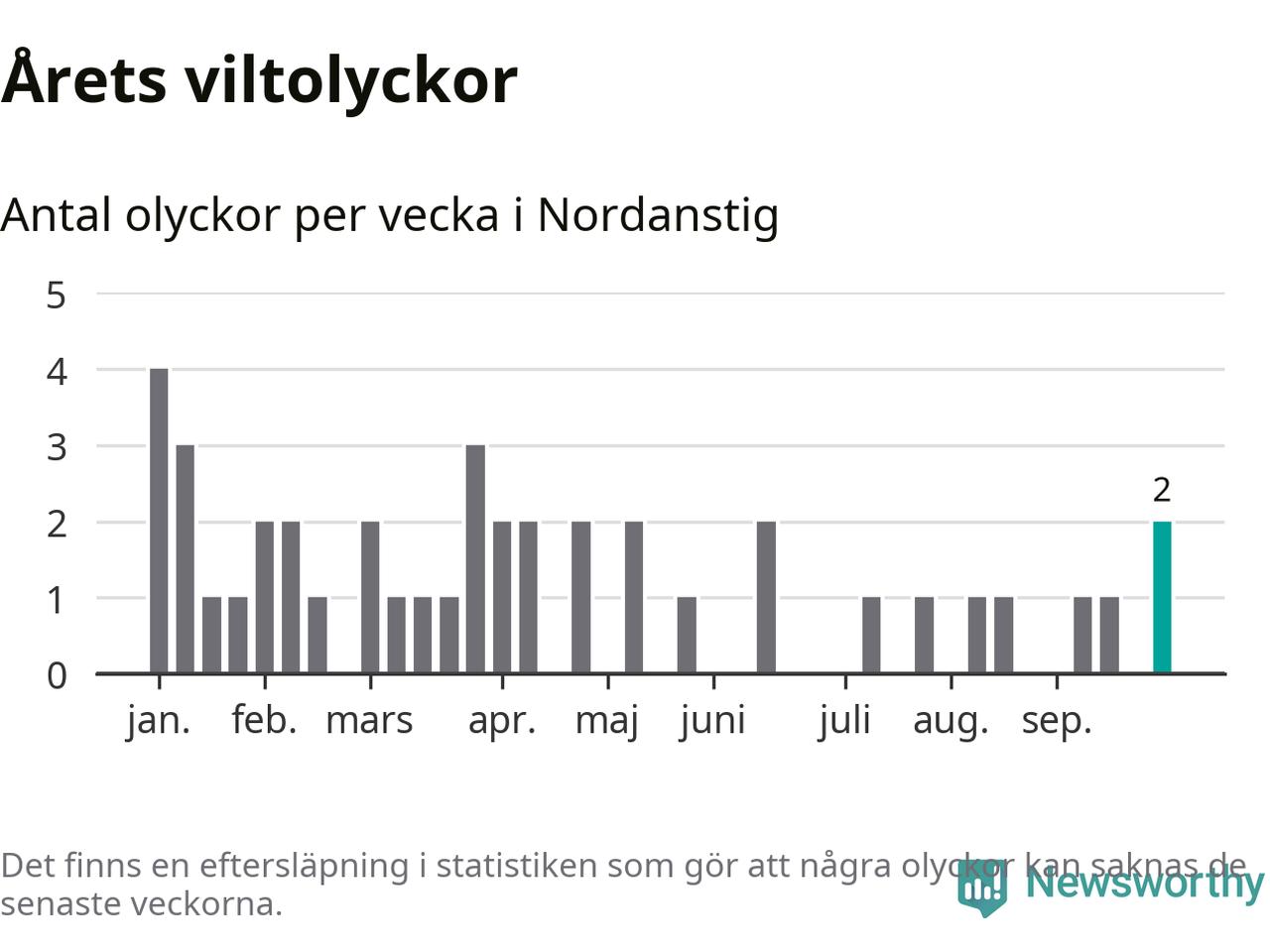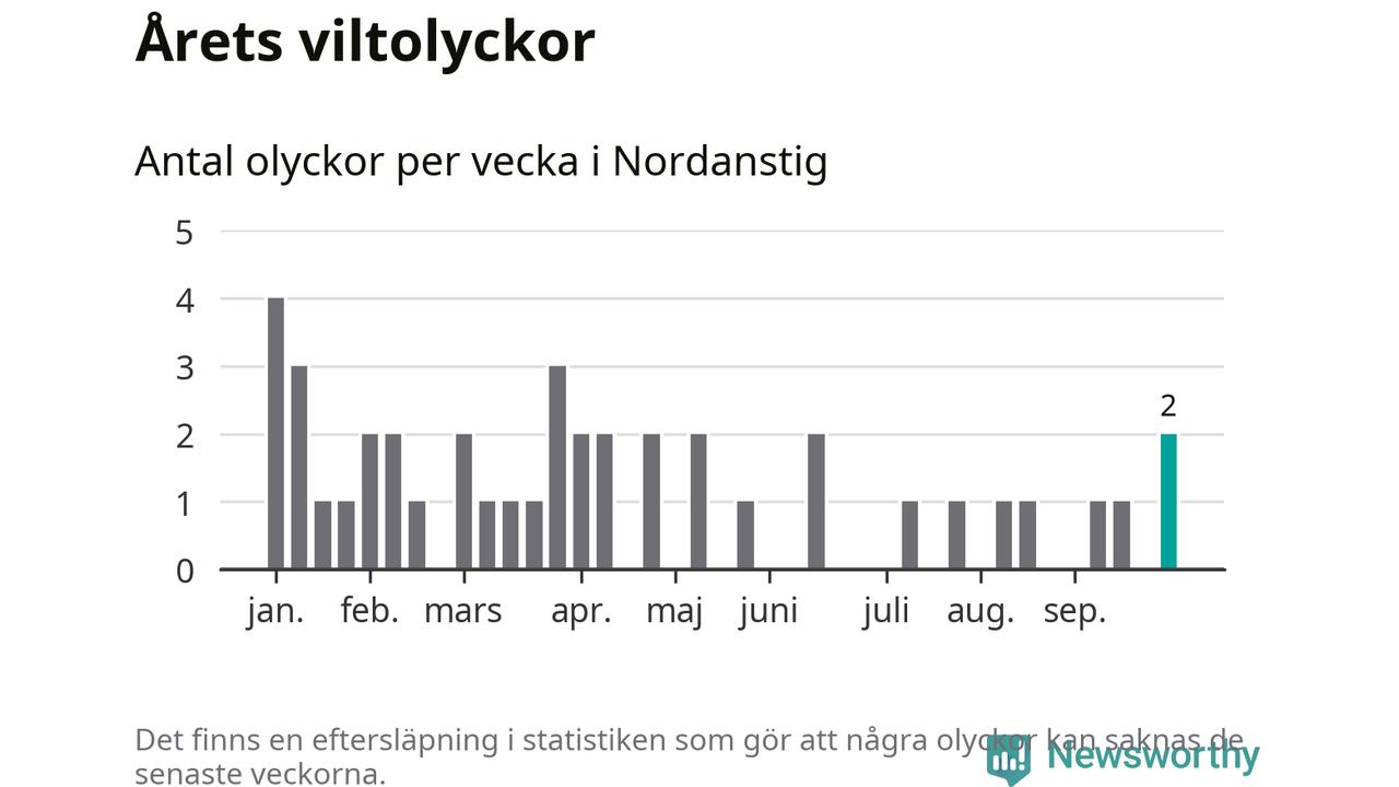 Hittills har två viltolyckor rapporterats in i Nordanstigs kommun från vecka 40. Se listan här.