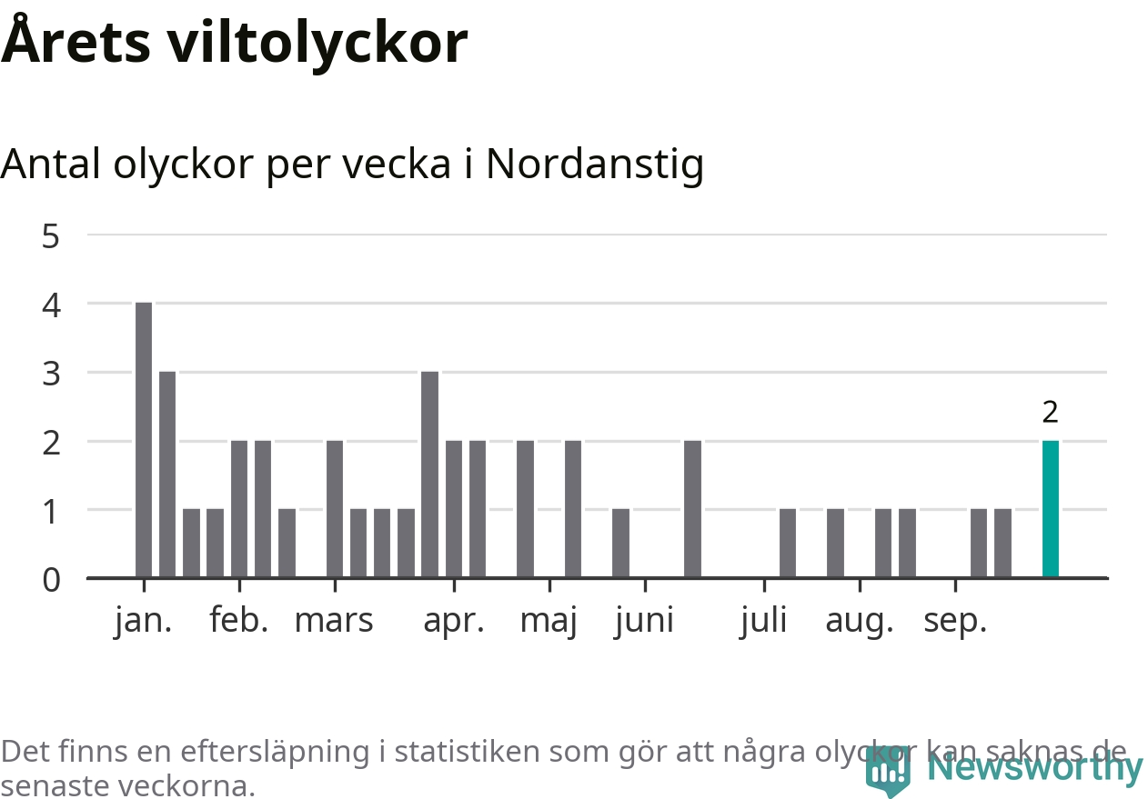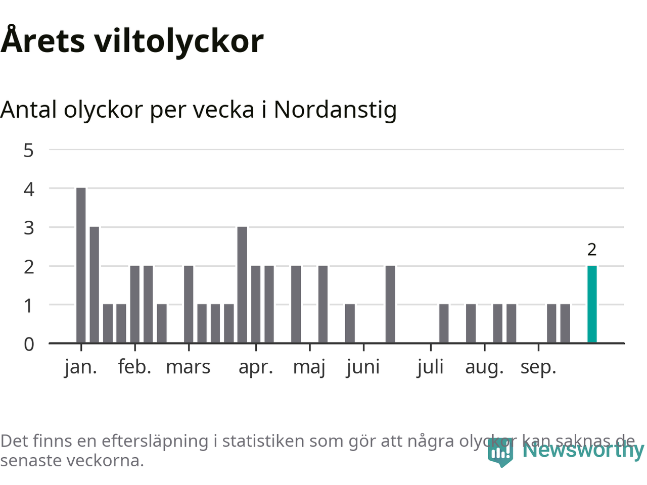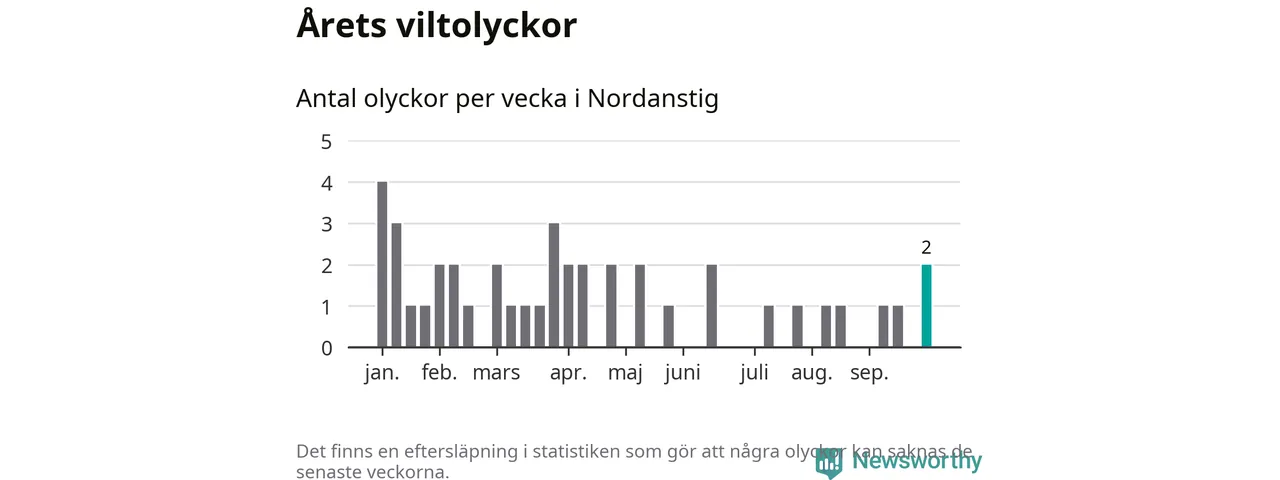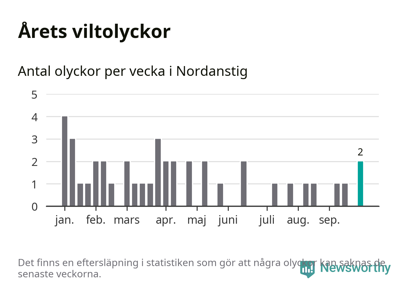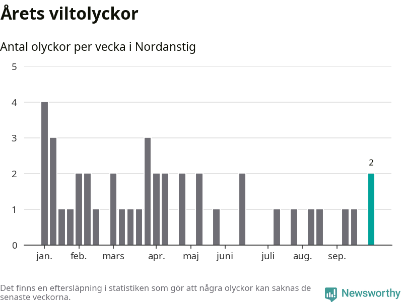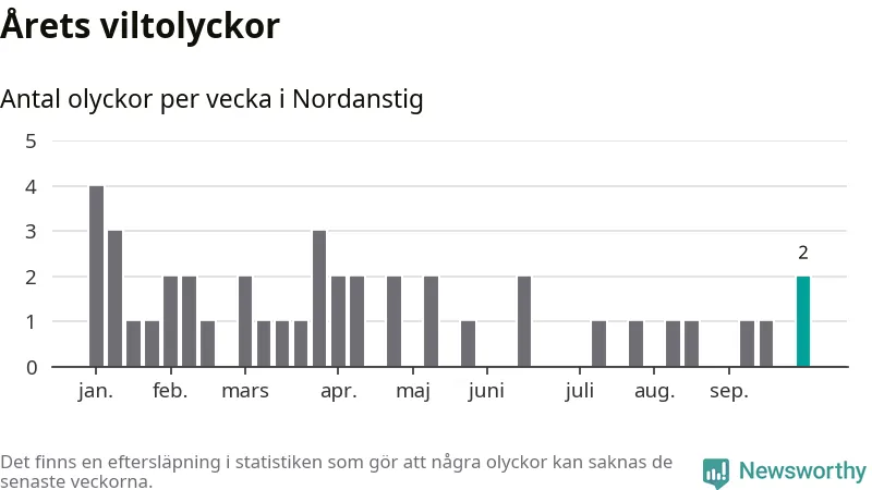 Hittills har två viltolyckor rapporterats in i Nordanstigs kommun från vecka 40. Se listan här.