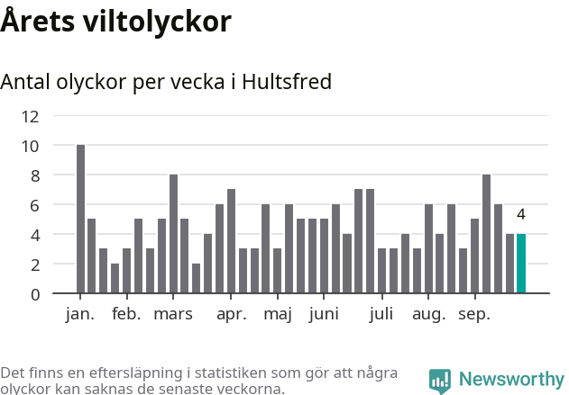 Hittills har fyra viltolyckor rapporterats in i Hultsfreds kommun från vecka 40. Se listan här.