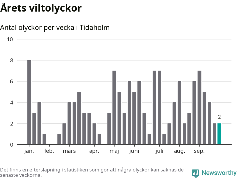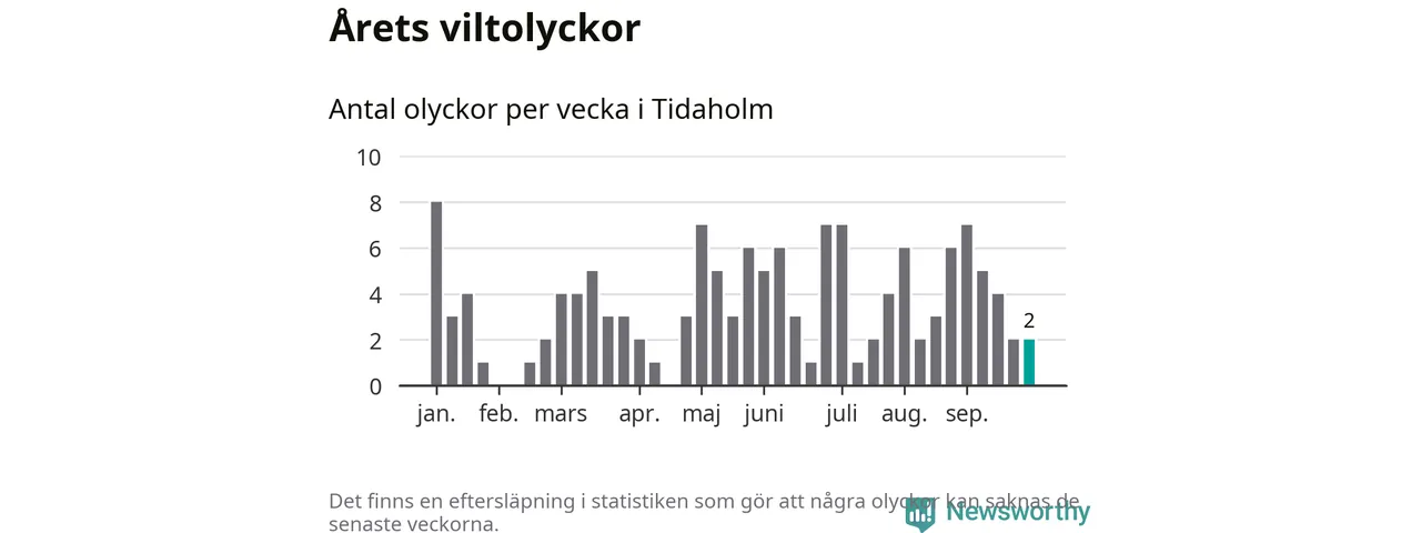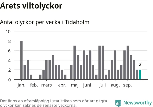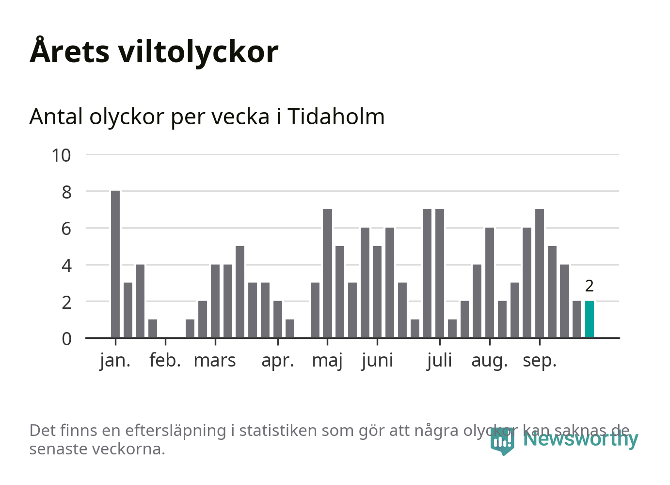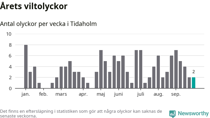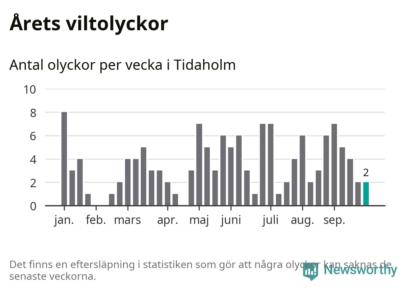 Hittills har två viltolyckor rapporterats in i Tidaholms kommun från vecka 40. Se listan här.