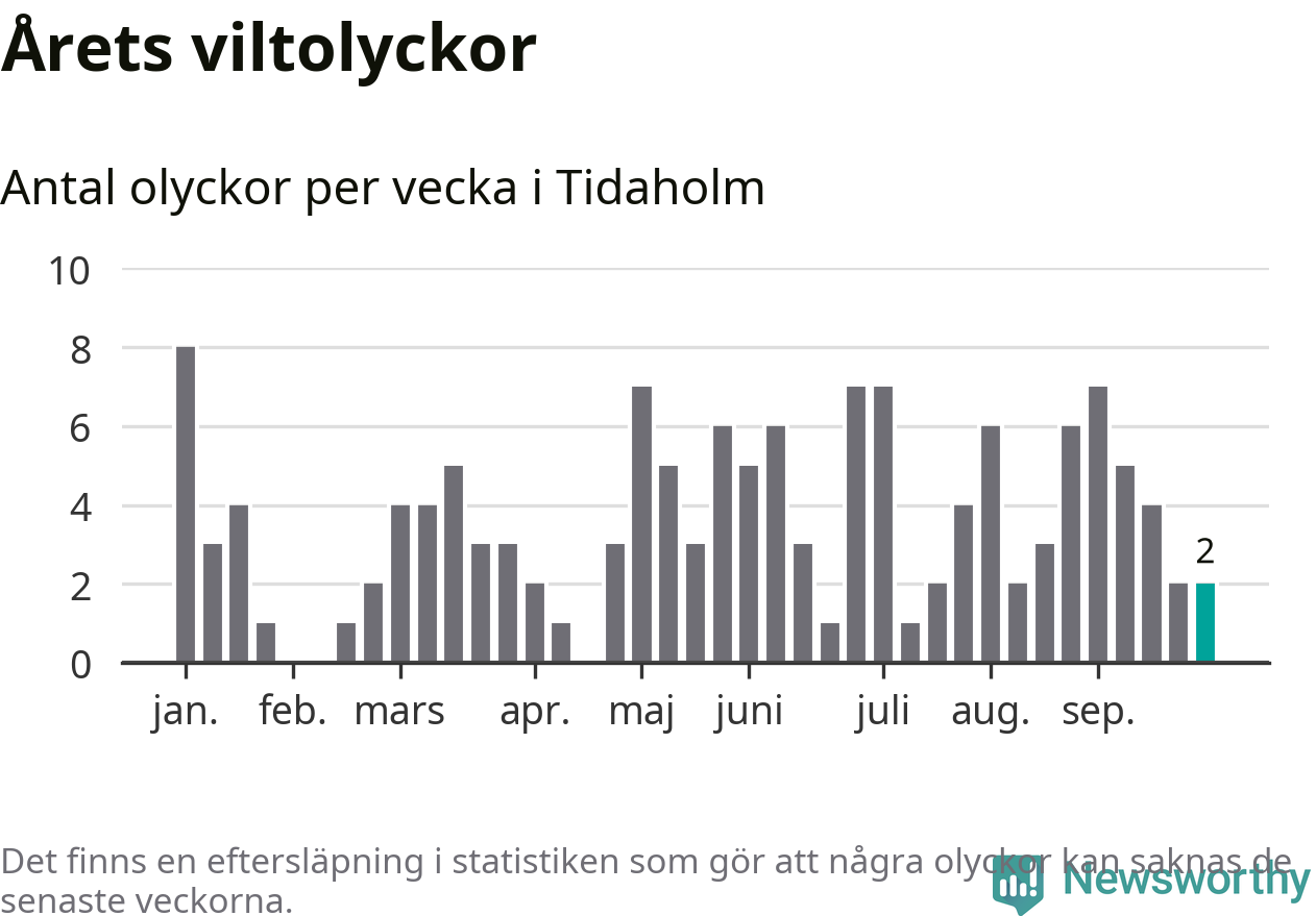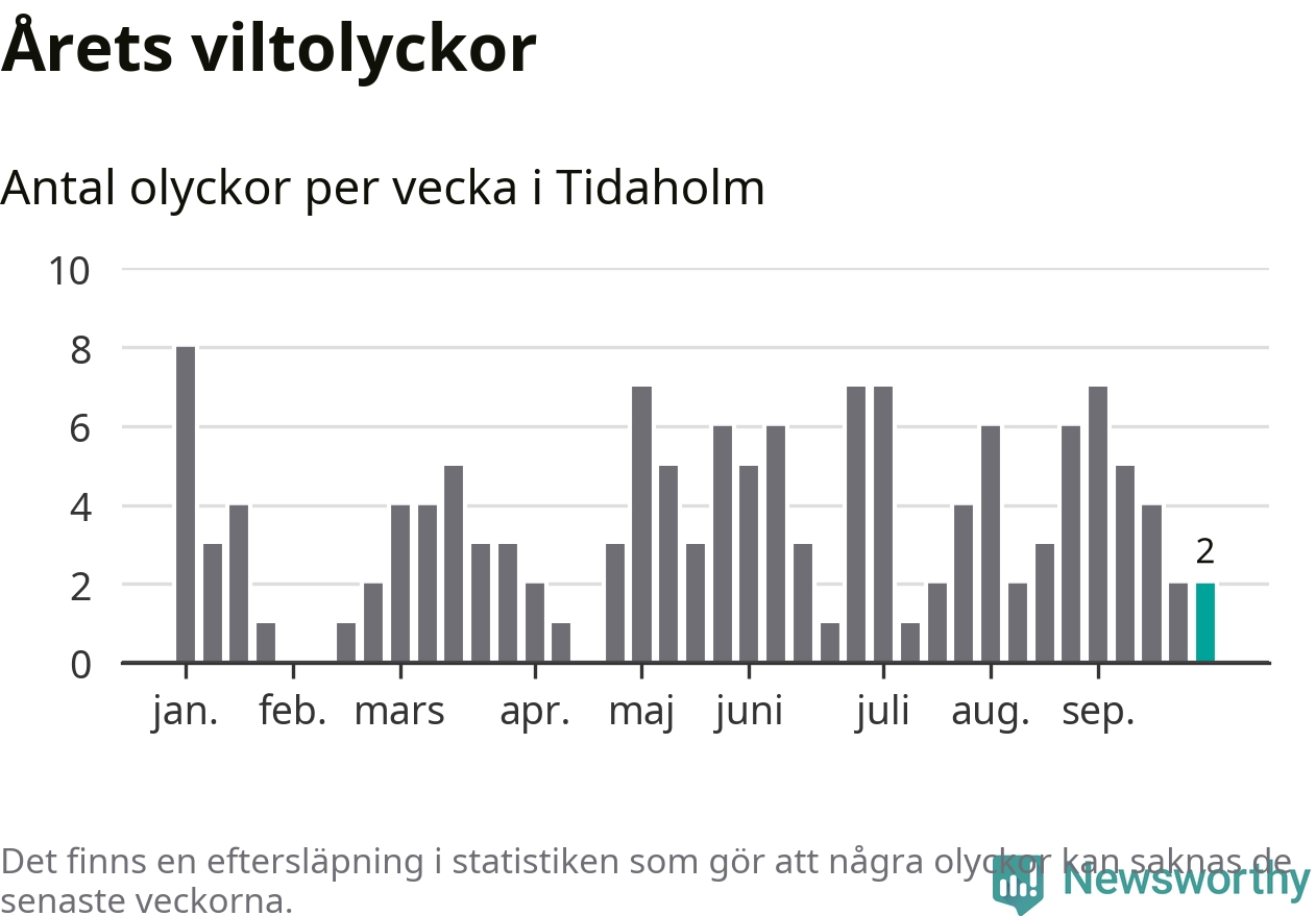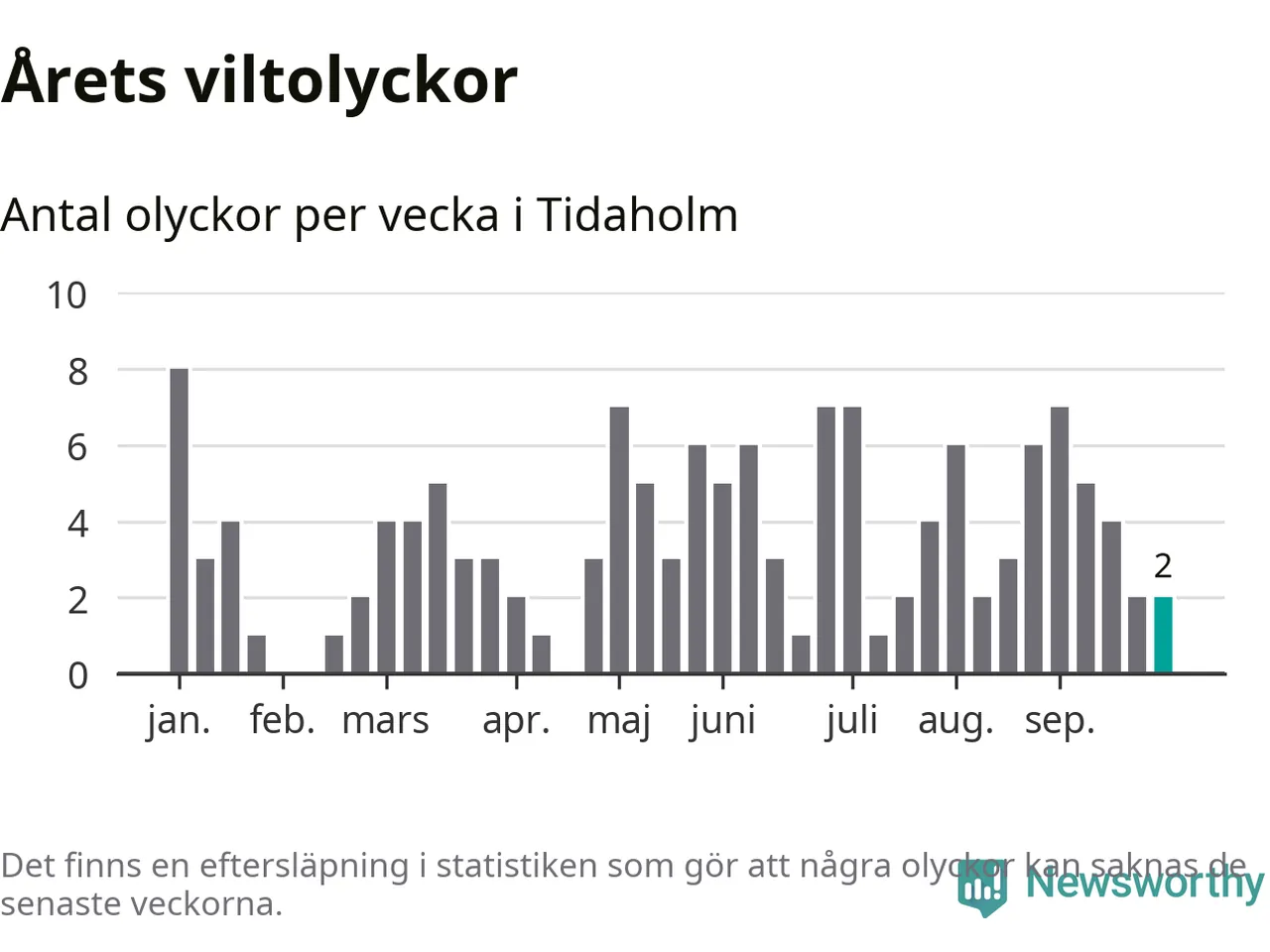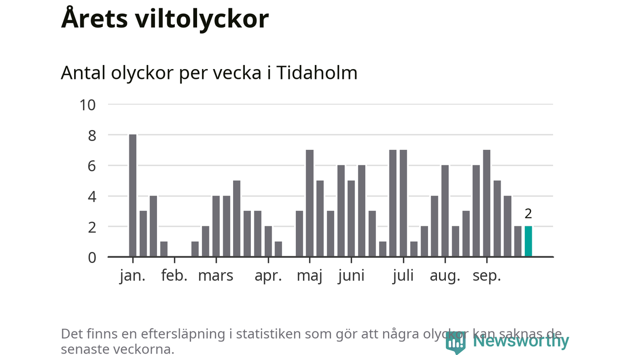Hittills har två viltolyckor rapporterats in i Tidaholms kommun från vecka 40. Se listan här.