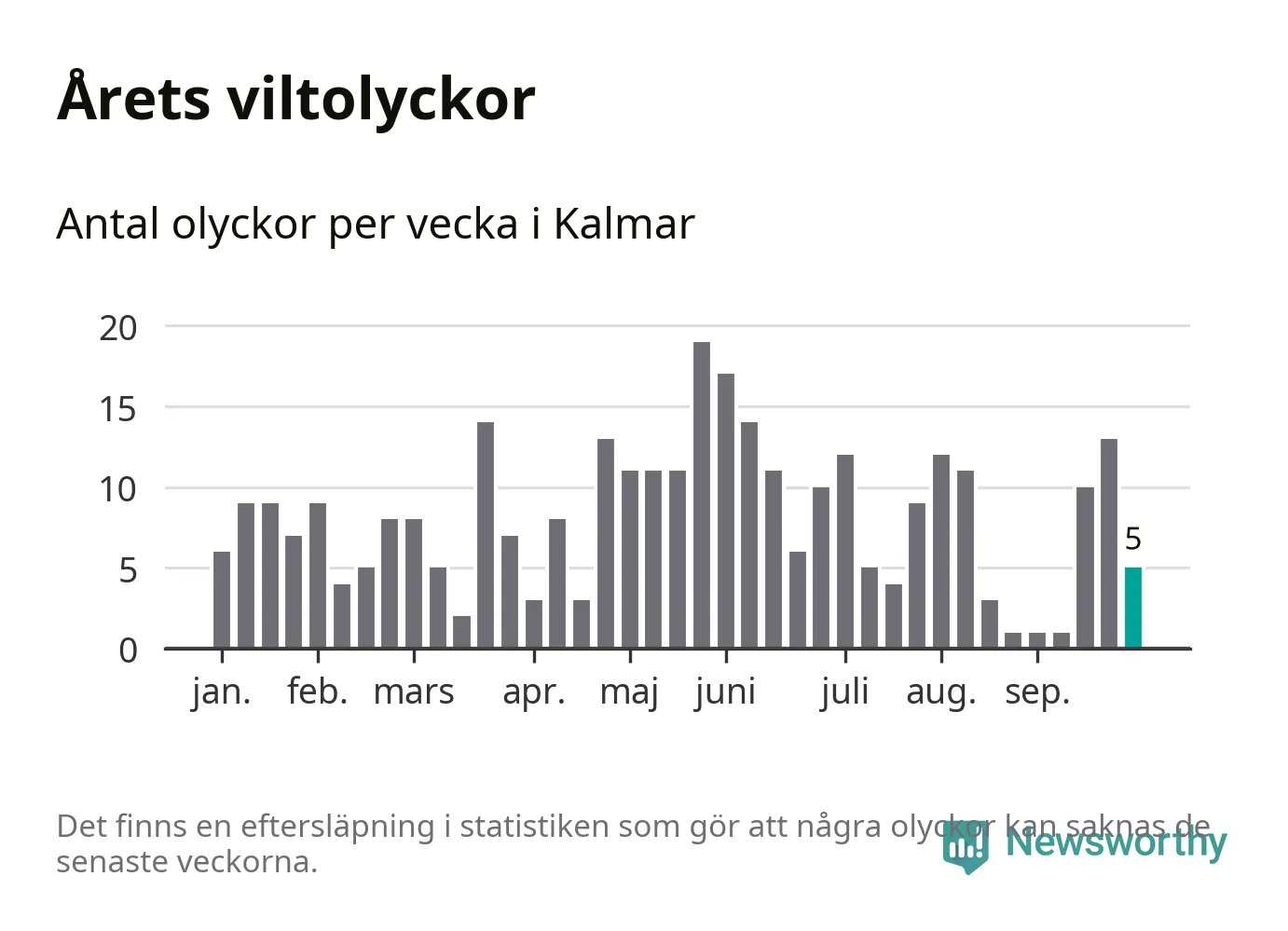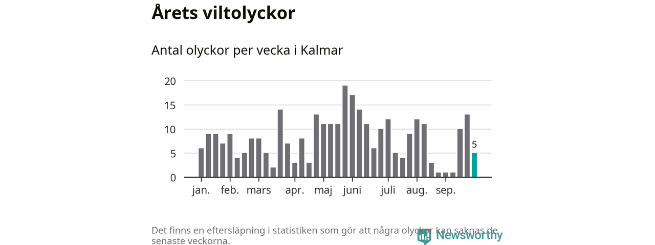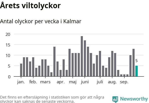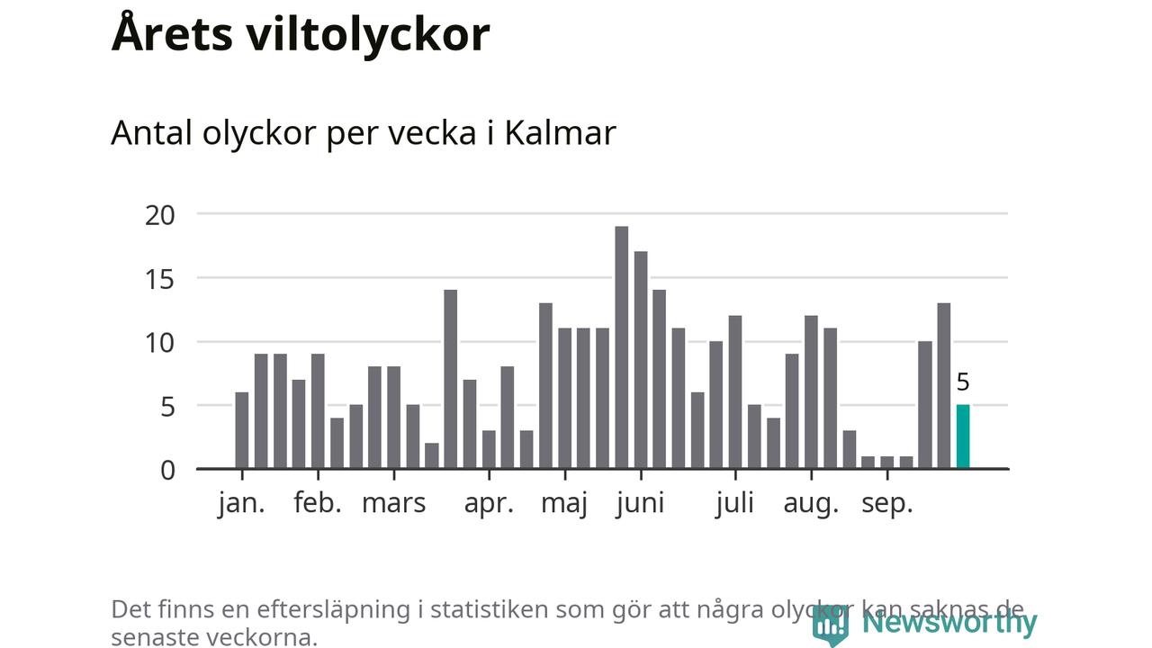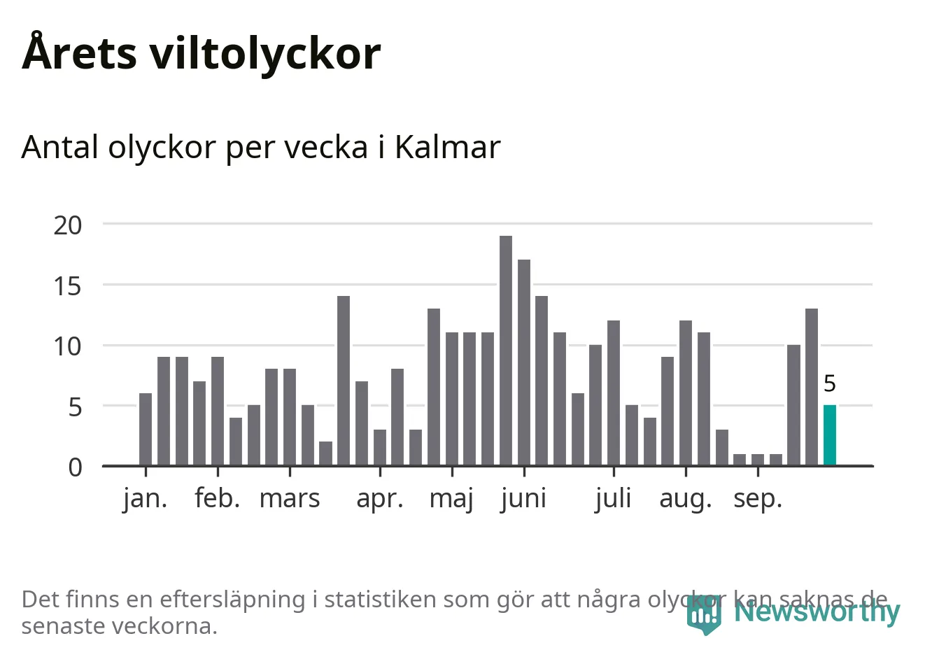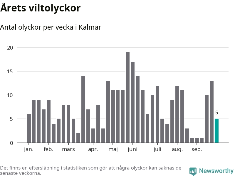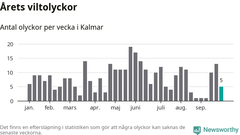 Hittills har fem viltolyckor rapporterats in i Kalmar kommun från vecka 40. Se listan här.