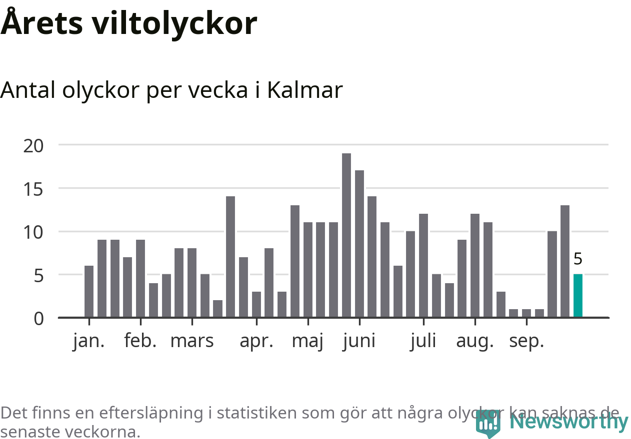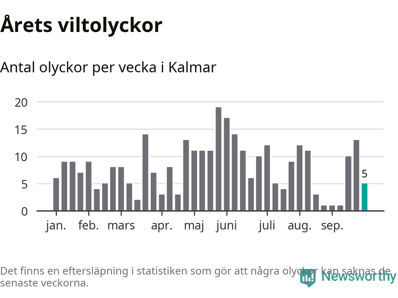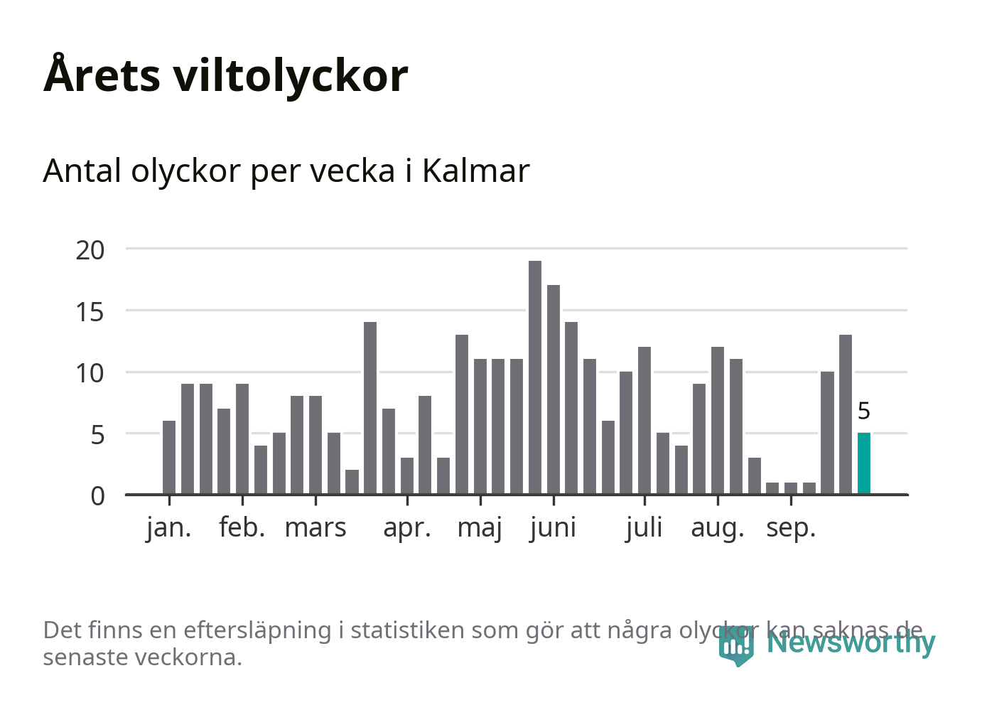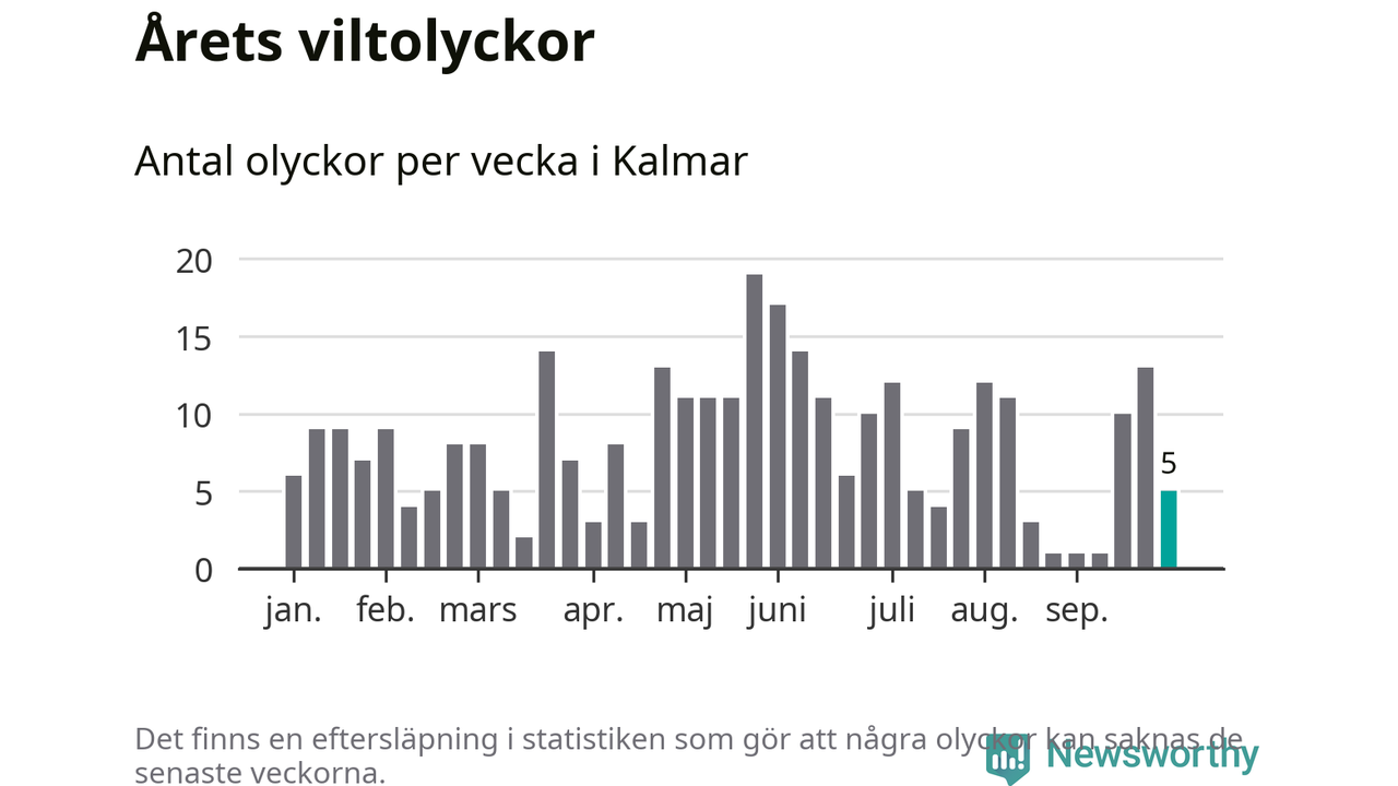 Hittills har fem viltolyckor rapporterats in i Kalmar kommun från vecka 40. Se listan här.