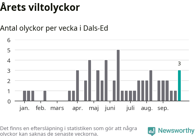 Hittills har tre viltolyckor rapporterats in i Dals-Eds kommun från vecka 40. Se listan här.
