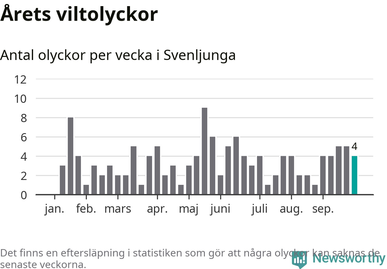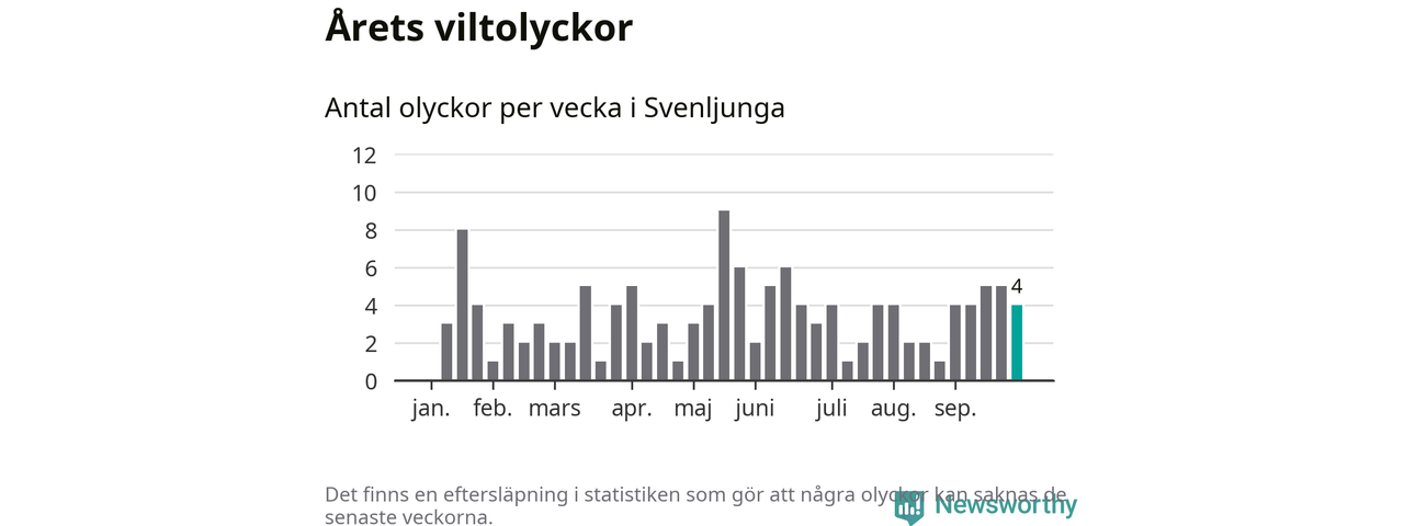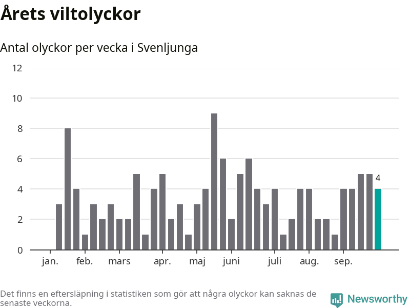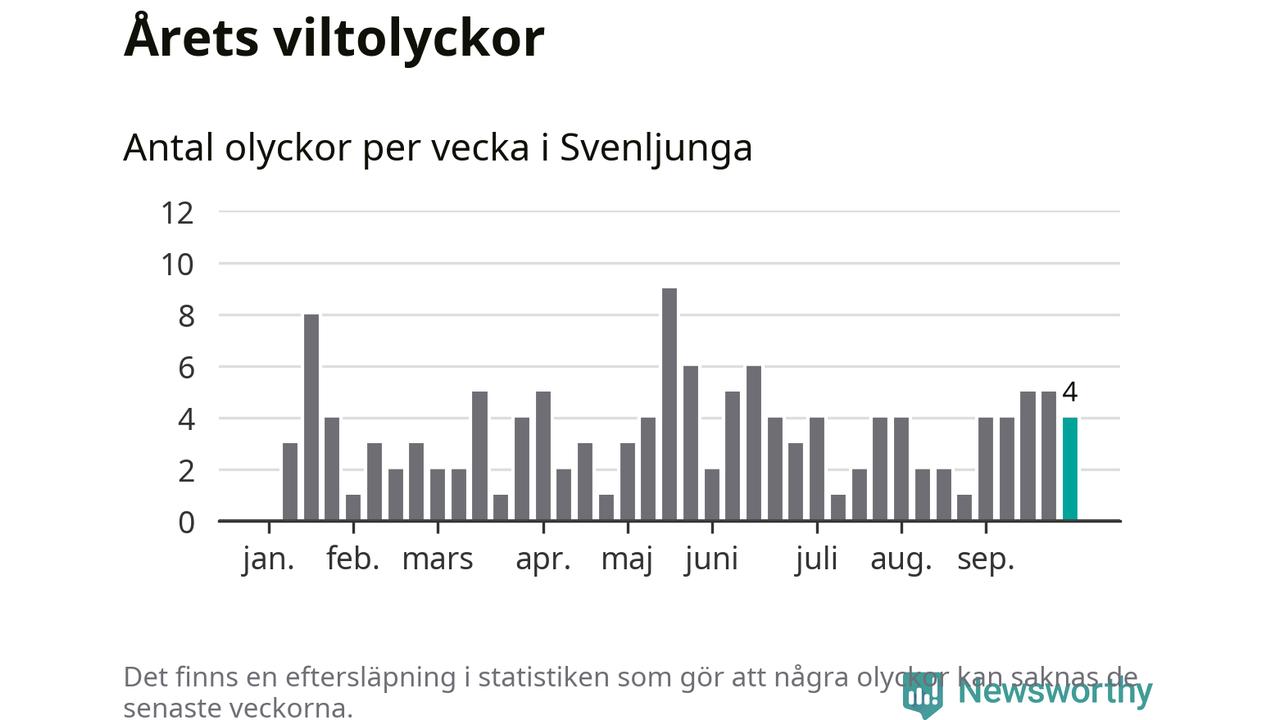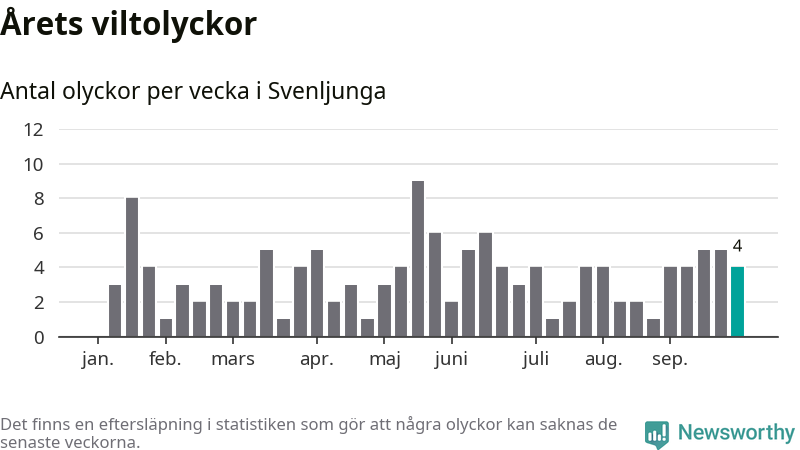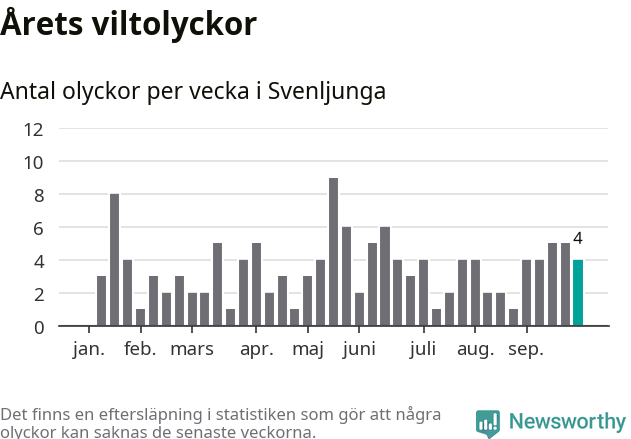Hittills har fyra viltolyckor rapporterats in i Svenljunga kommun från vecka 40. Se listan här.