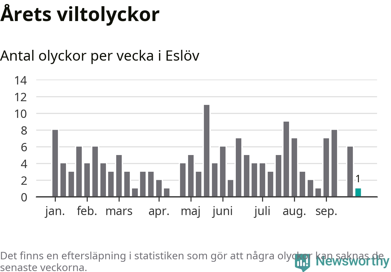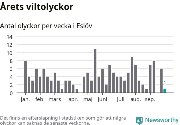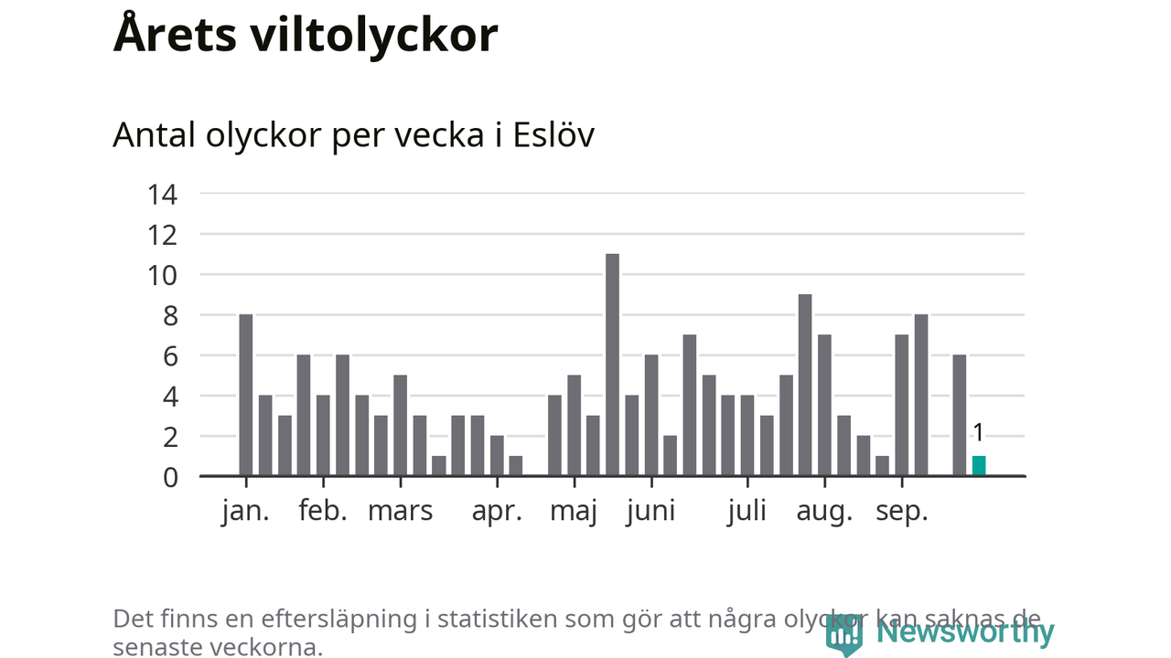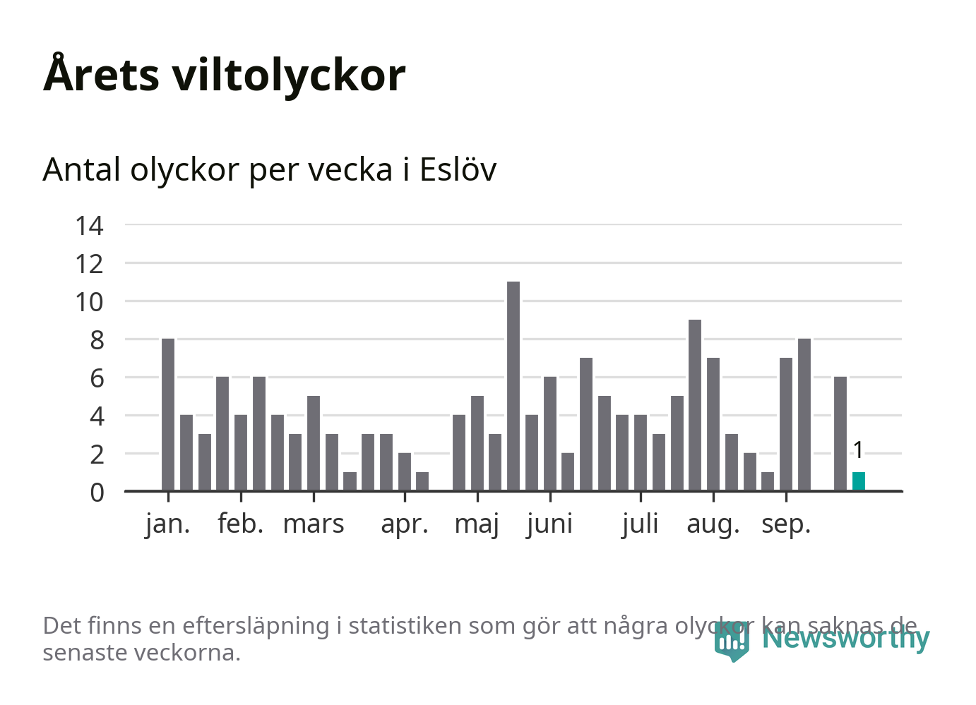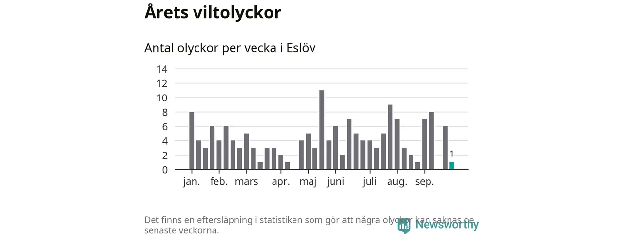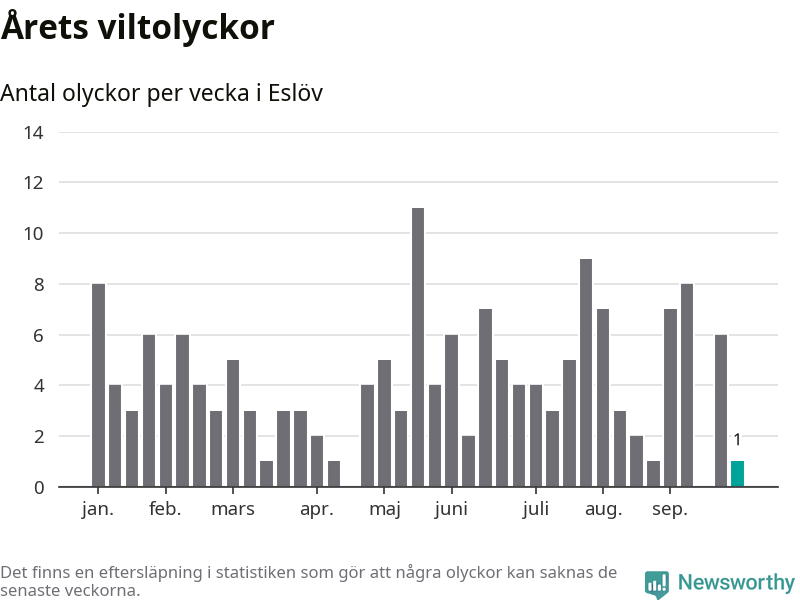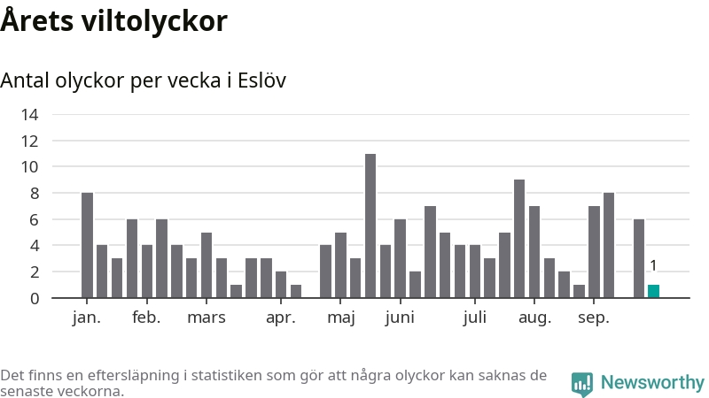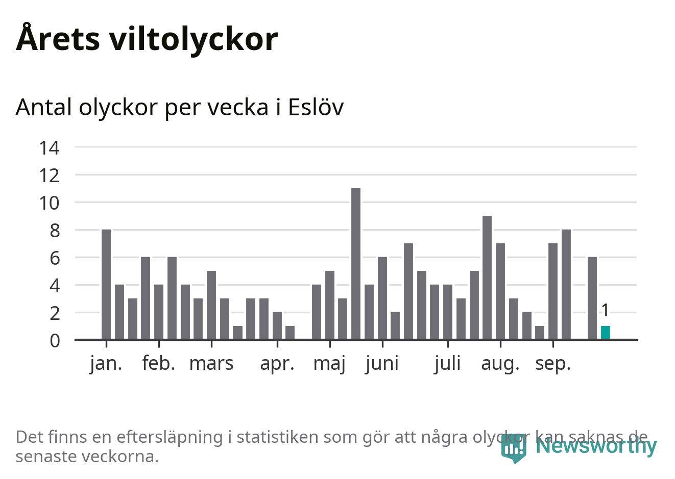 Från förra veckan (vecka 40) har hittills en viltolycka rapporterats in i Eslövs kommun.