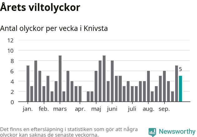 Hittills har fem viltolyckor rapporterats in i Knivsta kommun från vecka 40. Se listan här.