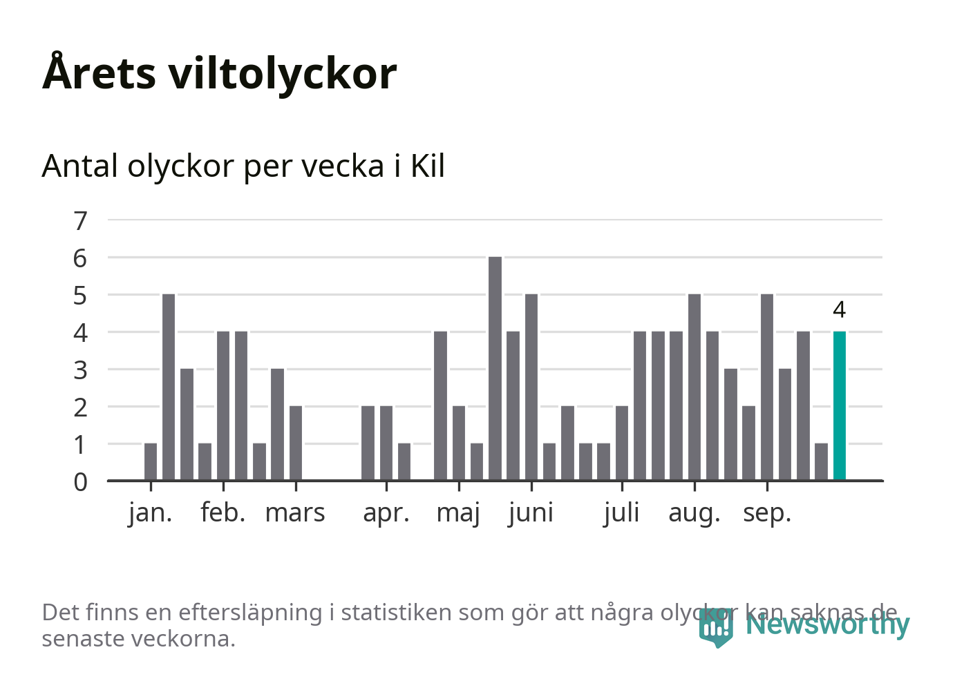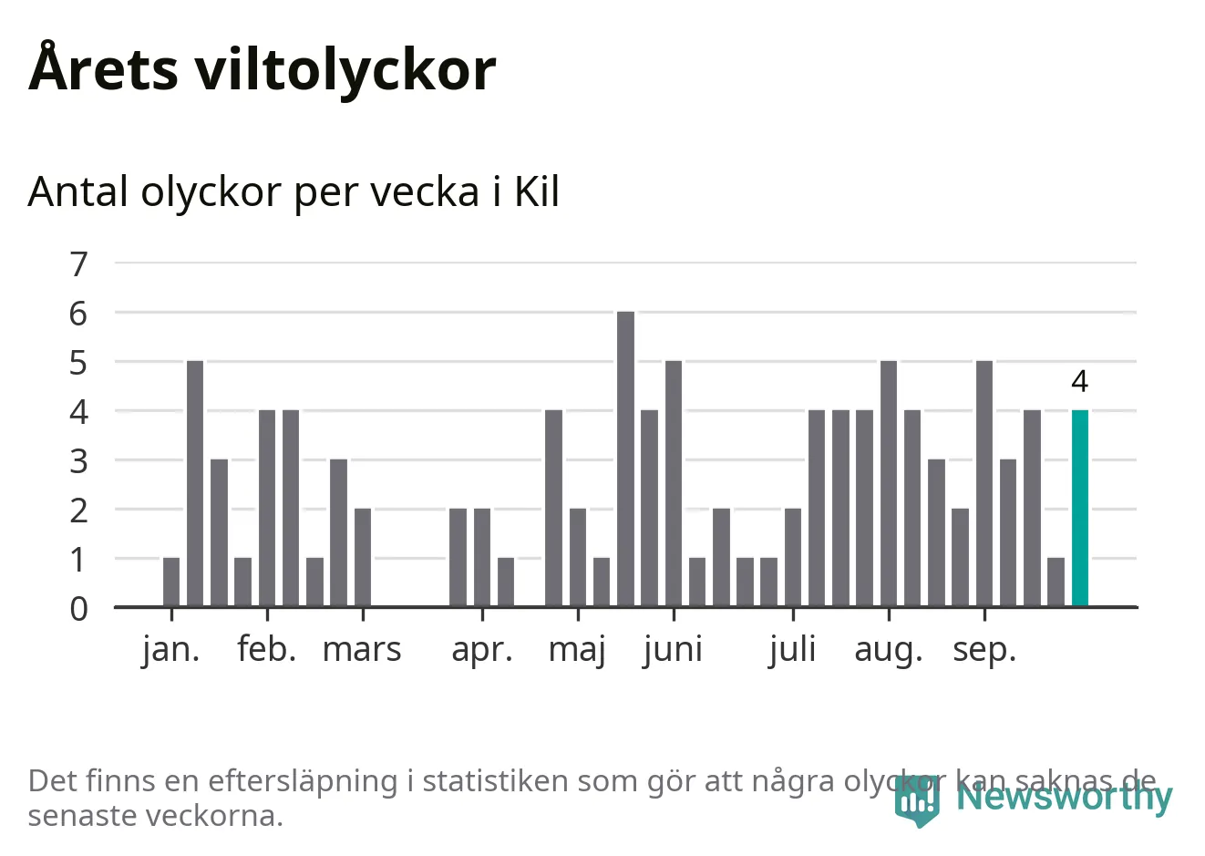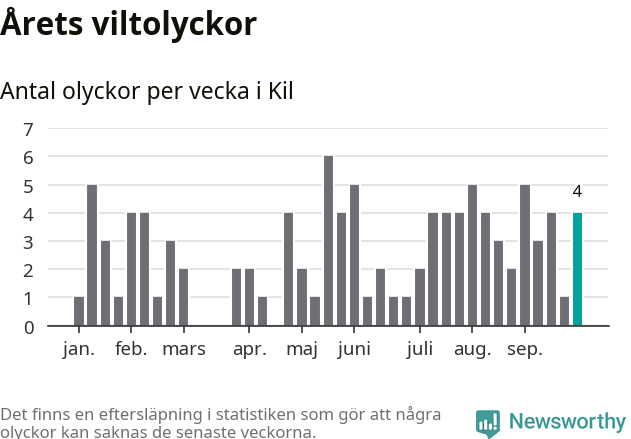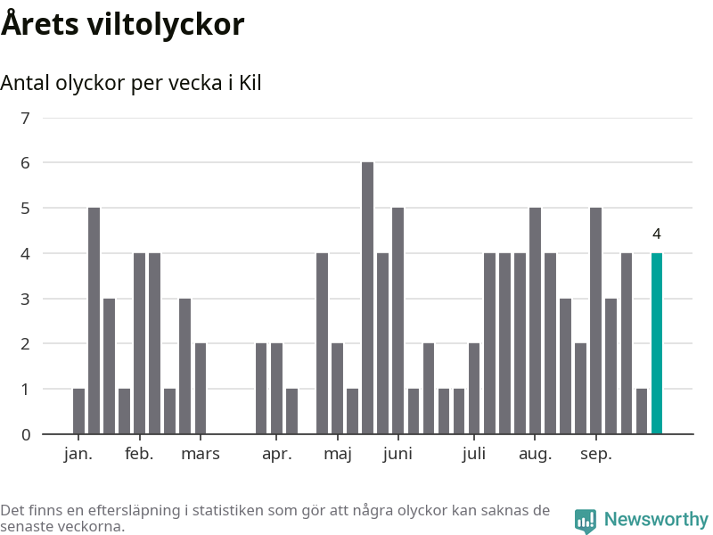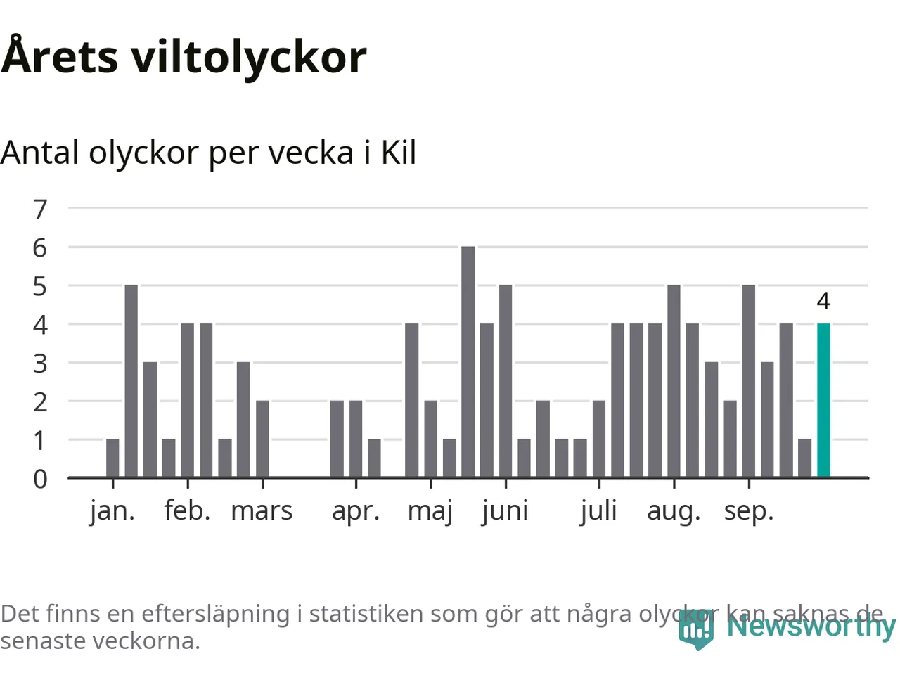 Hittills har fyra viltolyckor rapporterats in i Kils kommun från vecka 40. Se listan här.
