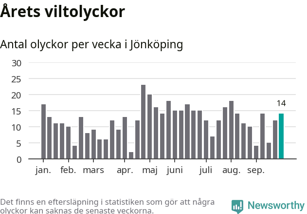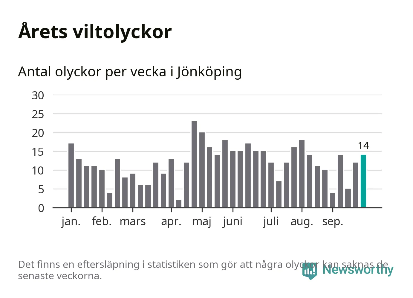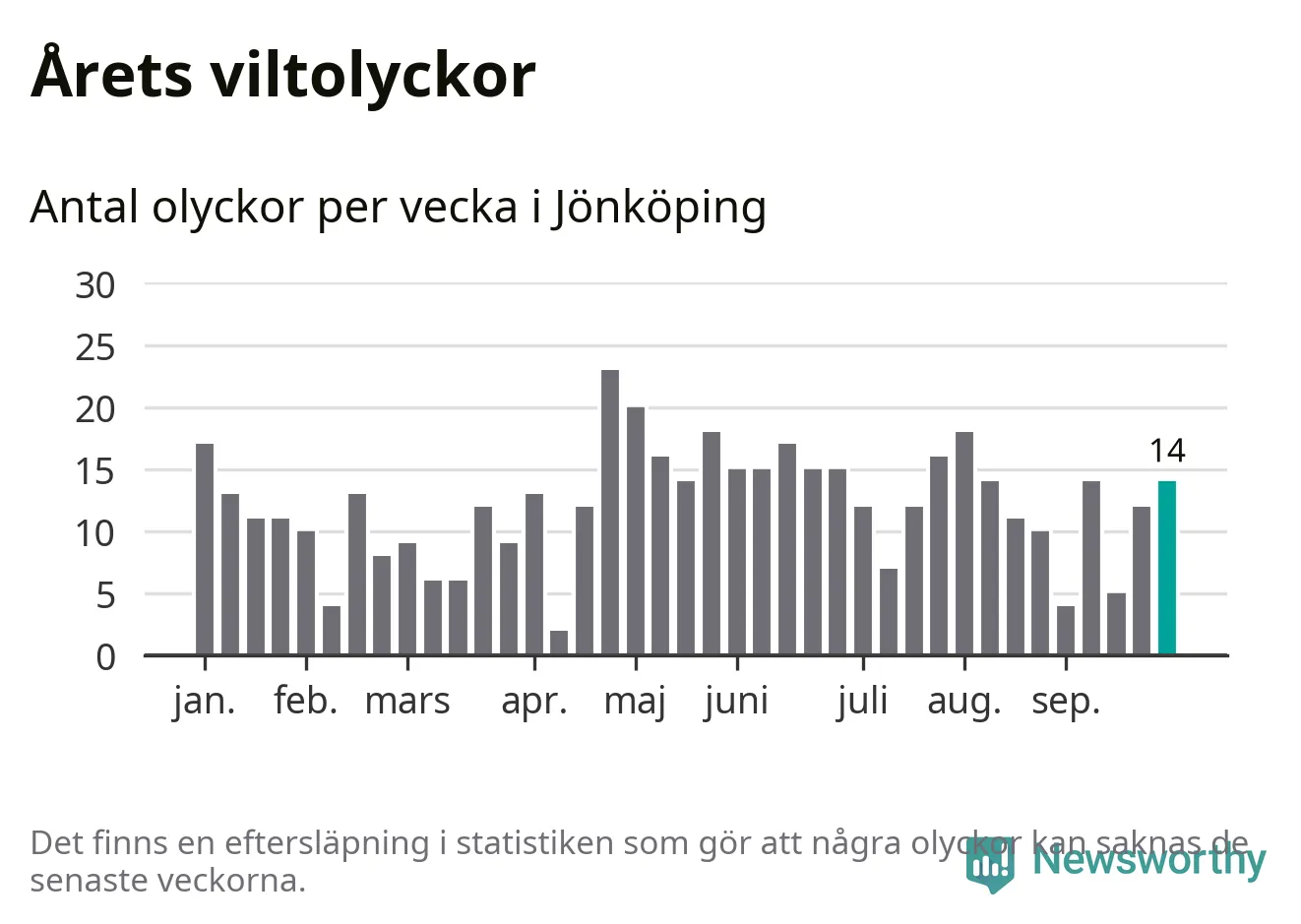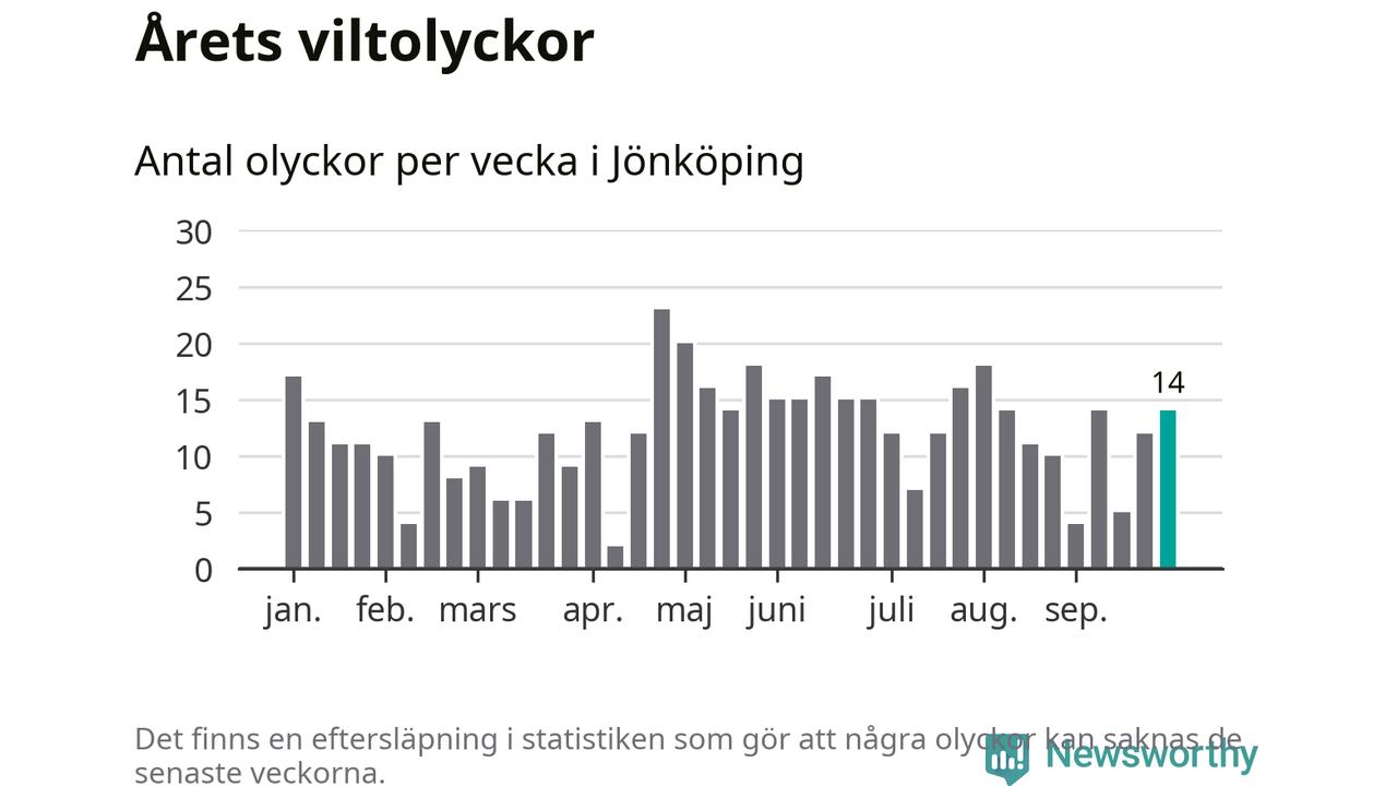Hittills har 14 viltolyckor rapporterats in i Jönköpings kommun från vecka 40. Se listan här.