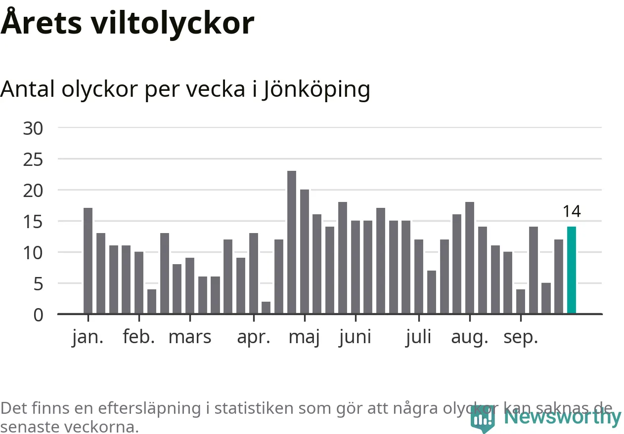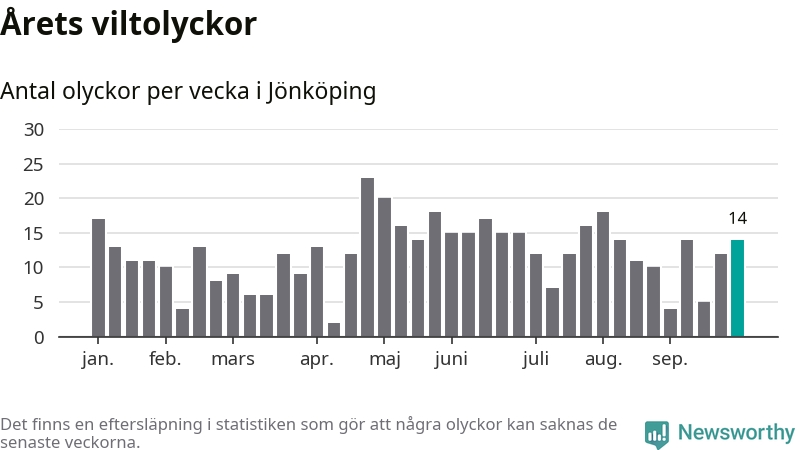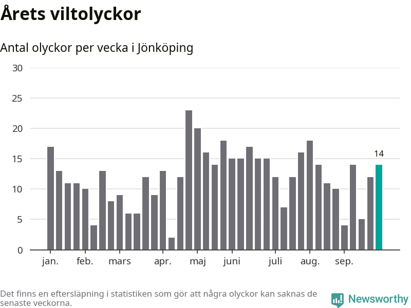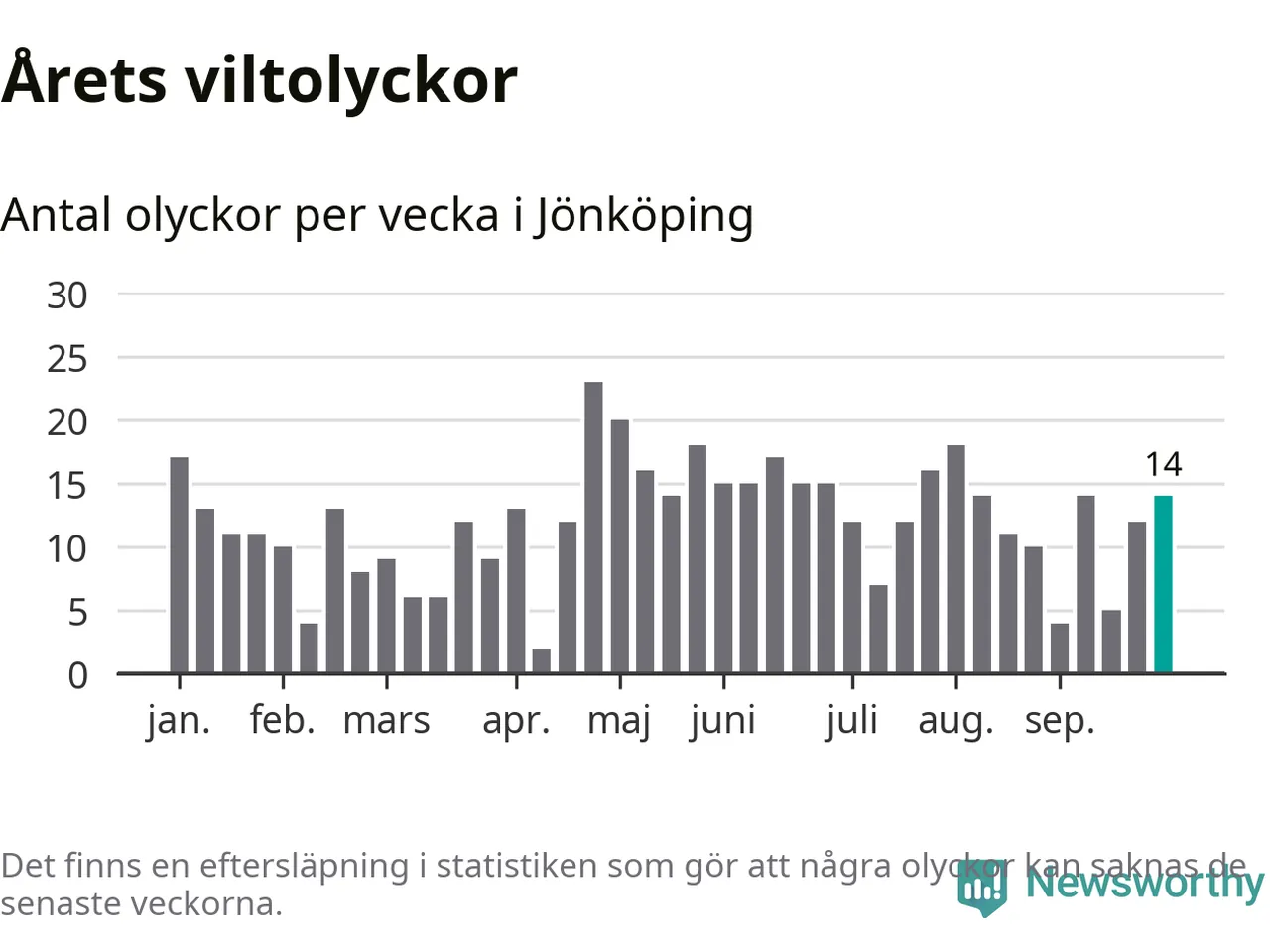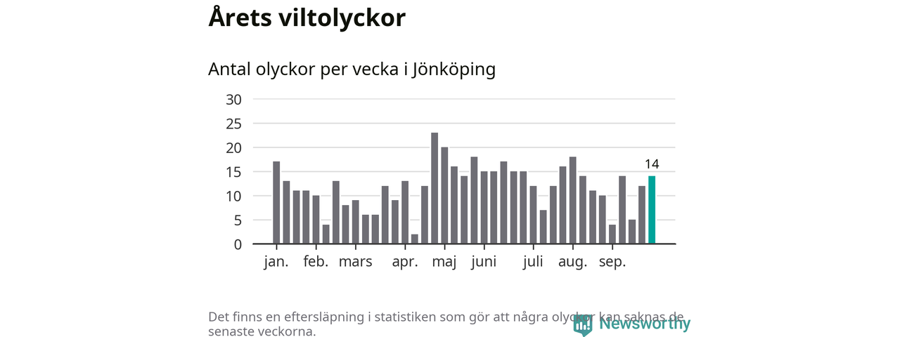 Hittills har 14 viltolyckor rapporterats in i Jönköpings kommun från vecka 40. Se listan här.