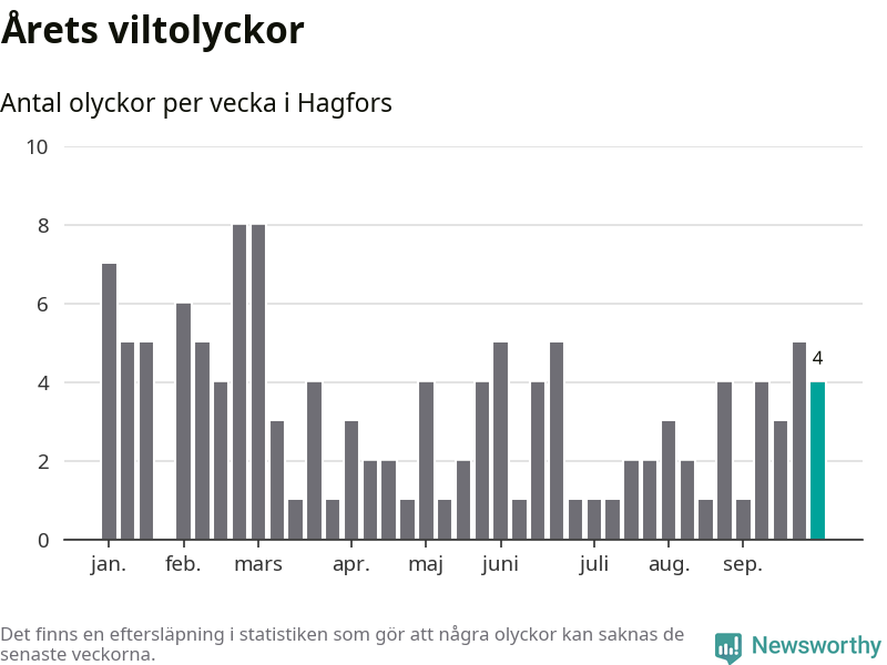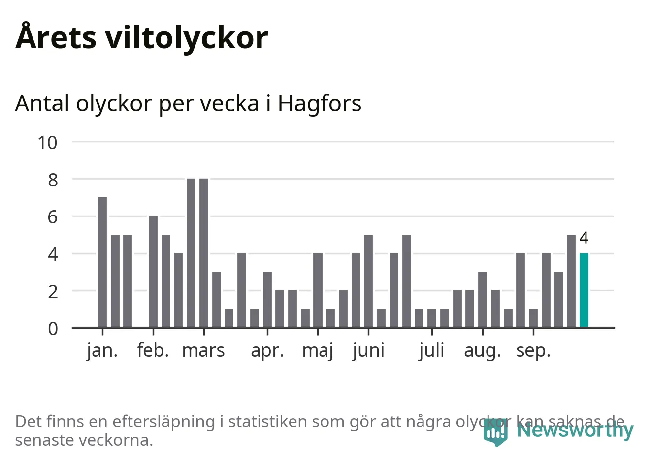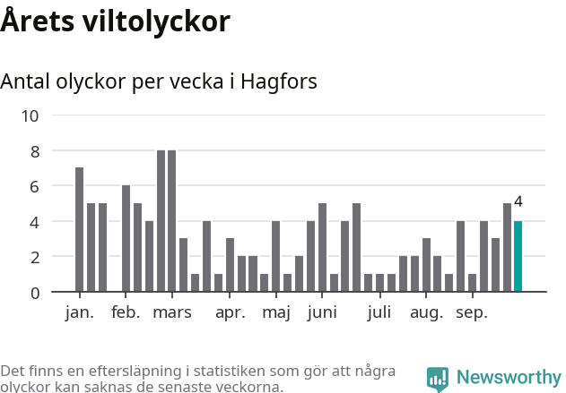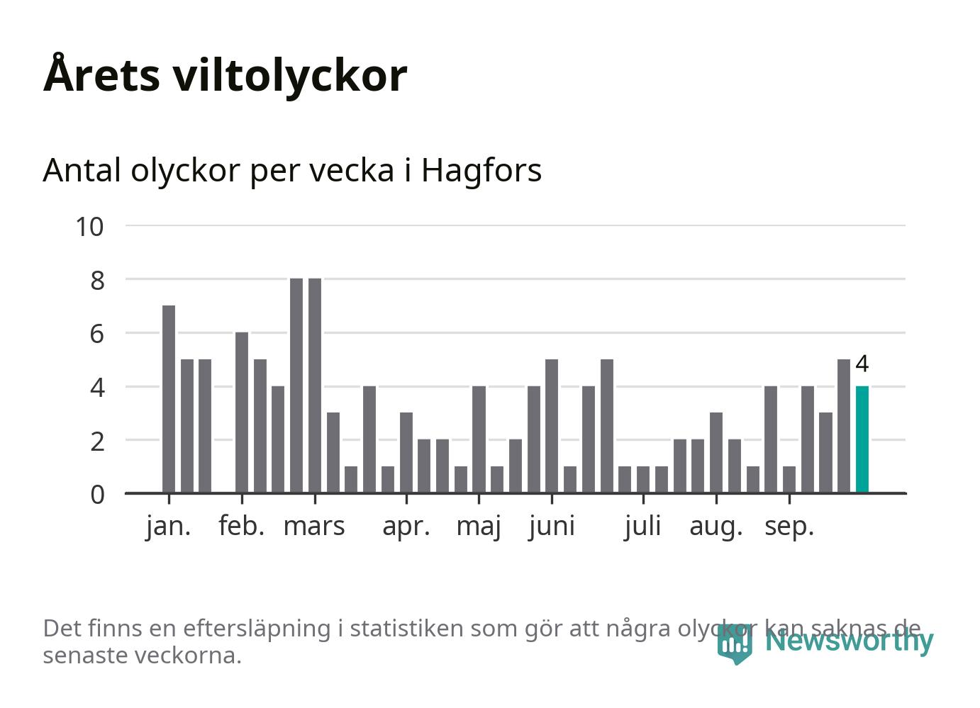 Hittills har fyra viltolyckor rapporterats in i Hagfors kommun från vecka 40. Se listan här.