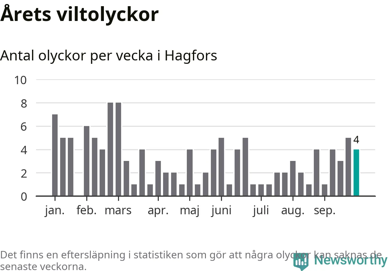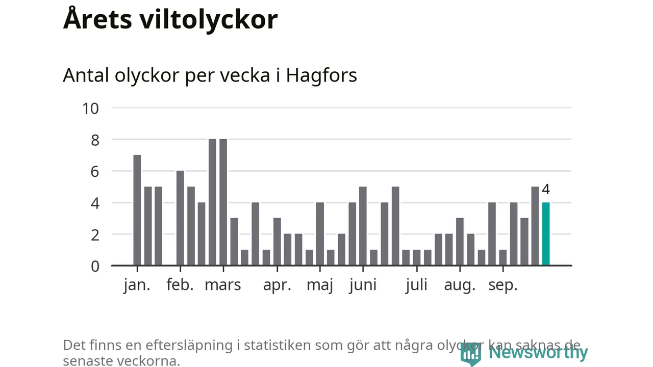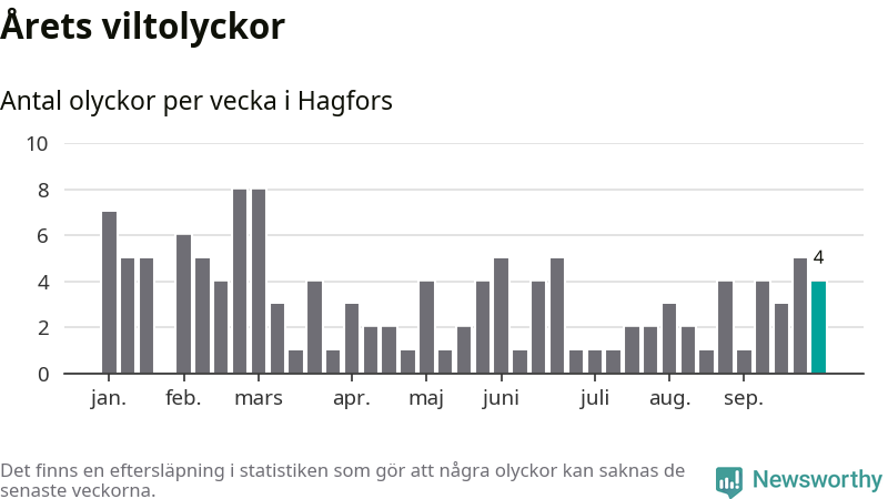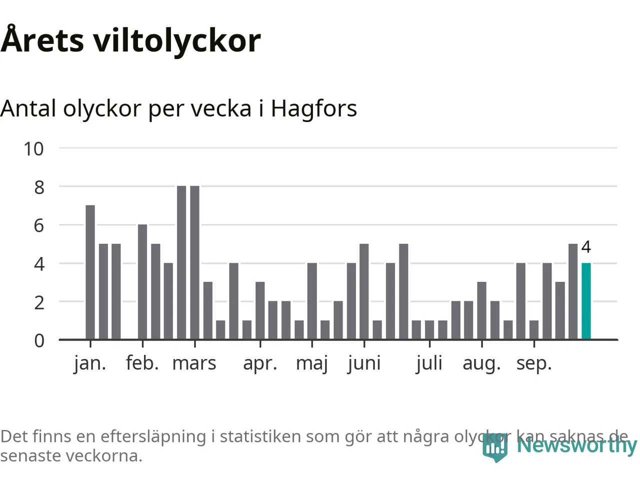 Hittills har fyra viltolyckor rapporterats in i Hagfors kommun från vecka 40. Se listan här.