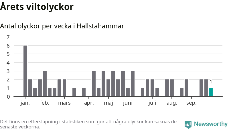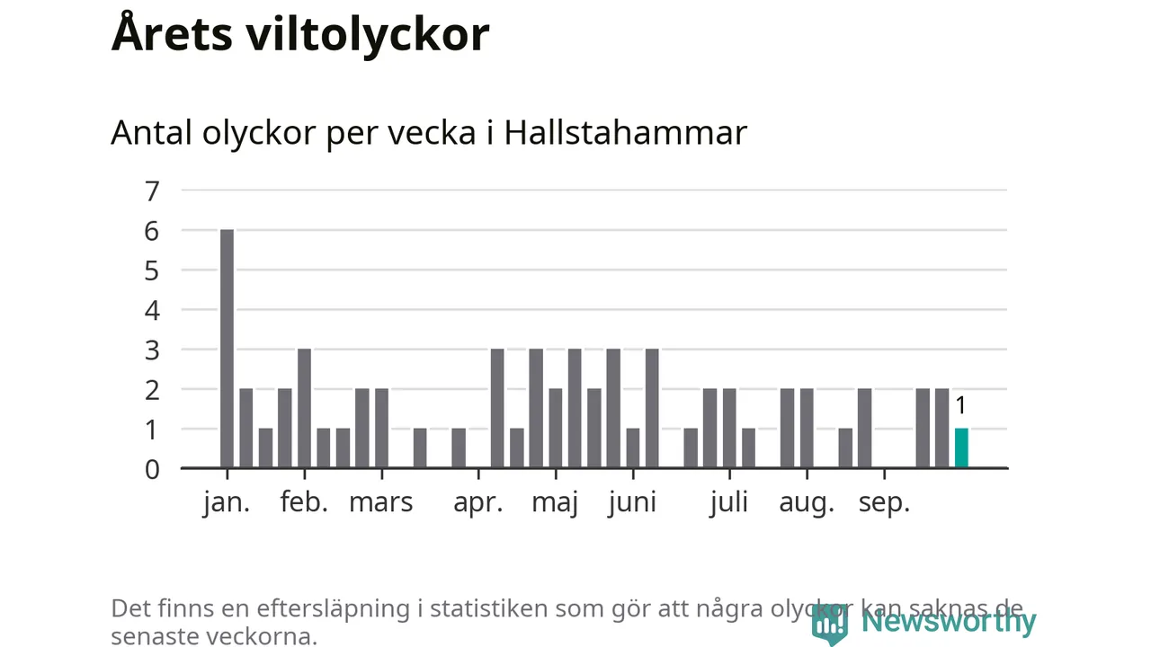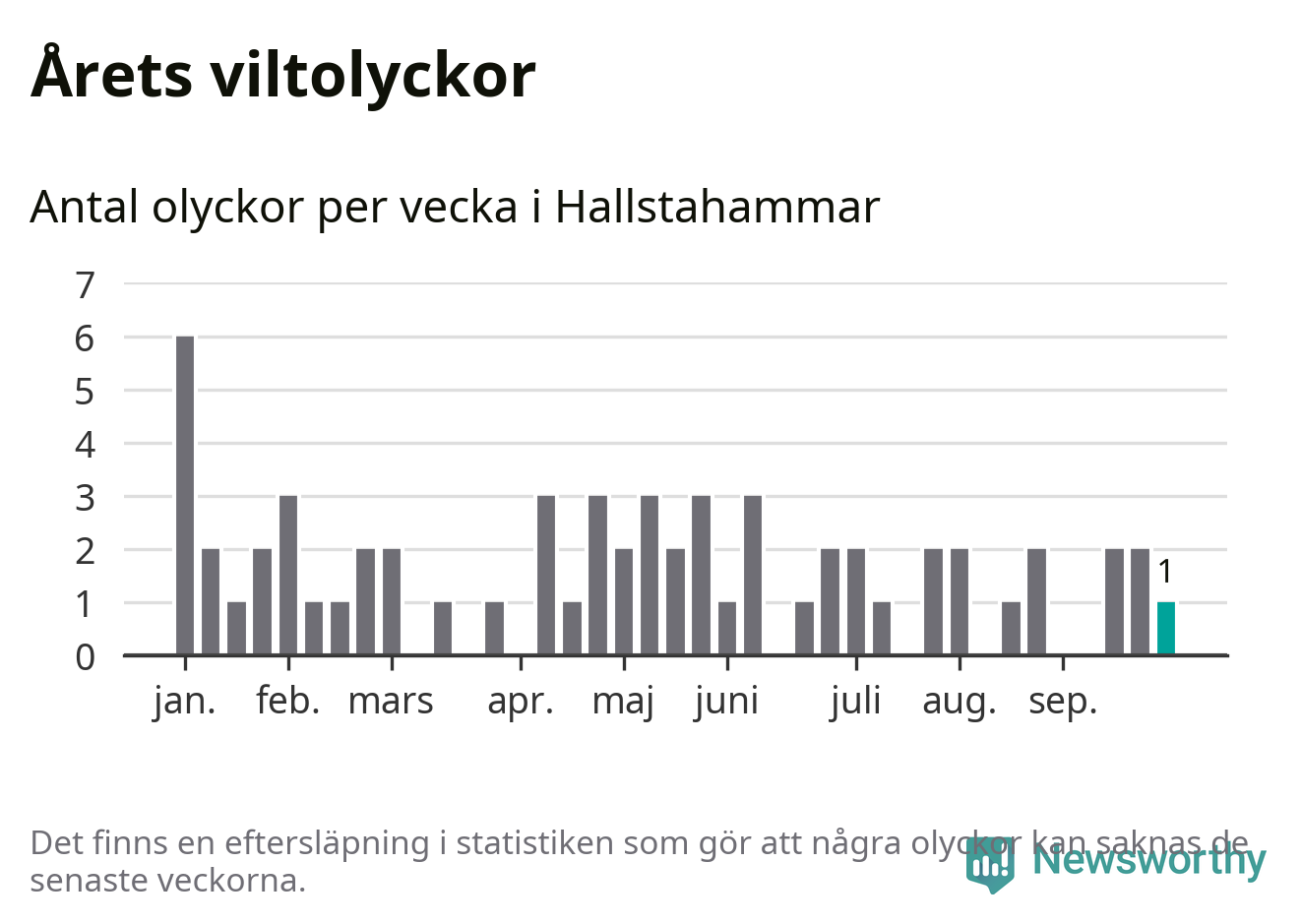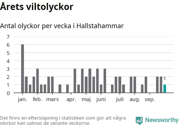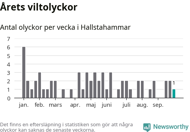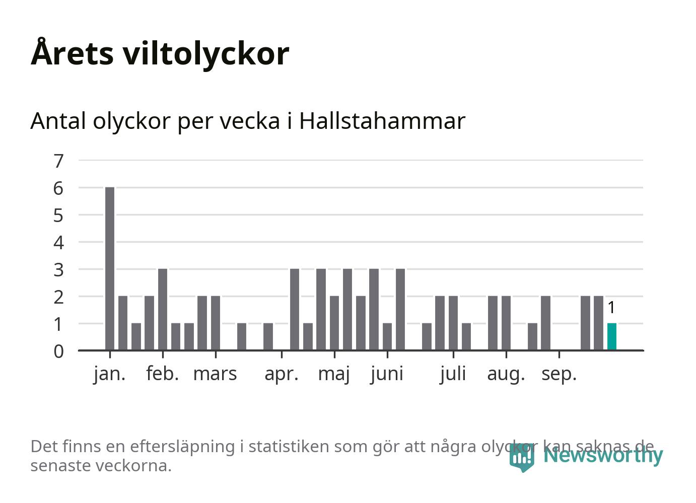 Från förra veckan (vecka 40) har hittills en viltolycka rapporterats in i Hallstahammars kommun.