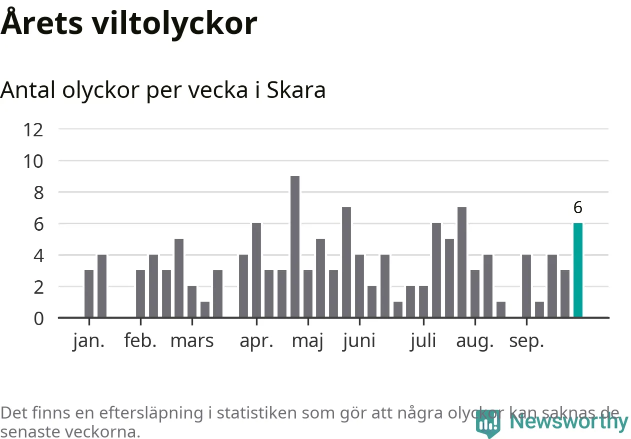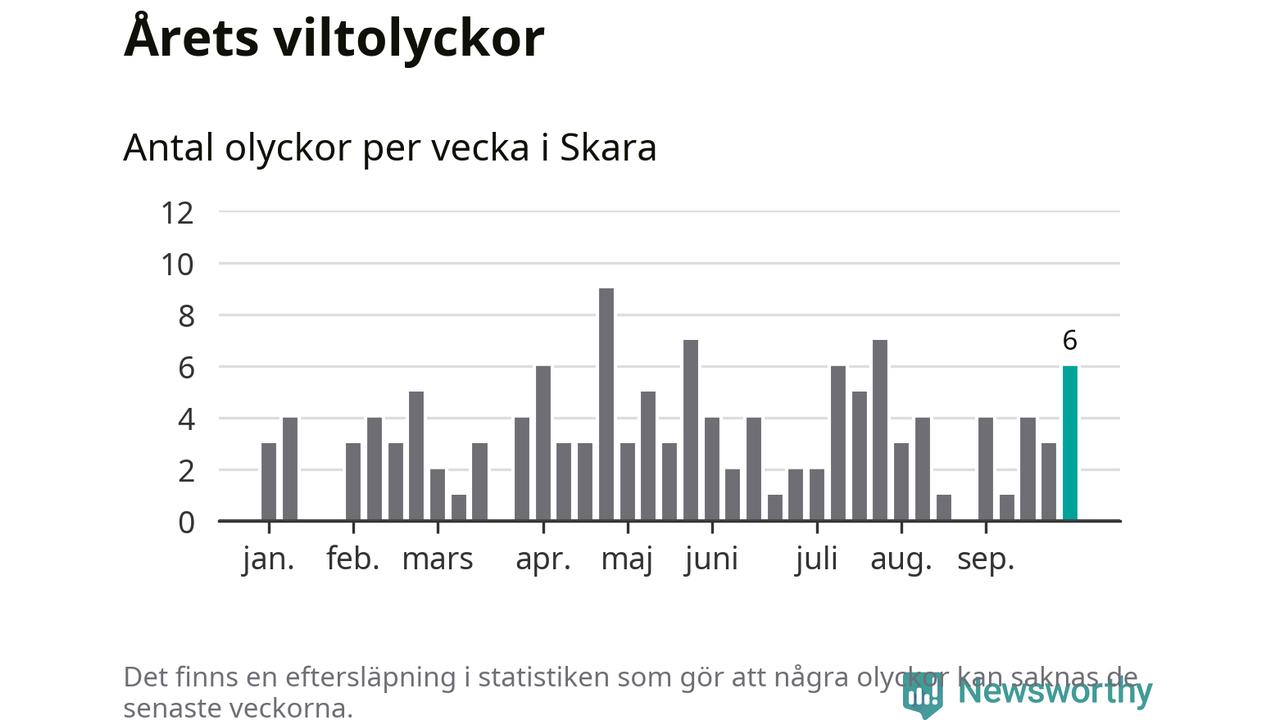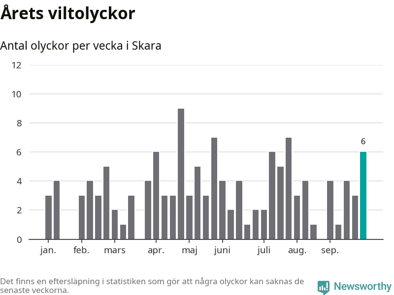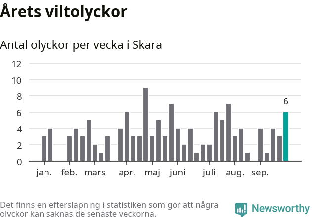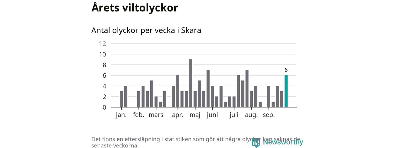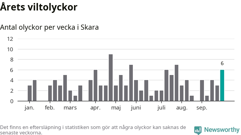 Hittills har sex viltolyckor rapporterats in i Skara kommun från vecka 40. Se listan här.