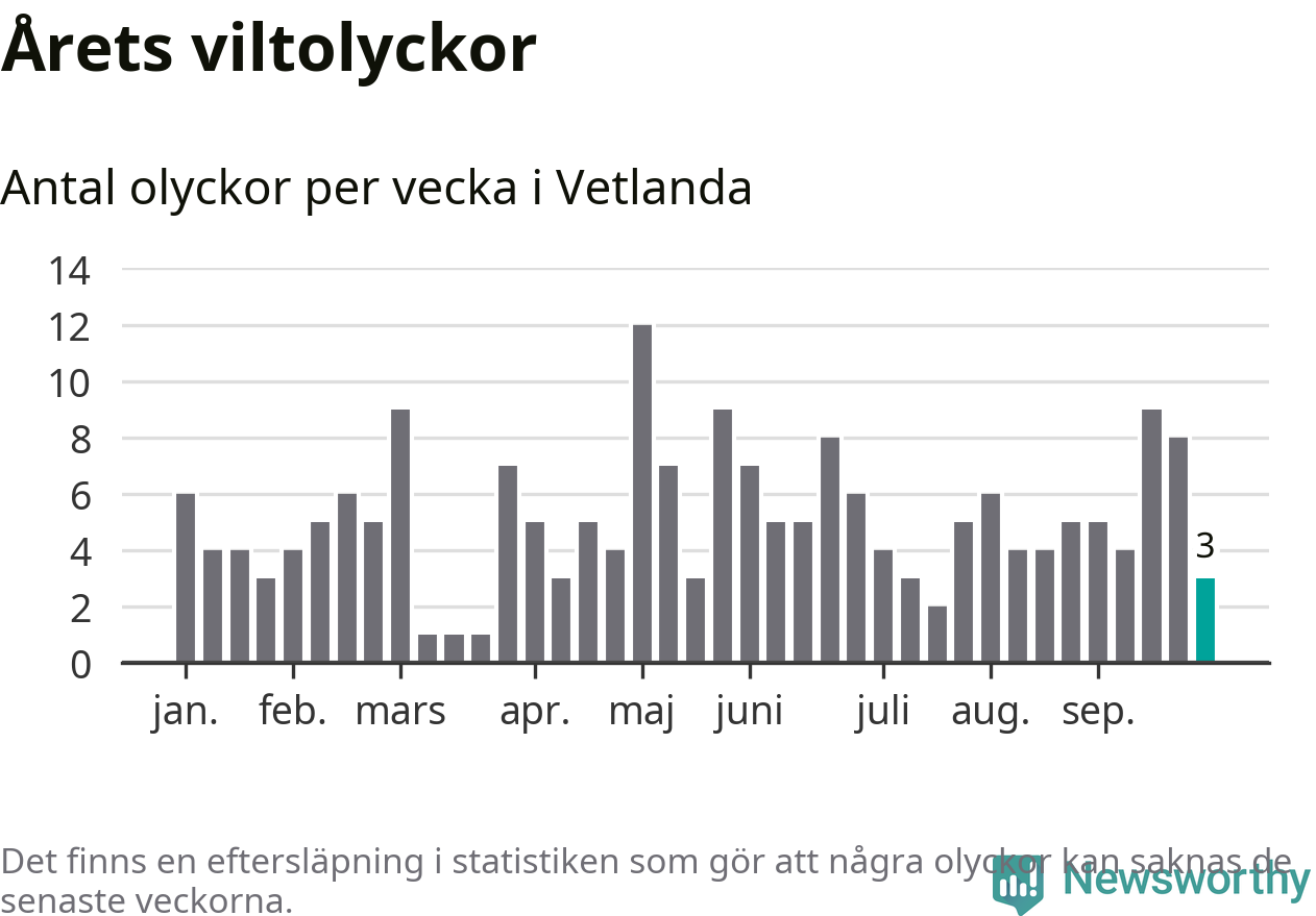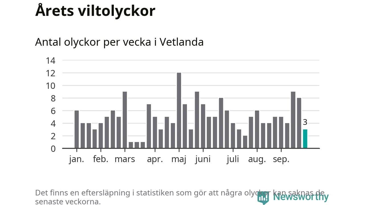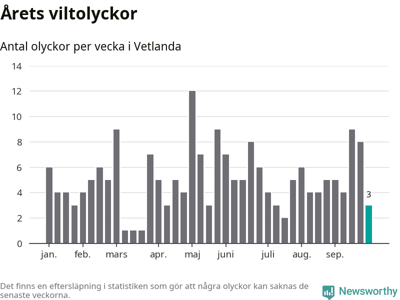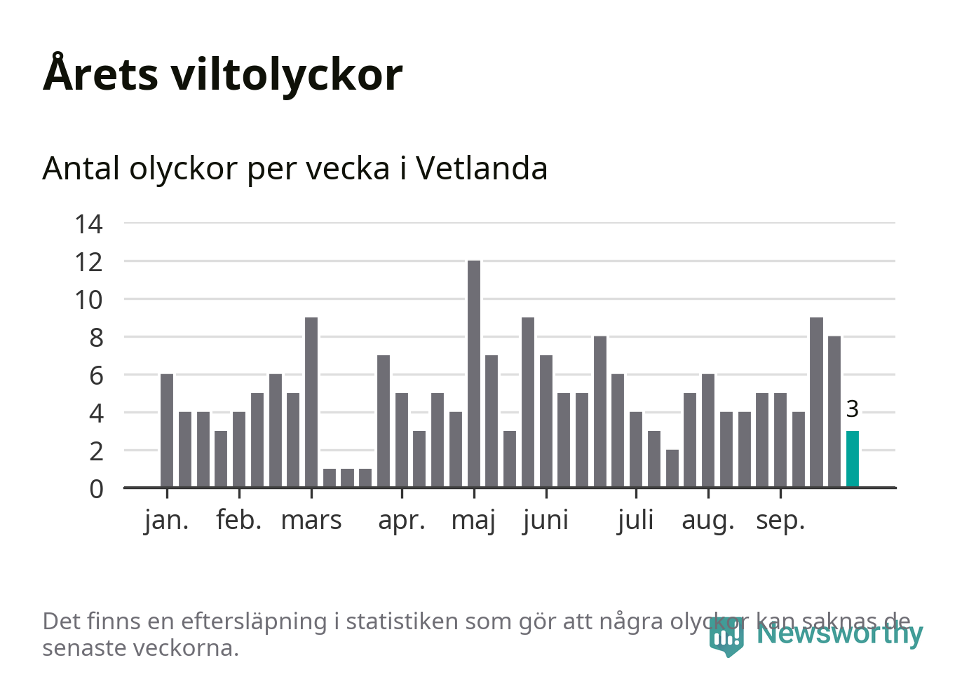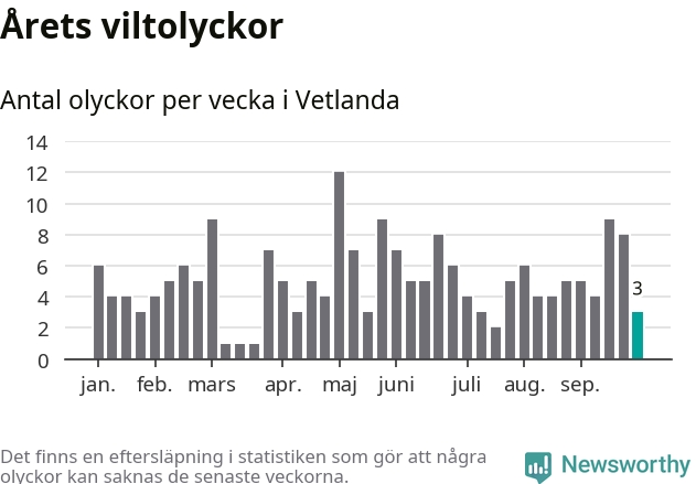 Totalt det här året har det inträffat 203 viltolyckor i kommunen. Det är mindre än genomsnittet för motsvarande period (omkring 264) de senaste tio åren.