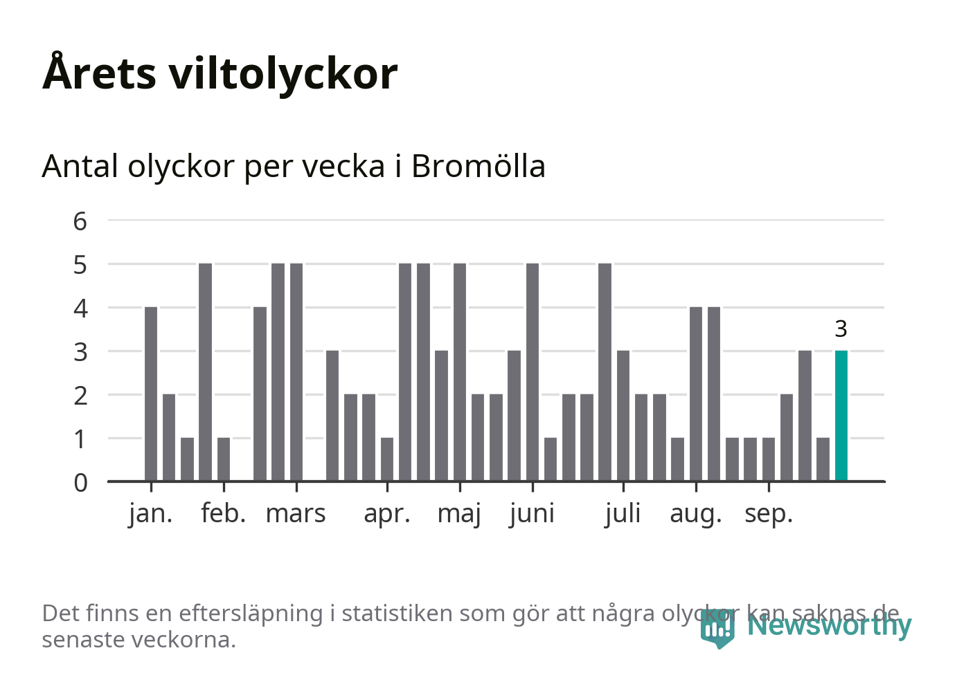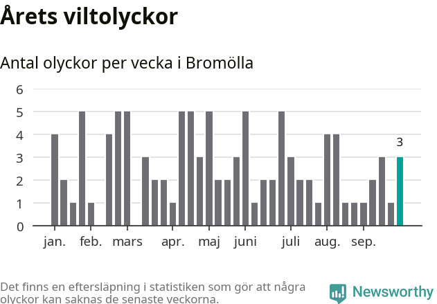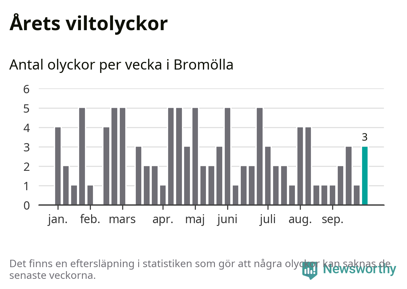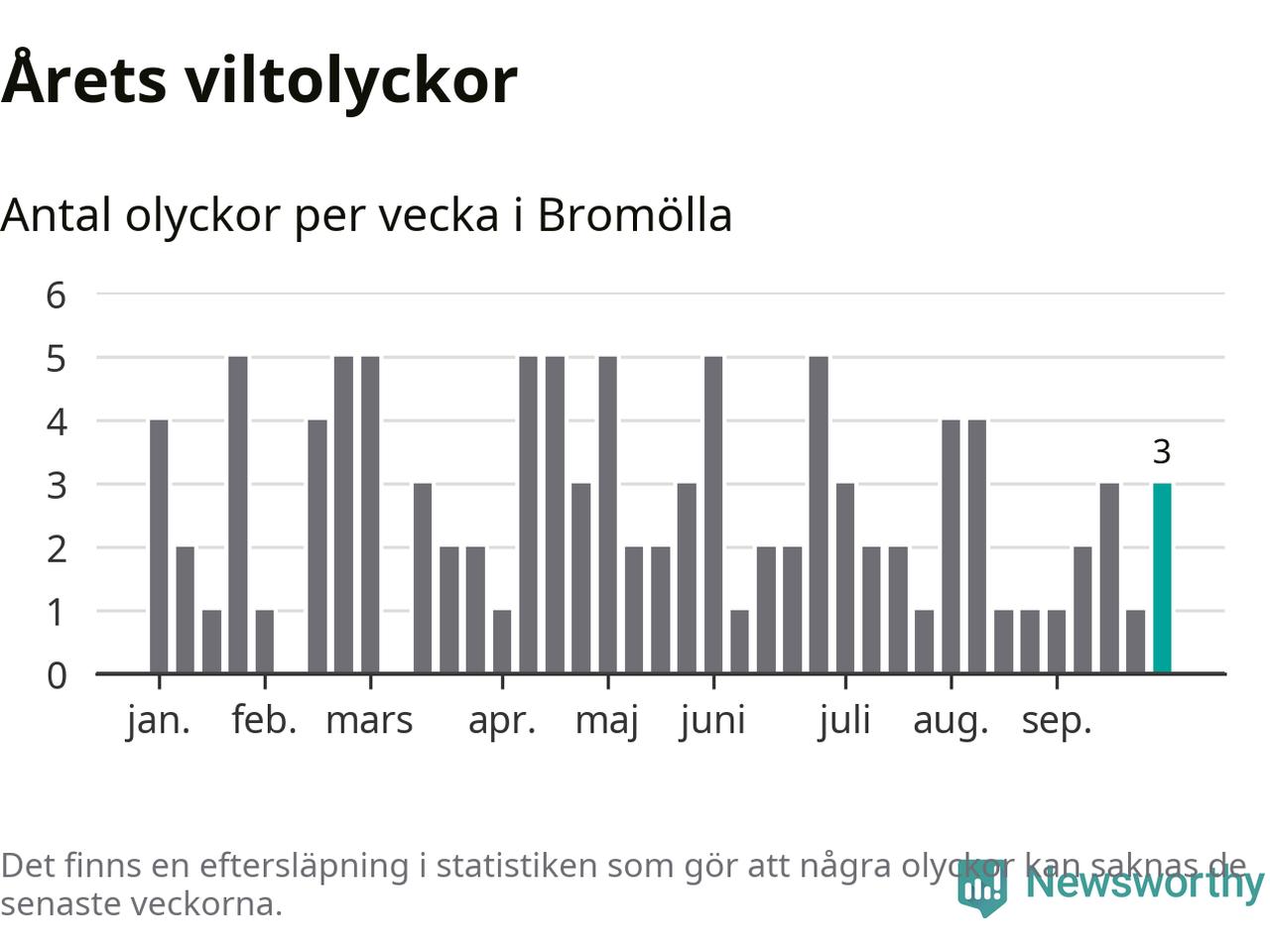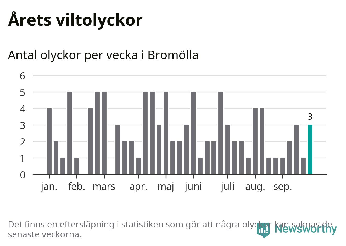 Hittills har tre viltolyckor rapporterats in i Bromölla kommun från vecka 40. Se listan här.