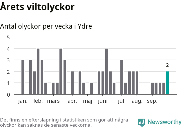 Hittills har två viltolyckor rapporterats in i Ydre kommun från vecka 40. Se listan här.