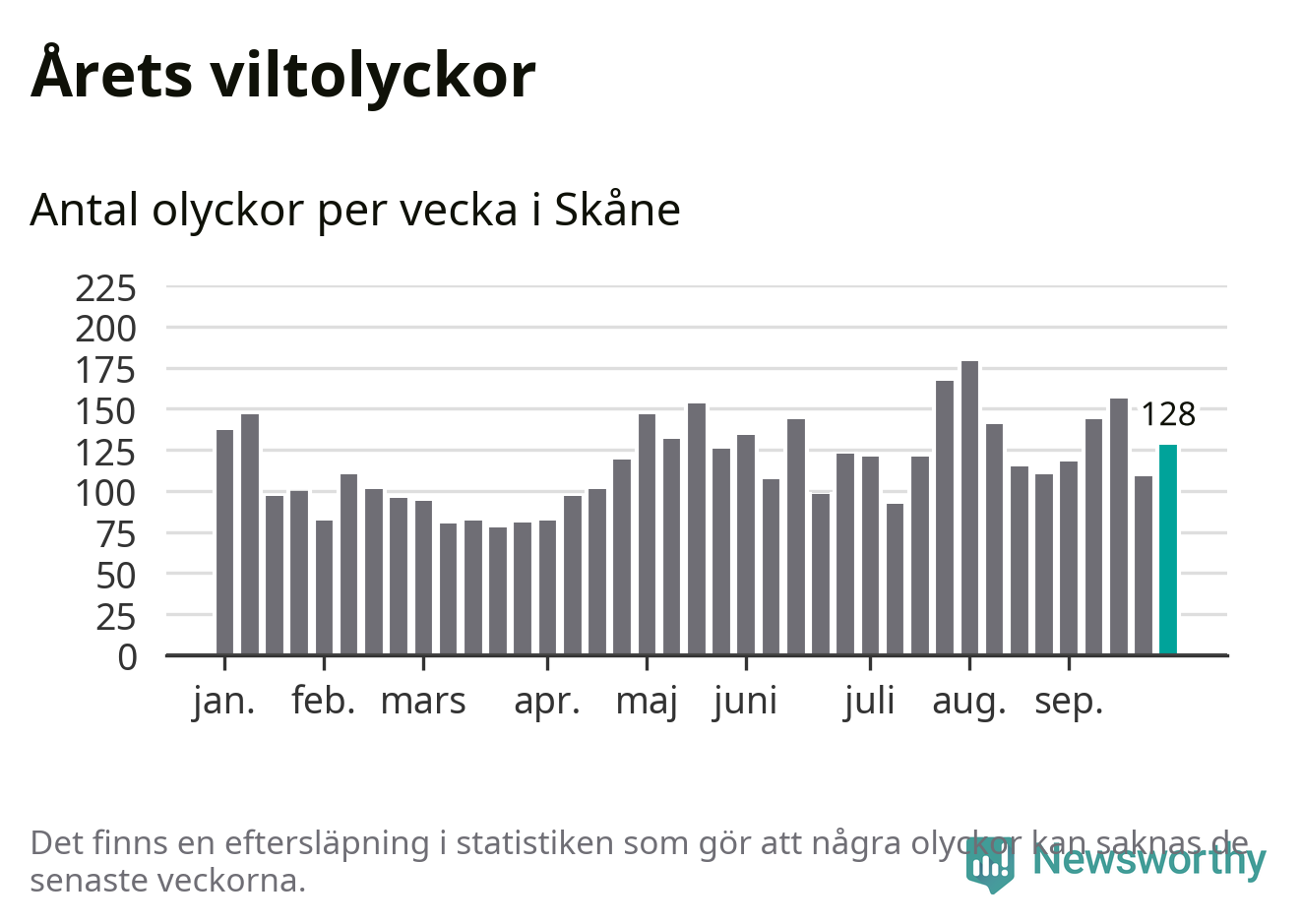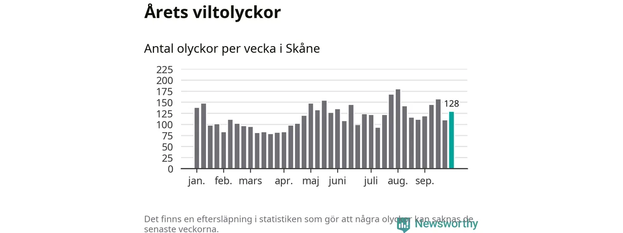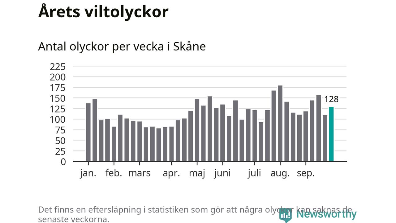 Hittills har 128 viltolyckor rapporterats in i Skåne län från vecka 40. Se listan här.