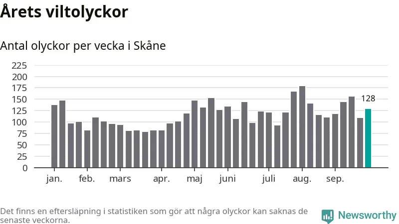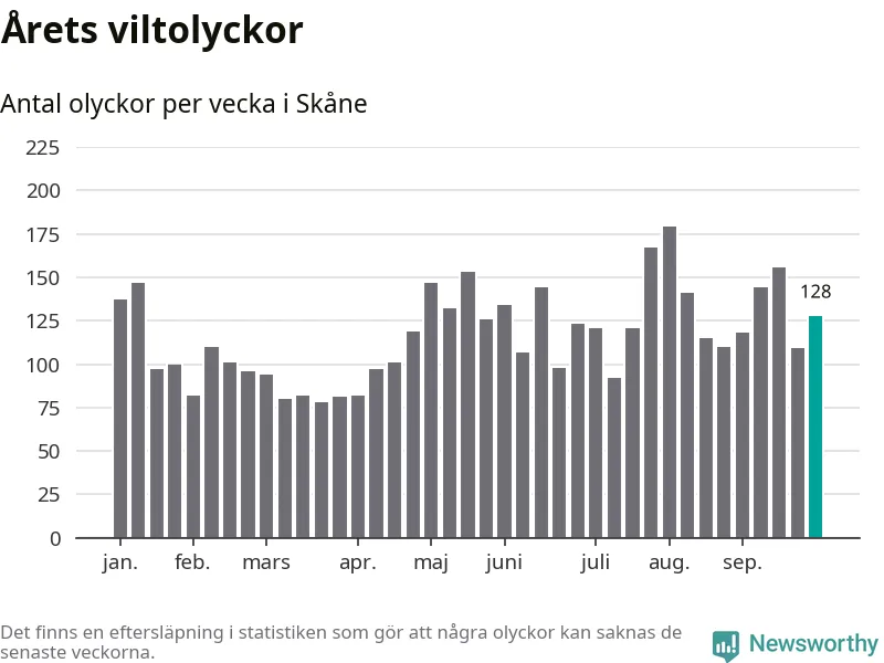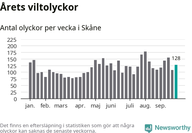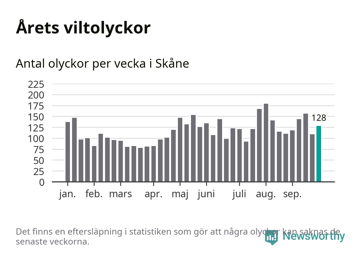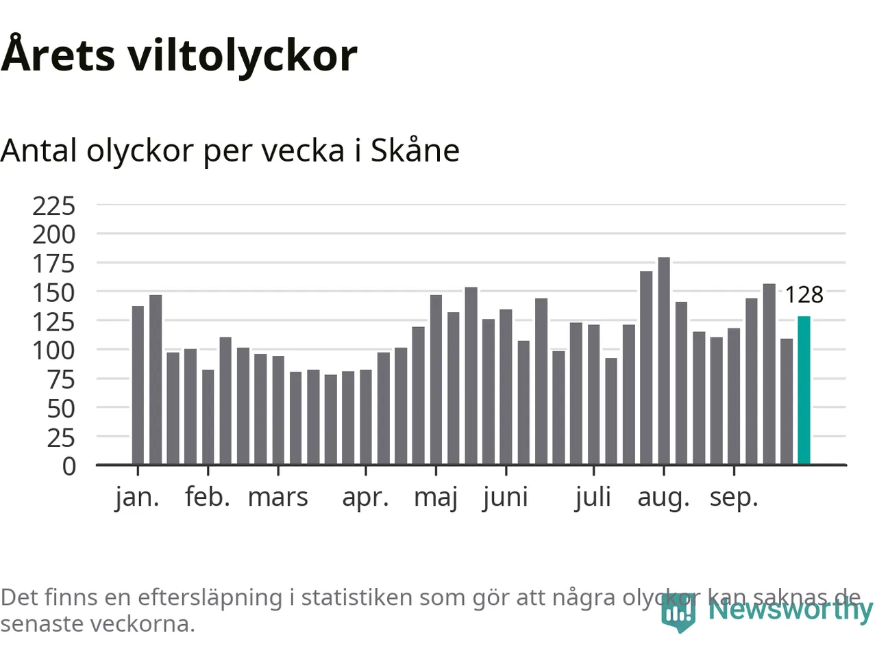 Hittills har 128 viltolyckor rapporterats in i Skåne län från vecka 40. Se listan här.