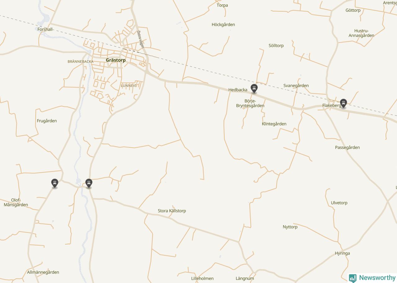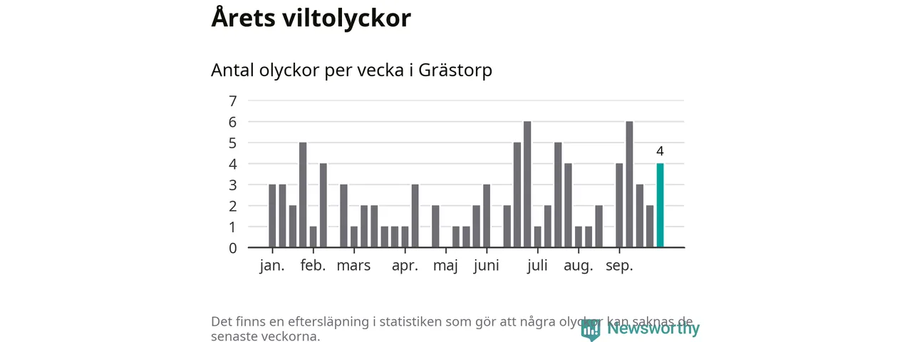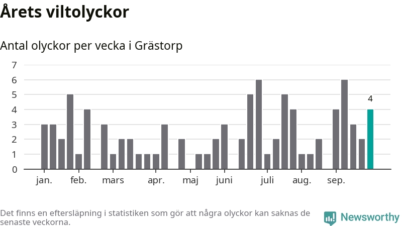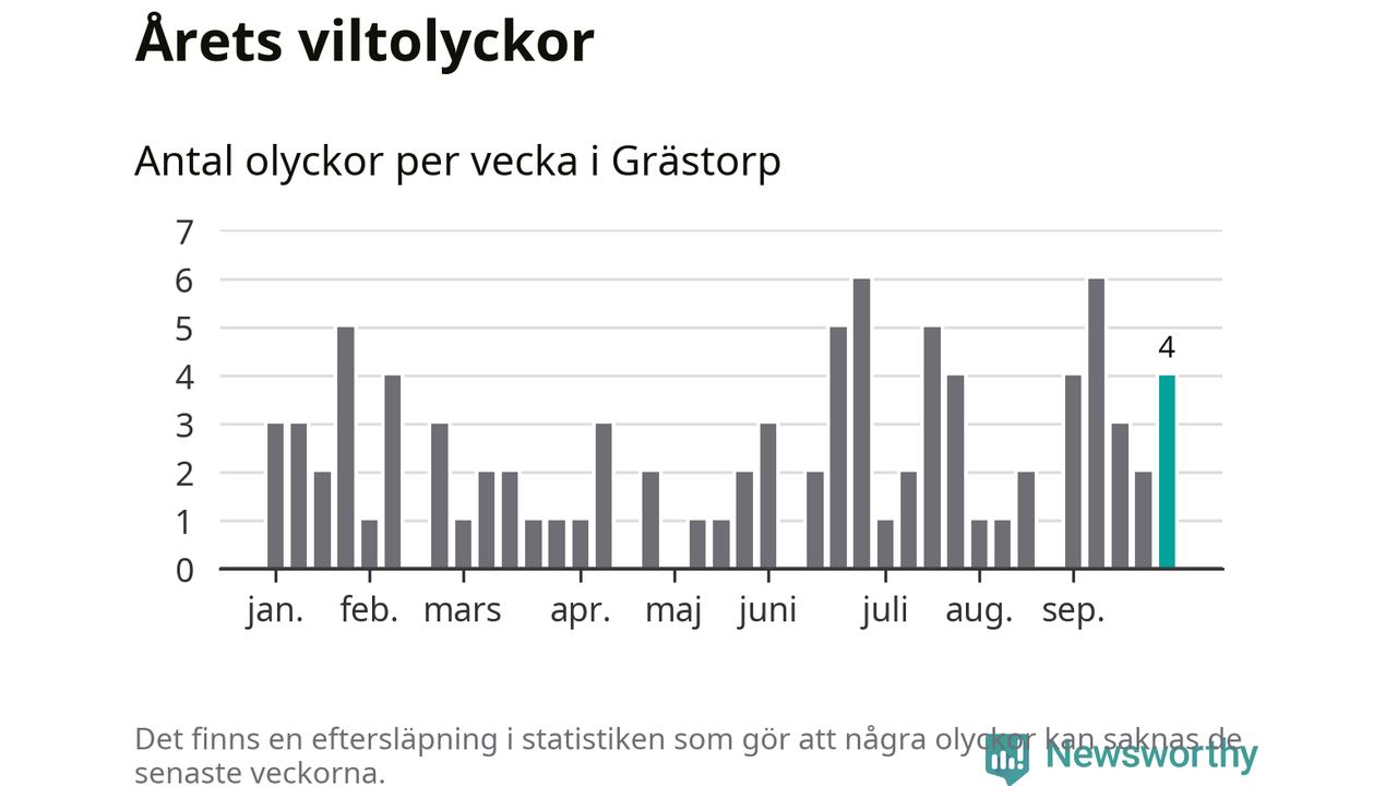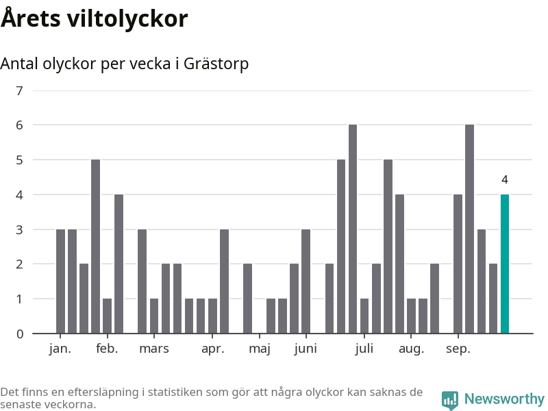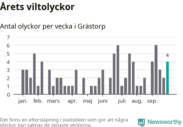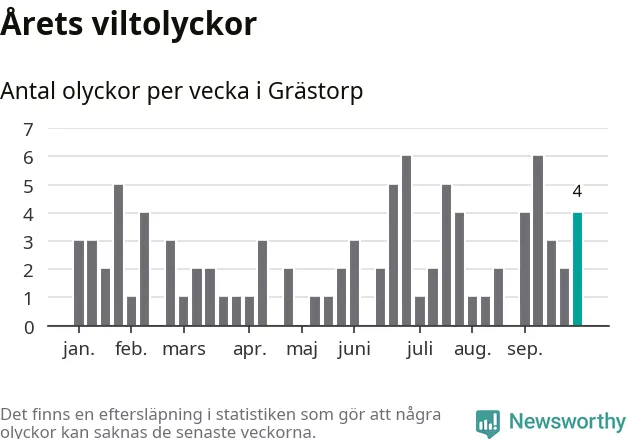 Hittills har fyra viltolyckor rapporterats in i Grästorps kommun från vecka 40. Se listan här.