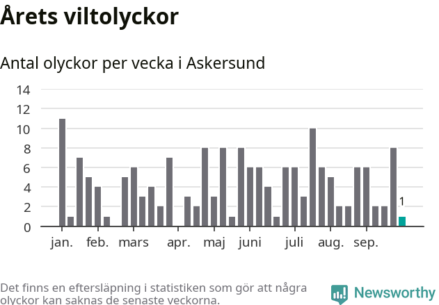 Från förra veckan (vecka 40) har hittills en viltolycka rapporterats in i Askersunds kommun.