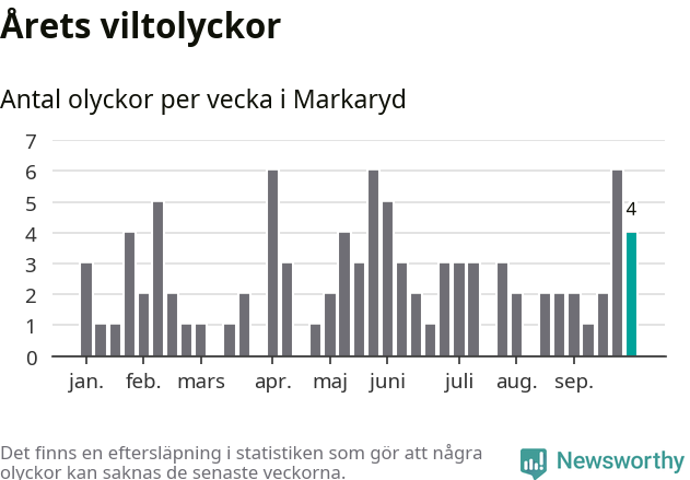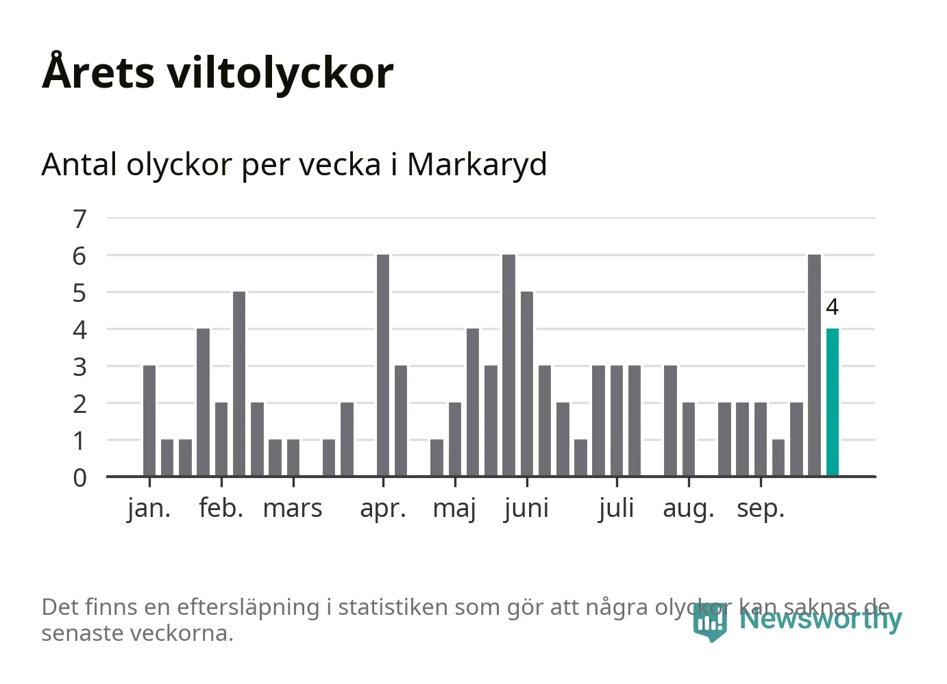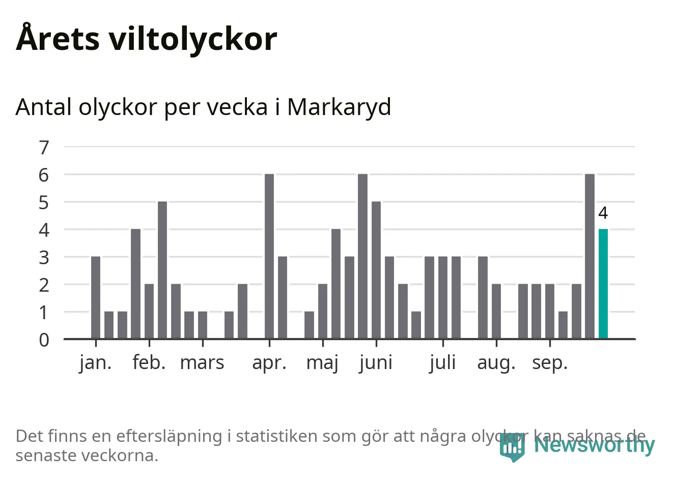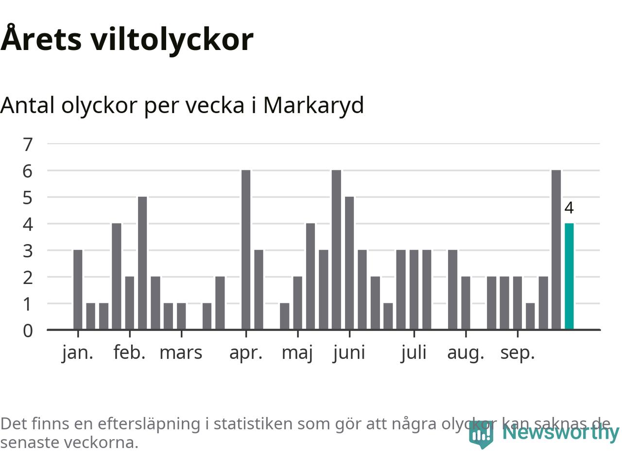 Hittills har fyra viltolyckor rapporterats in i Markaryds kommun från vecka 40. Se listan här.