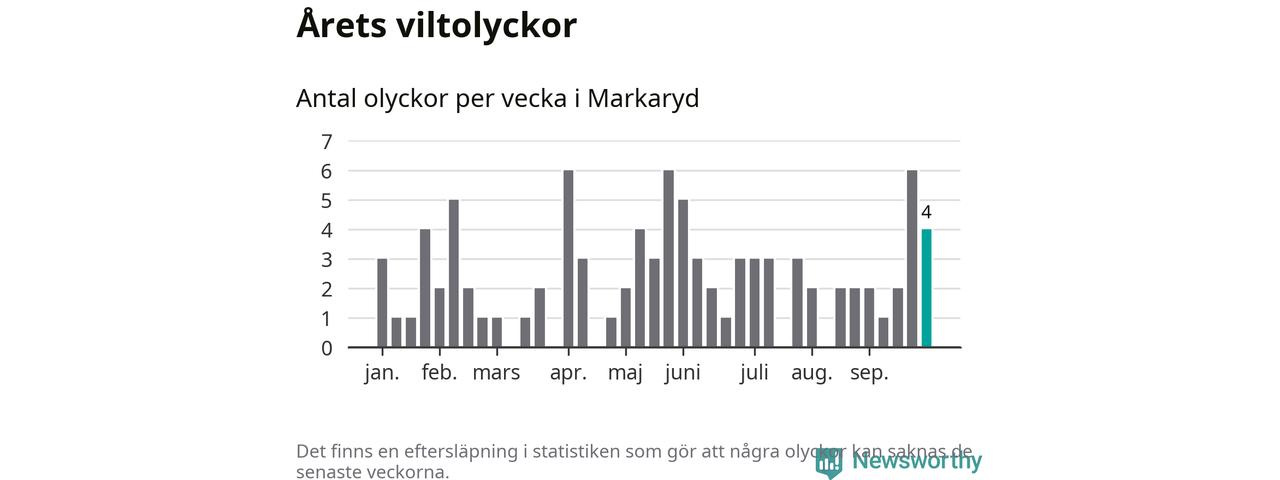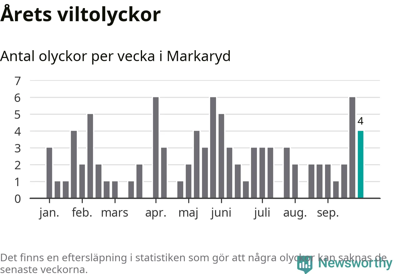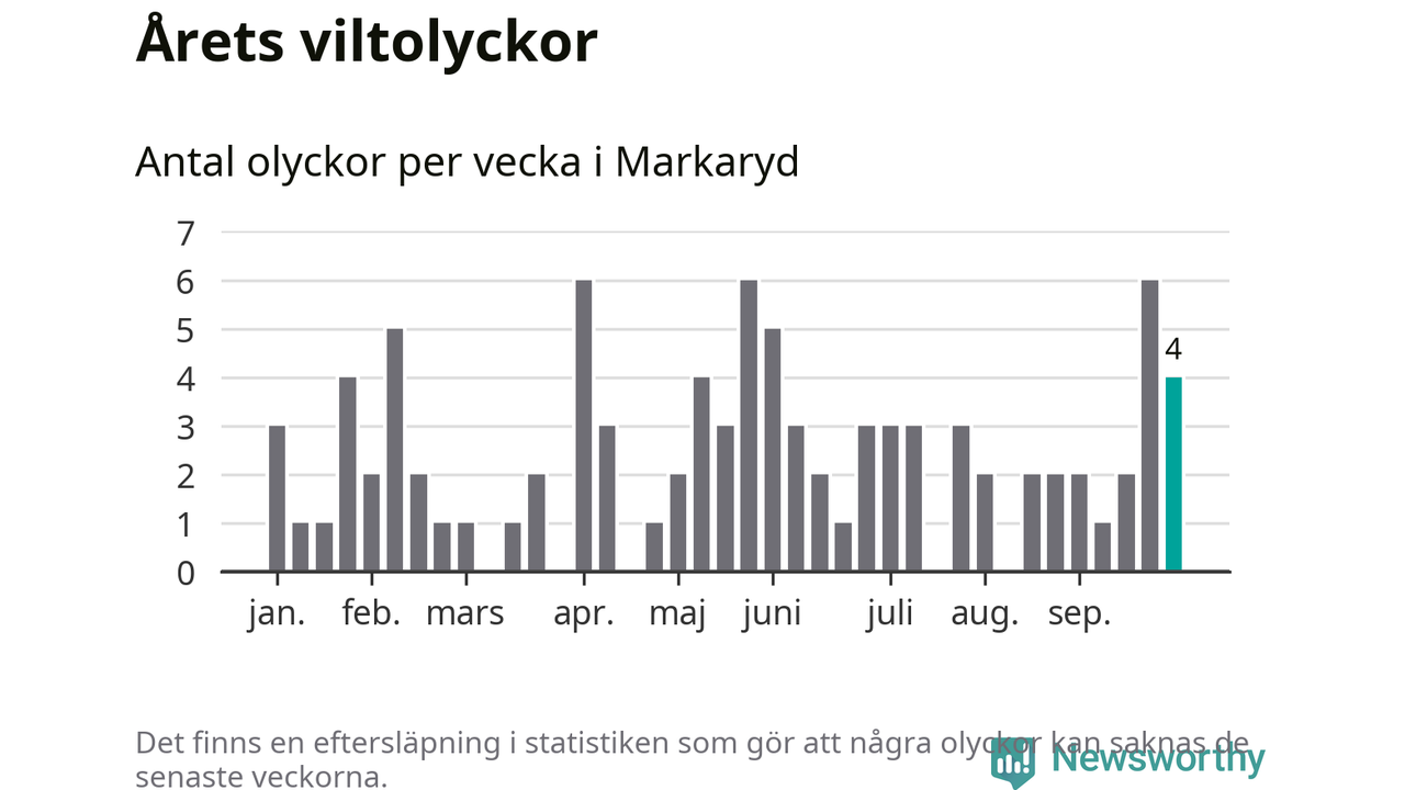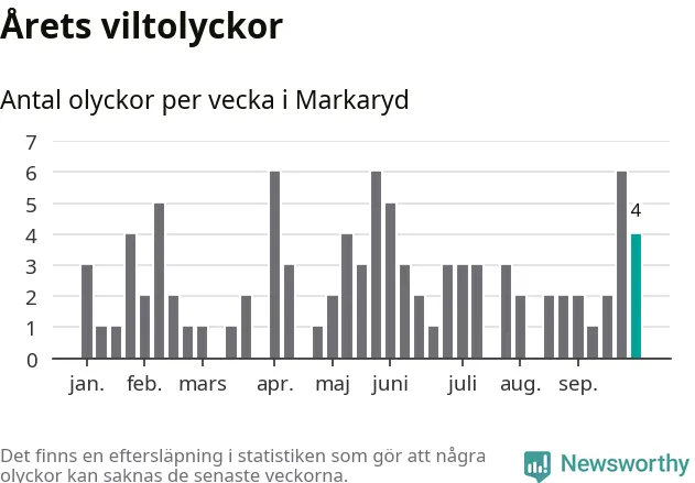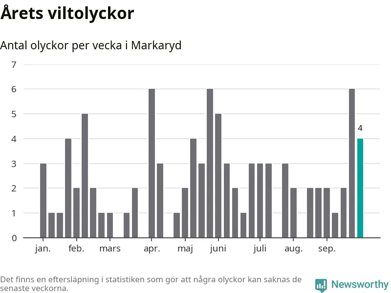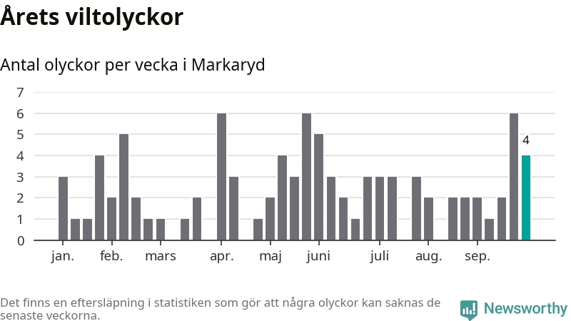 Hittills har fyra viltolyckor rapporterats in i Markaryds kommun från vecka 40. Se listan här.