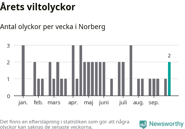 Hittills har två viltolyckor rapporterats in i Norbergs kommun från vecka 40. Se listan här.