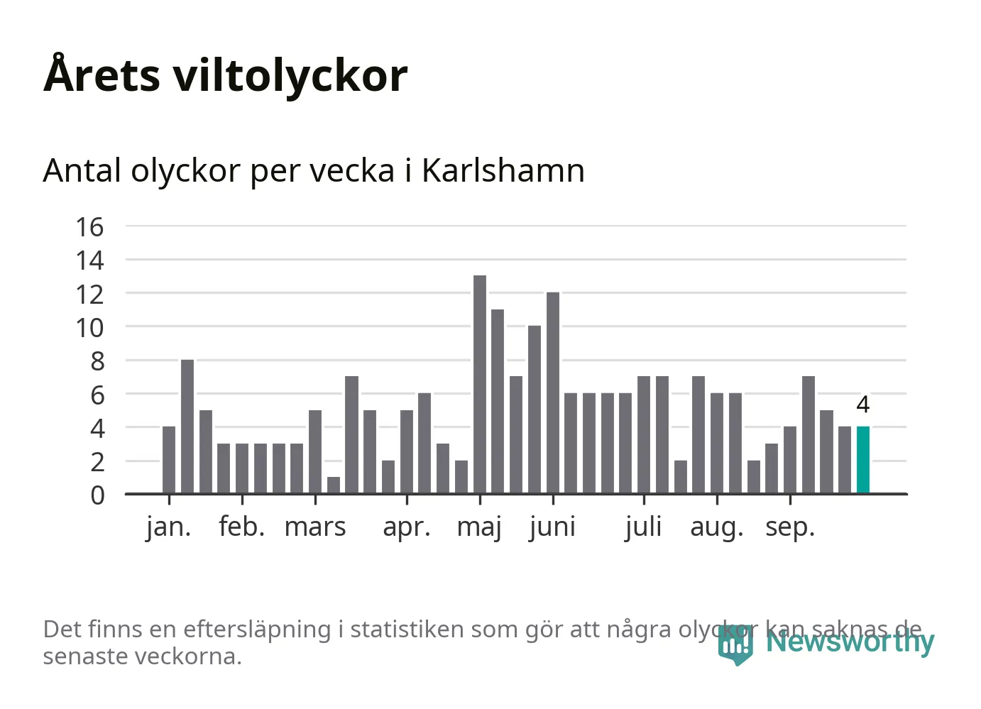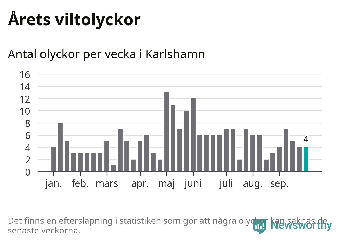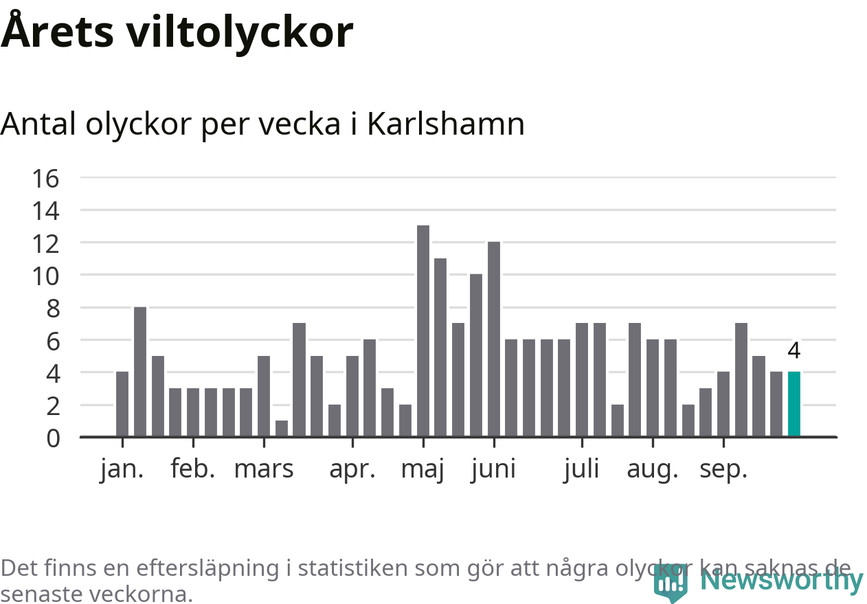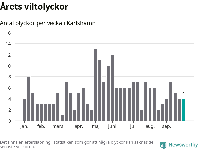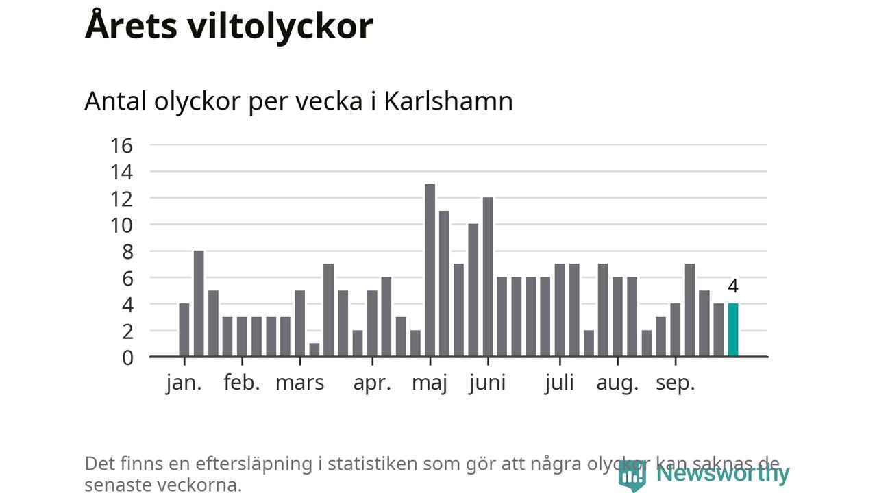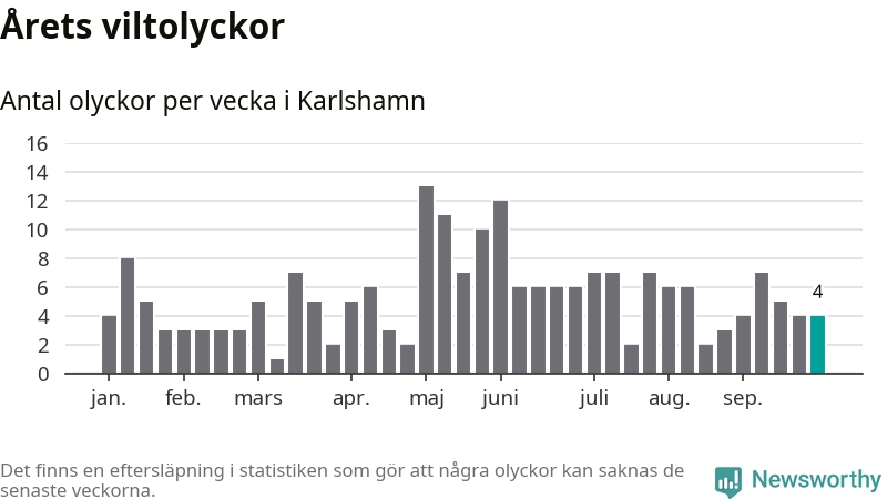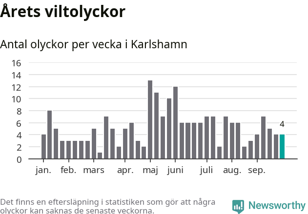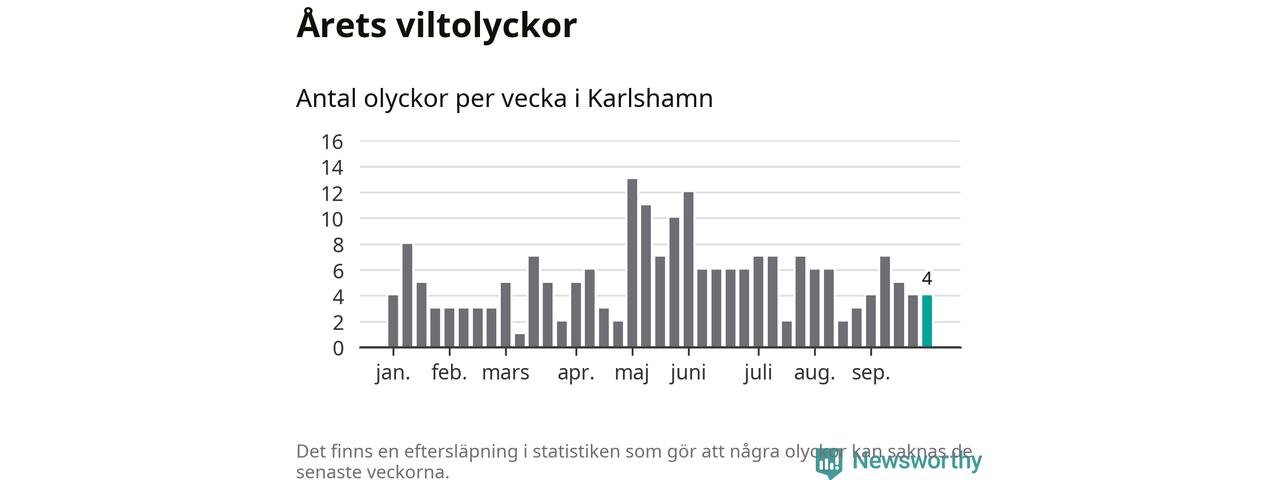 Hittills har fyra viltolyckor rapporterats in i Karlshamns kommun från vecka 40. Se listan här.