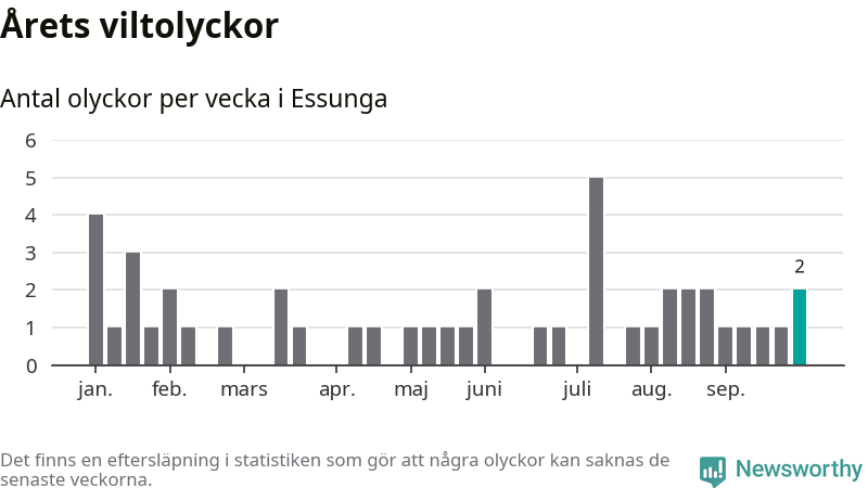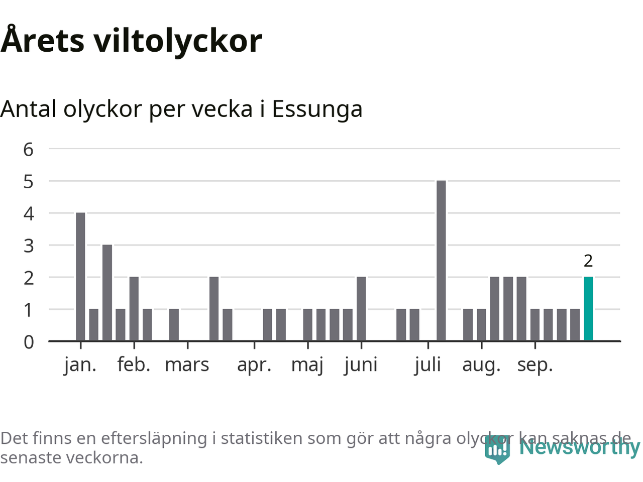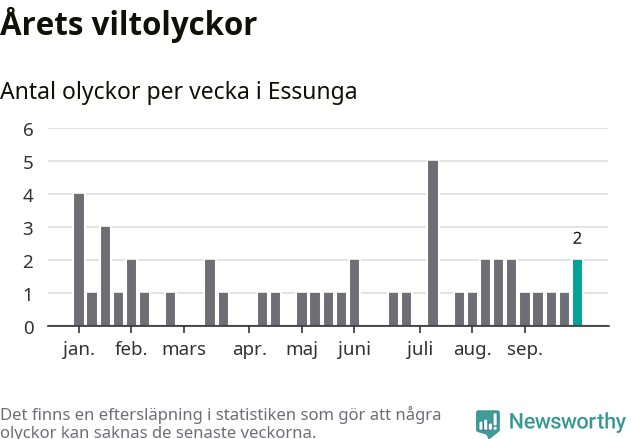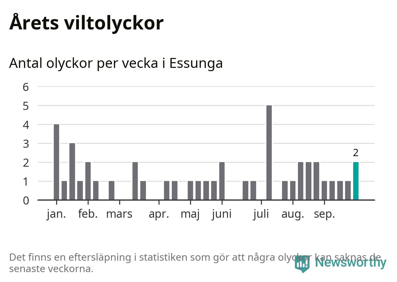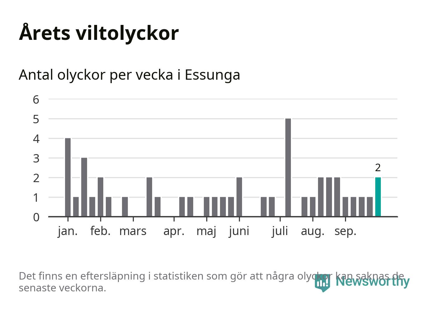 Hittills har två viltolyckor rapporterats in i Essunga kommun från vecka 40. Se listan här.