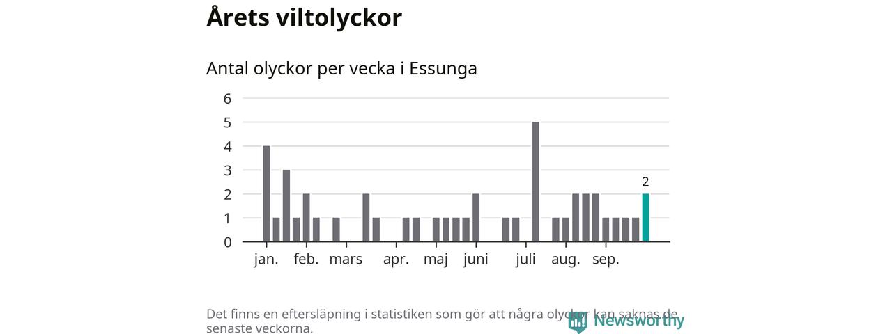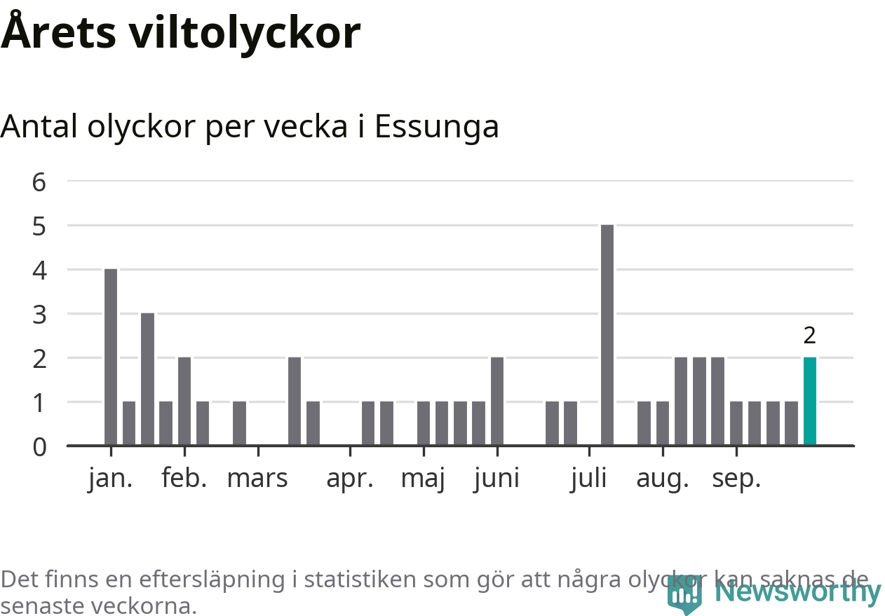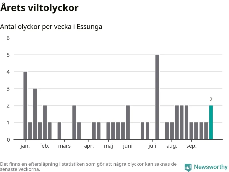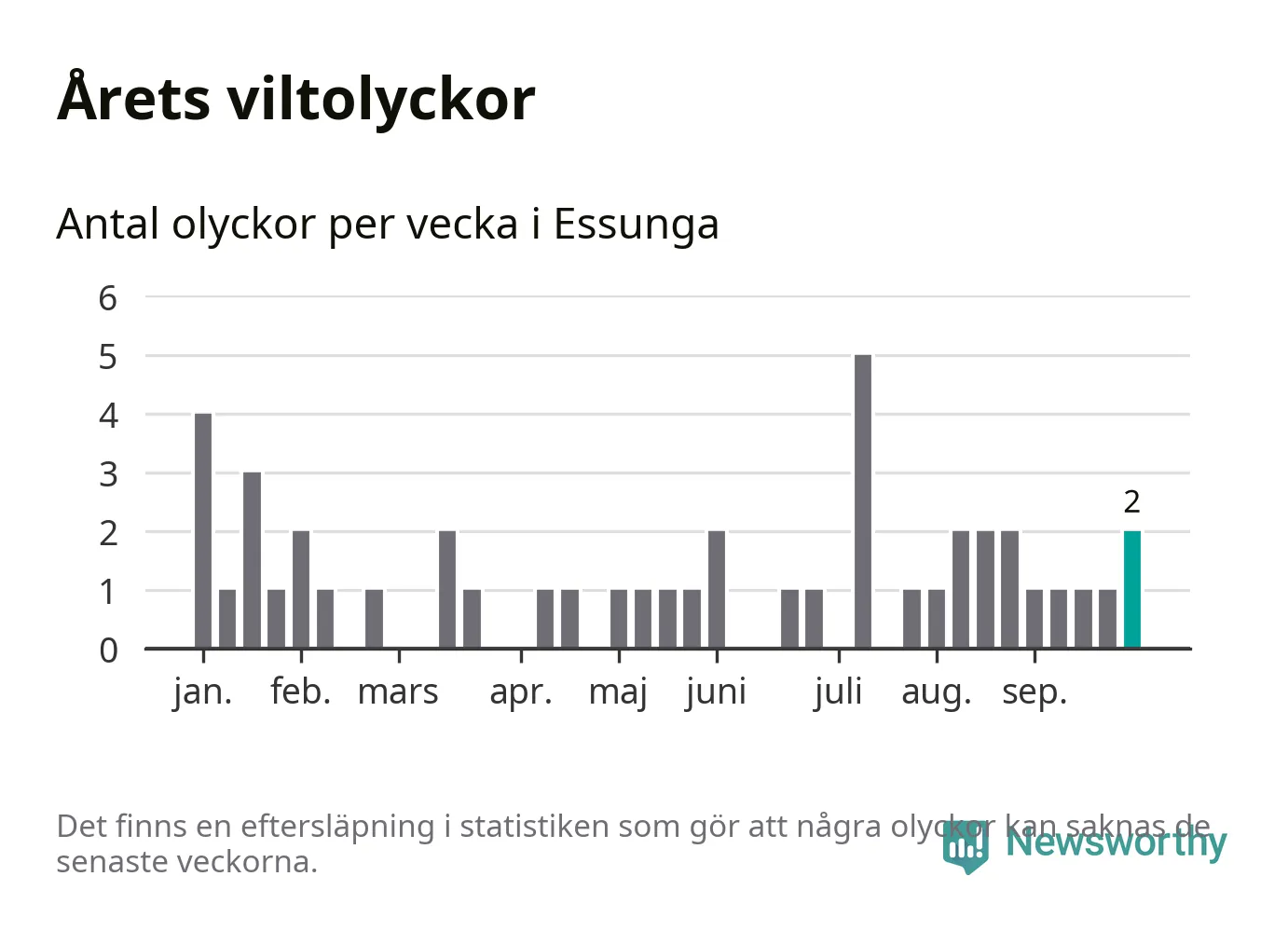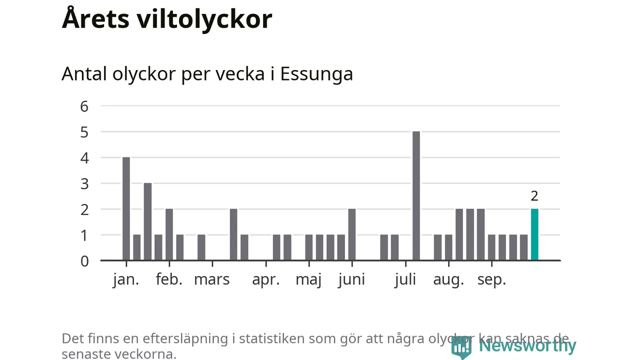 Hittills har två viltolyckor rapporterats in i Essunga kommun från vecka 40. Se listan här.