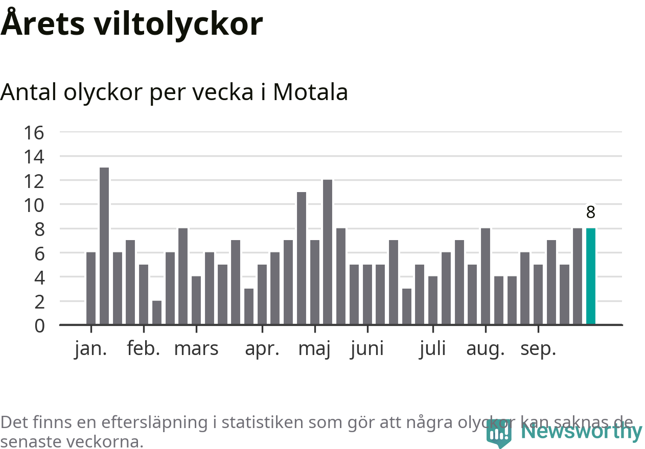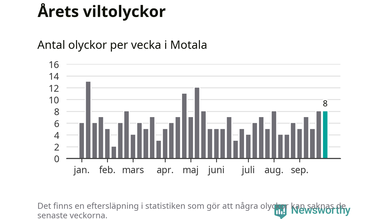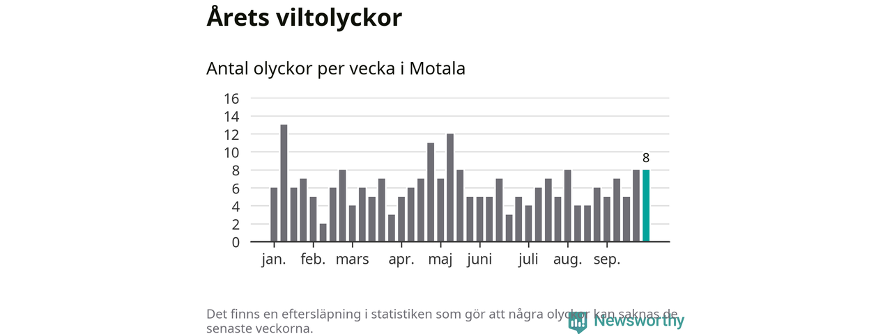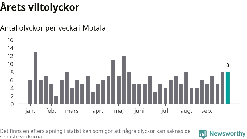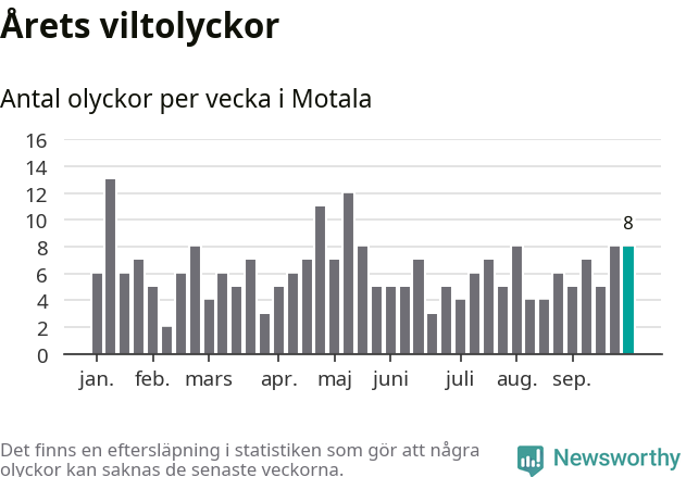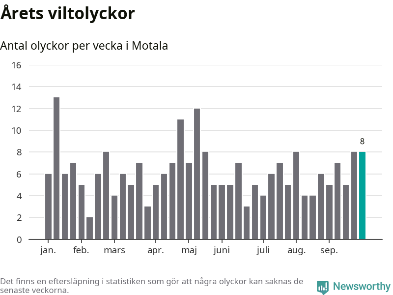 Hittills har åtta viltolyckor rapporterats in i Motala kommun från vecka 40. Se listan här.