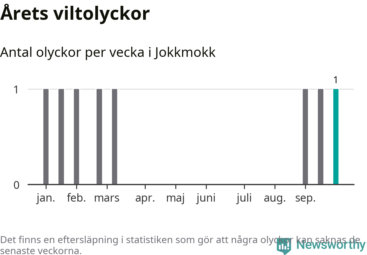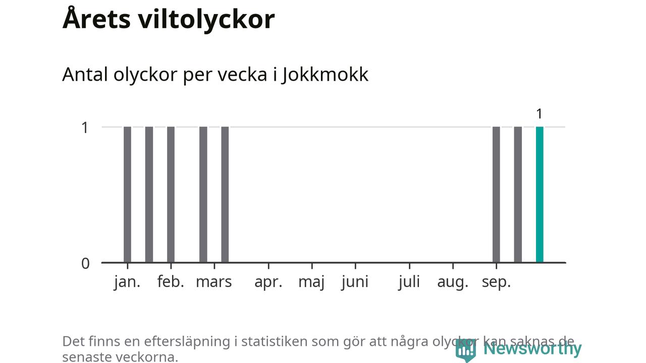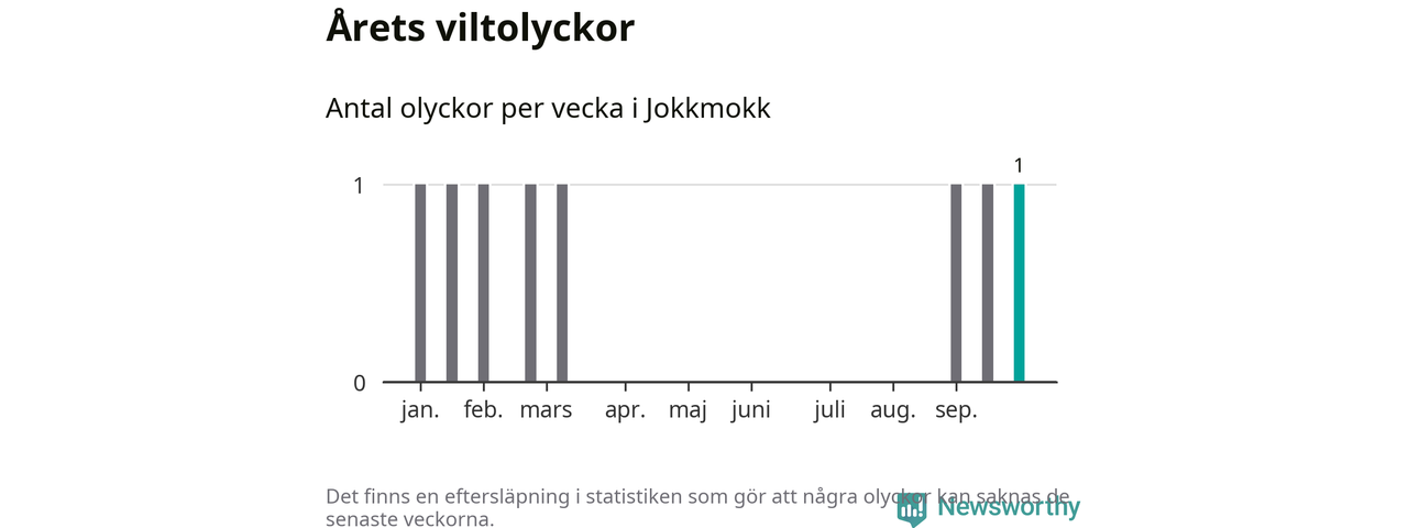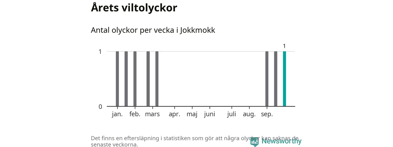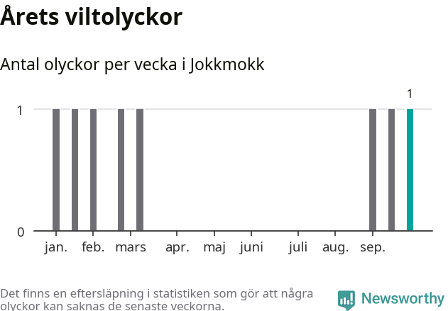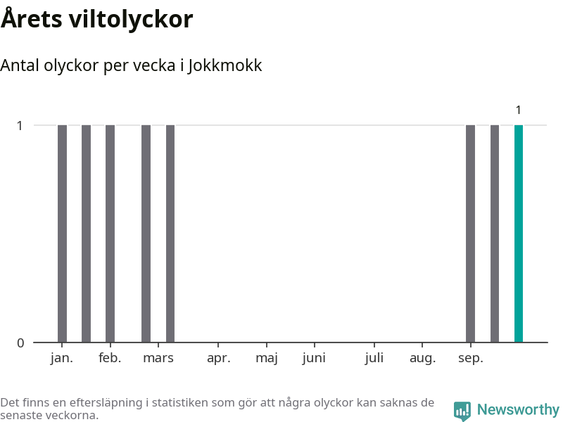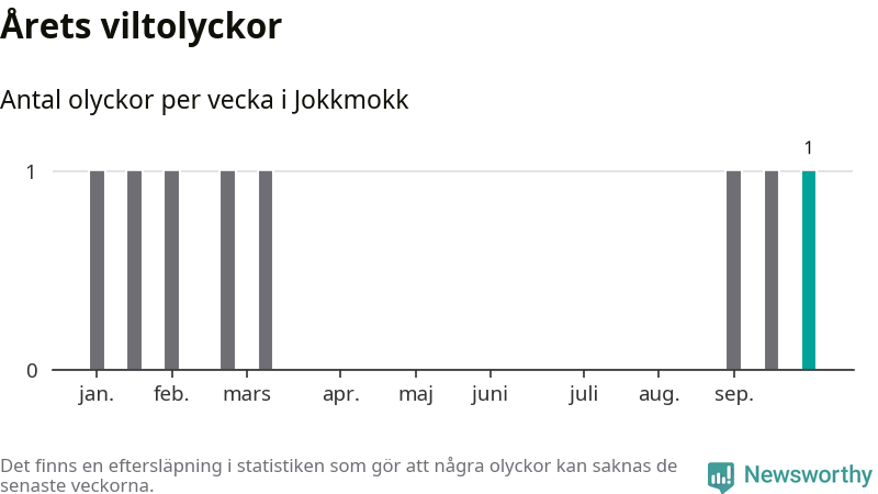Från förra veckan (vecka 40) har hittills en viltolycka rapporterats in i Jokkmokks kommun.