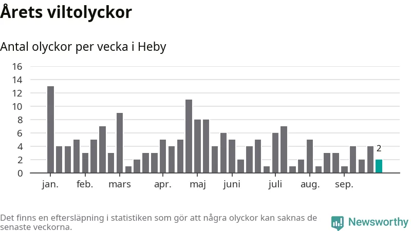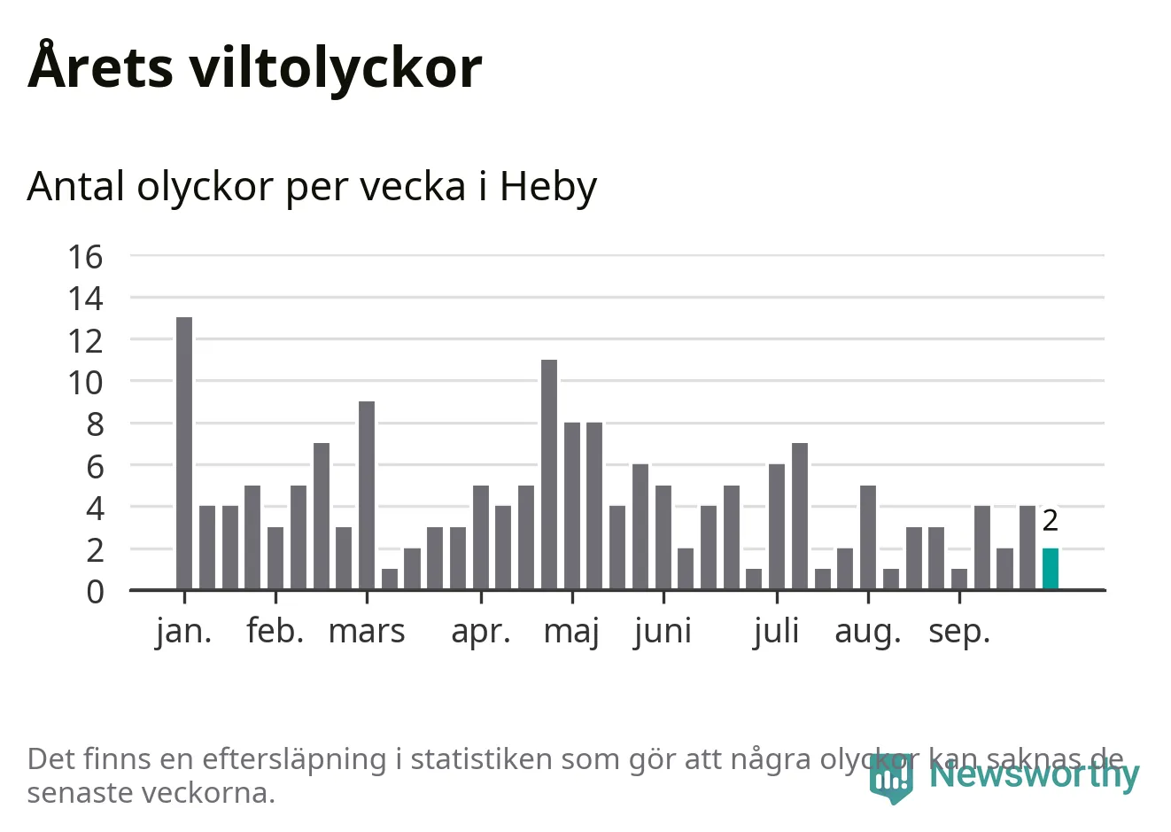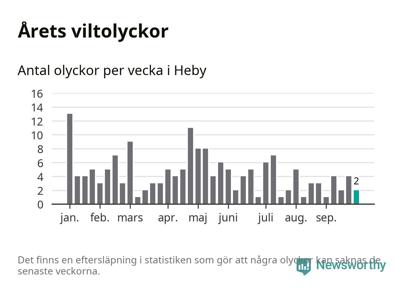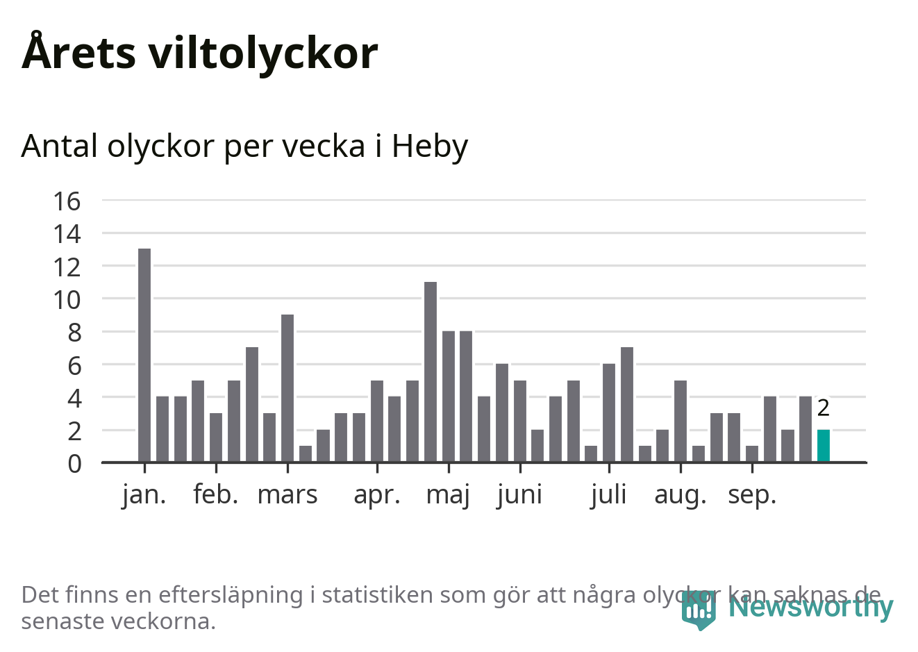 Hittills har två viltolyckor rapporterats in i Heby kommun från vecka 40. Se listan här.