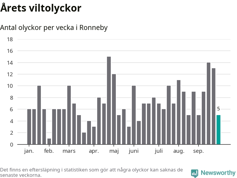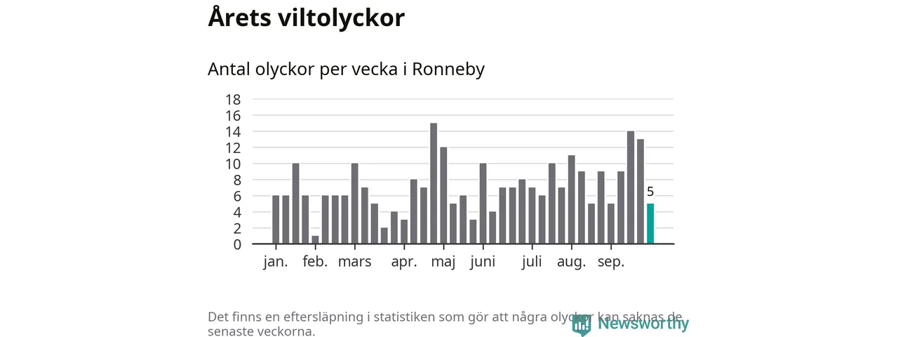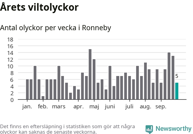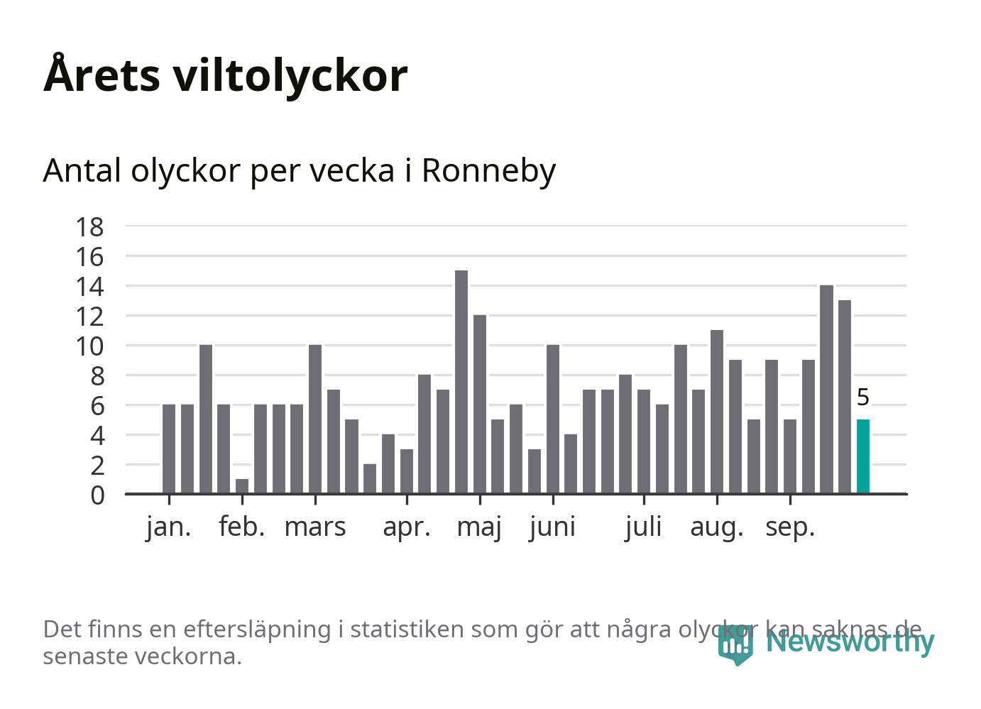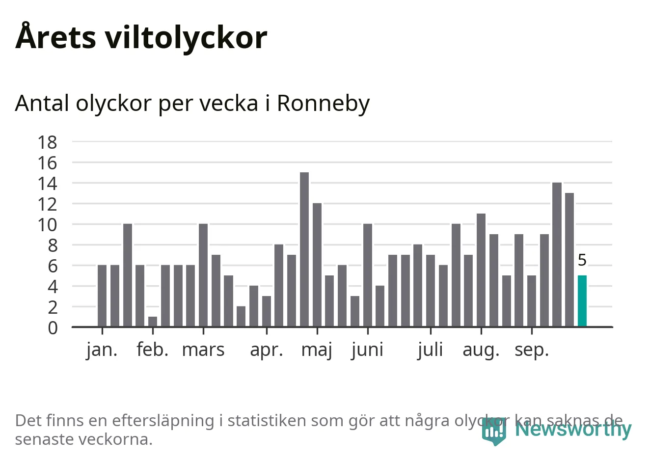 Hittills har fem viltolyckor rapporterats in i Ronneby kommun från vecka 40. Se listan här.
