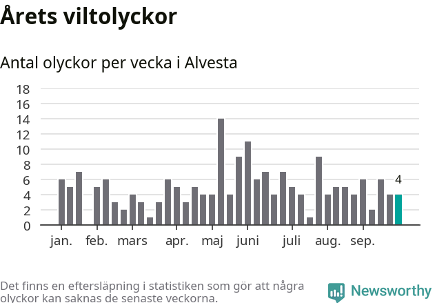 Hittills har fyra viltolyckor rapporterats in i Alvesta kommun från vecka 40. Se listan här.