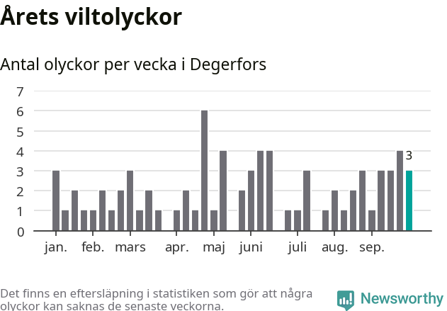 Hittills har tre viltolyckor rapporterats in i Degerfors kommun från vecka 40. Se listan här.