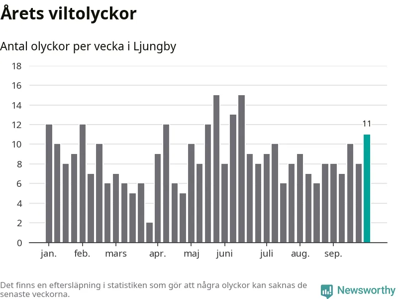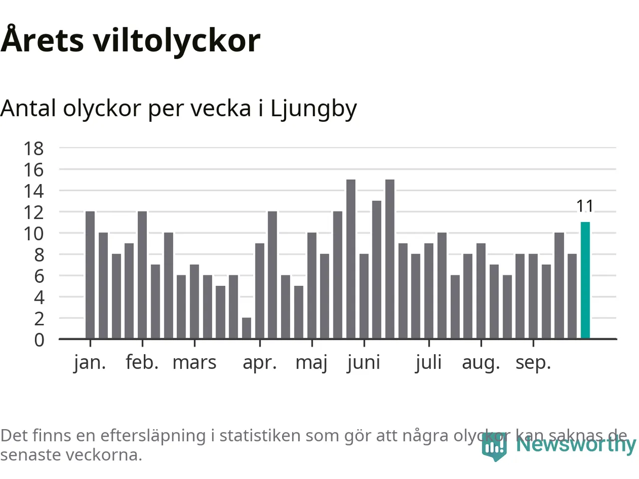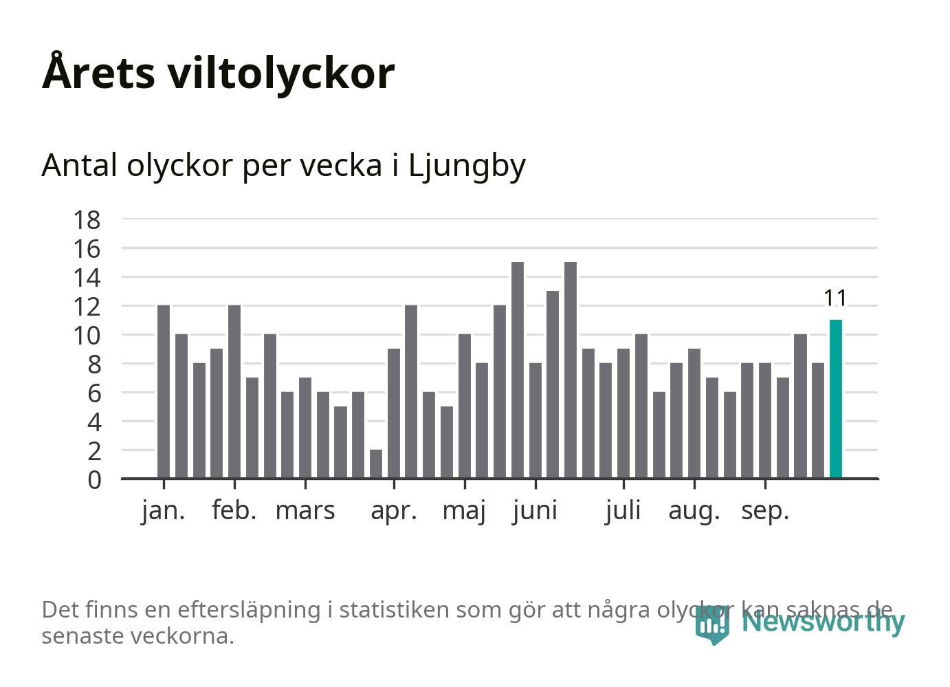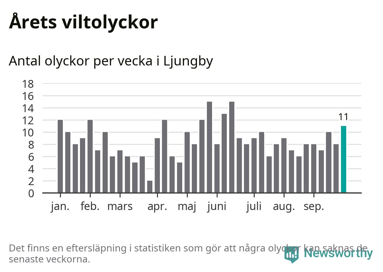 Hittills har elva viltolyckor rapporterats in i Ljungby kommun från vecka 40. Se listan här.