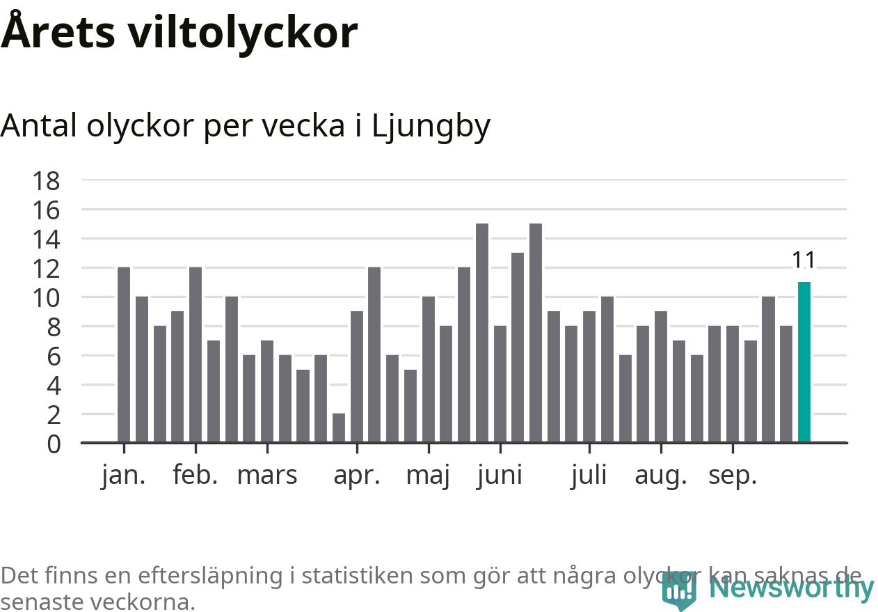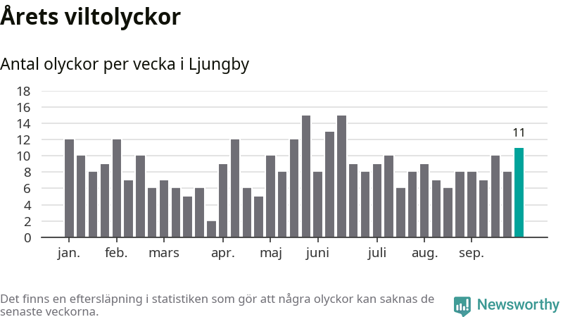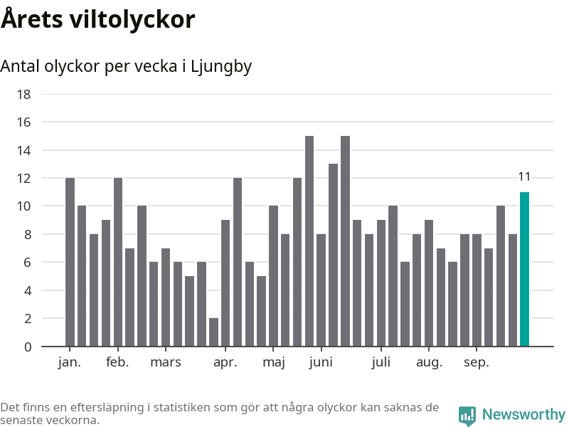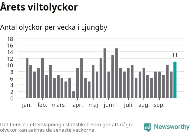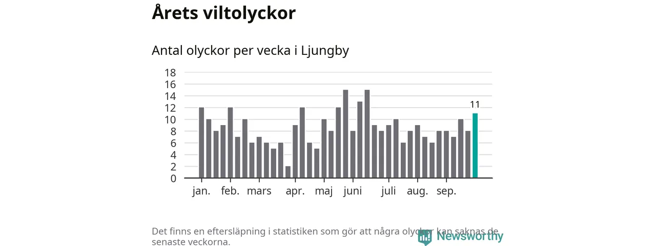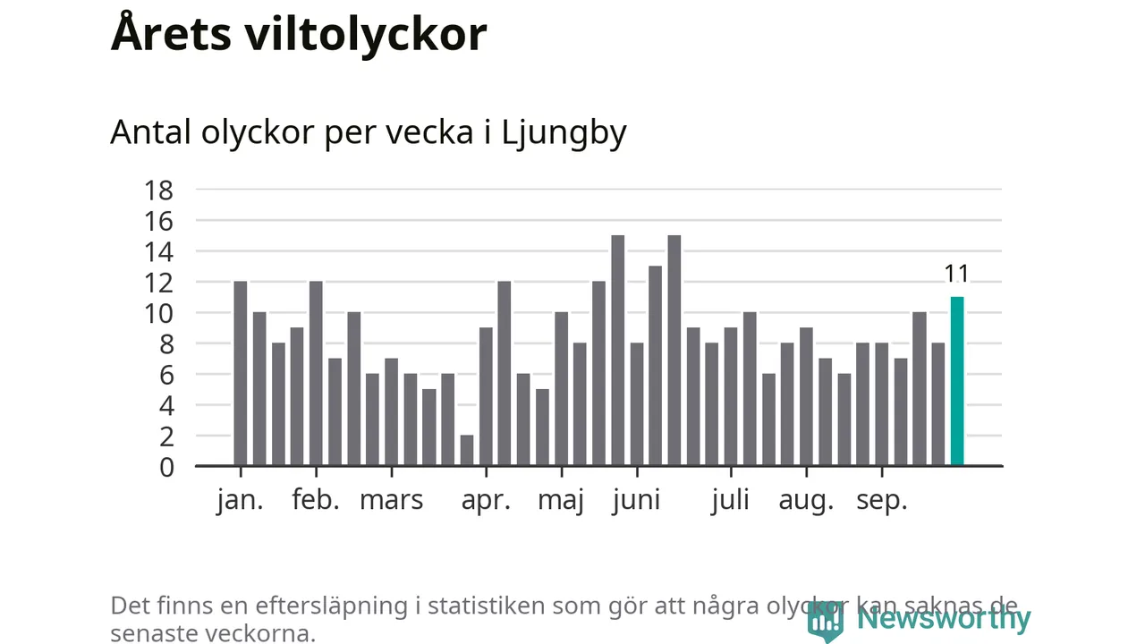 Hittills har elva viltolyckor rapporterats in i Ljungby kommun från vecka 40. Se listan här.