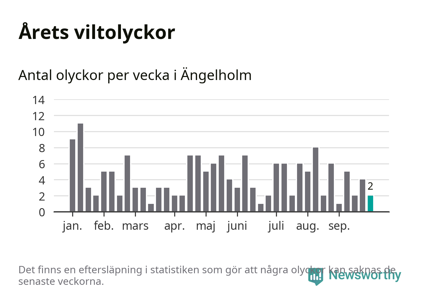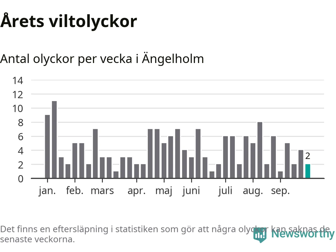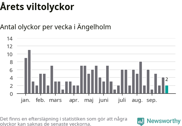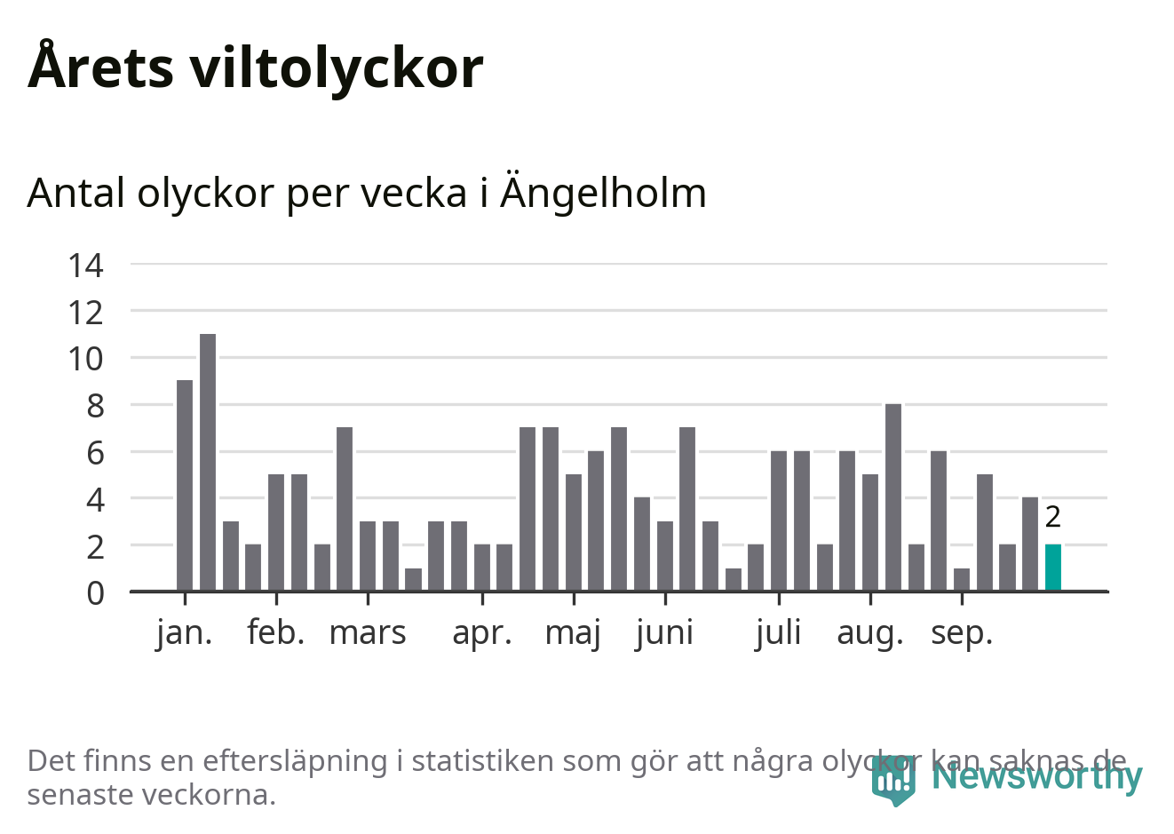 Hittills har två viltolyckor rapporterats in i Ängelholms kommun från vecka 40. Se listan här.